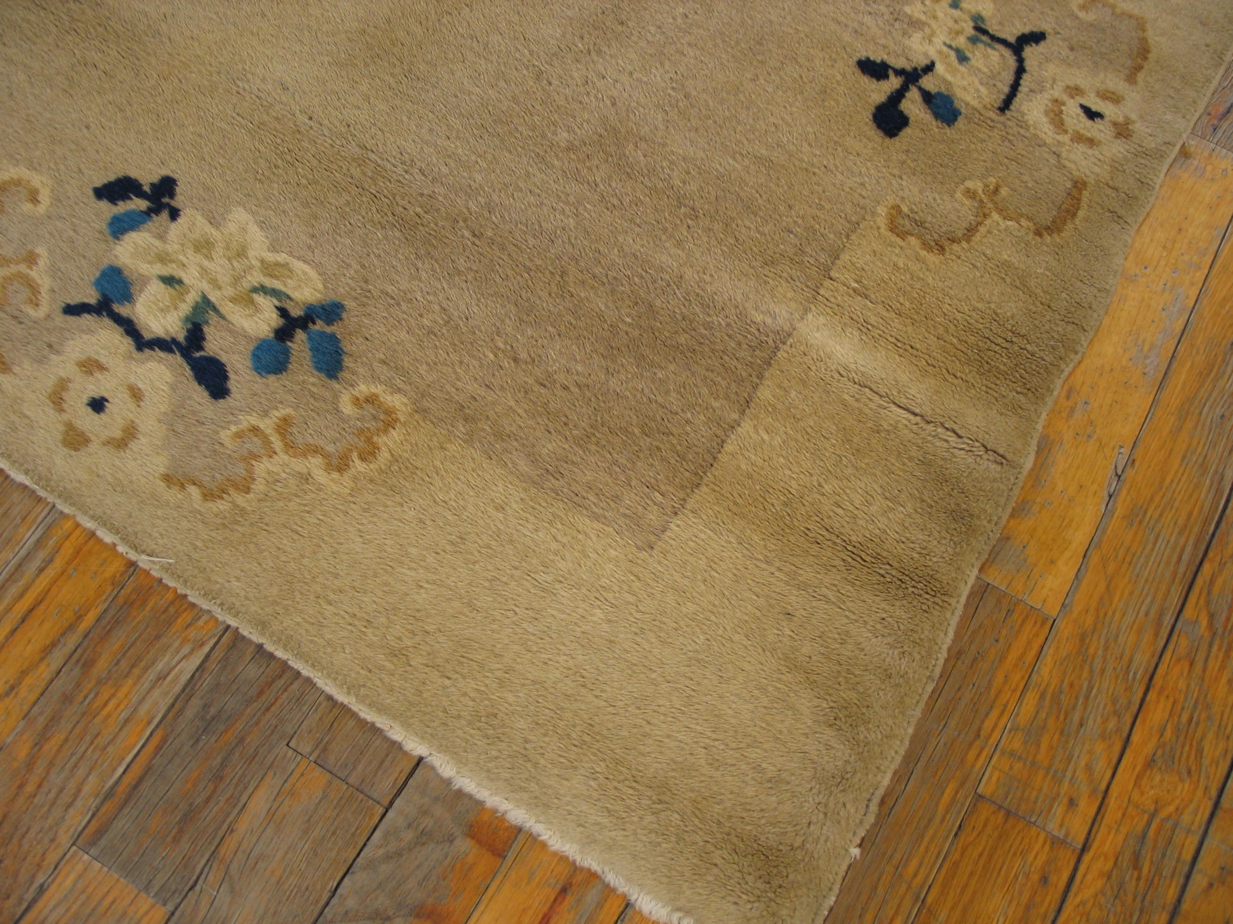 Antique Peking Chinese Floral Ivory 1930s Rug, Circa Date: 1930s. This exquisite piece represents the height of Chinese Art Deco weaving, a period highly sought after in the market for antique rugs. The Peking workshops of the 1930s masterfully blended traditional floral motifs with a modern, minimalist aesthetic, resulting in a design that is both historically rich and visually serene.