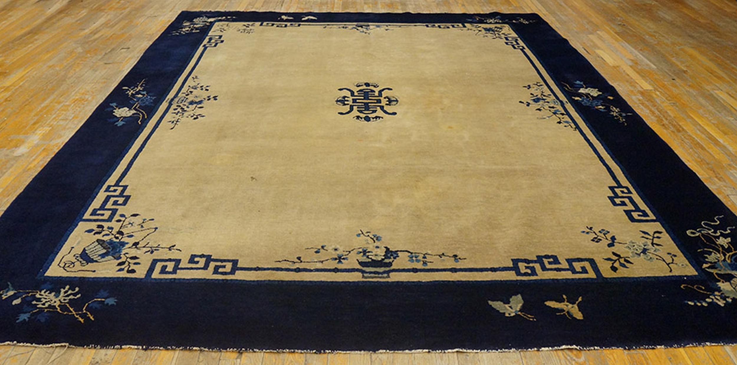 The field is anchored by a stylized central medallion, likely the Shou character symbolizing longevity, rendered in a deep, saturated tone. The interplay between the pale gold ground and the navy border highlights the sophisticated use of limited color palettes common in Peking weaving, contrasting sharply with the later Art Deco excesses.