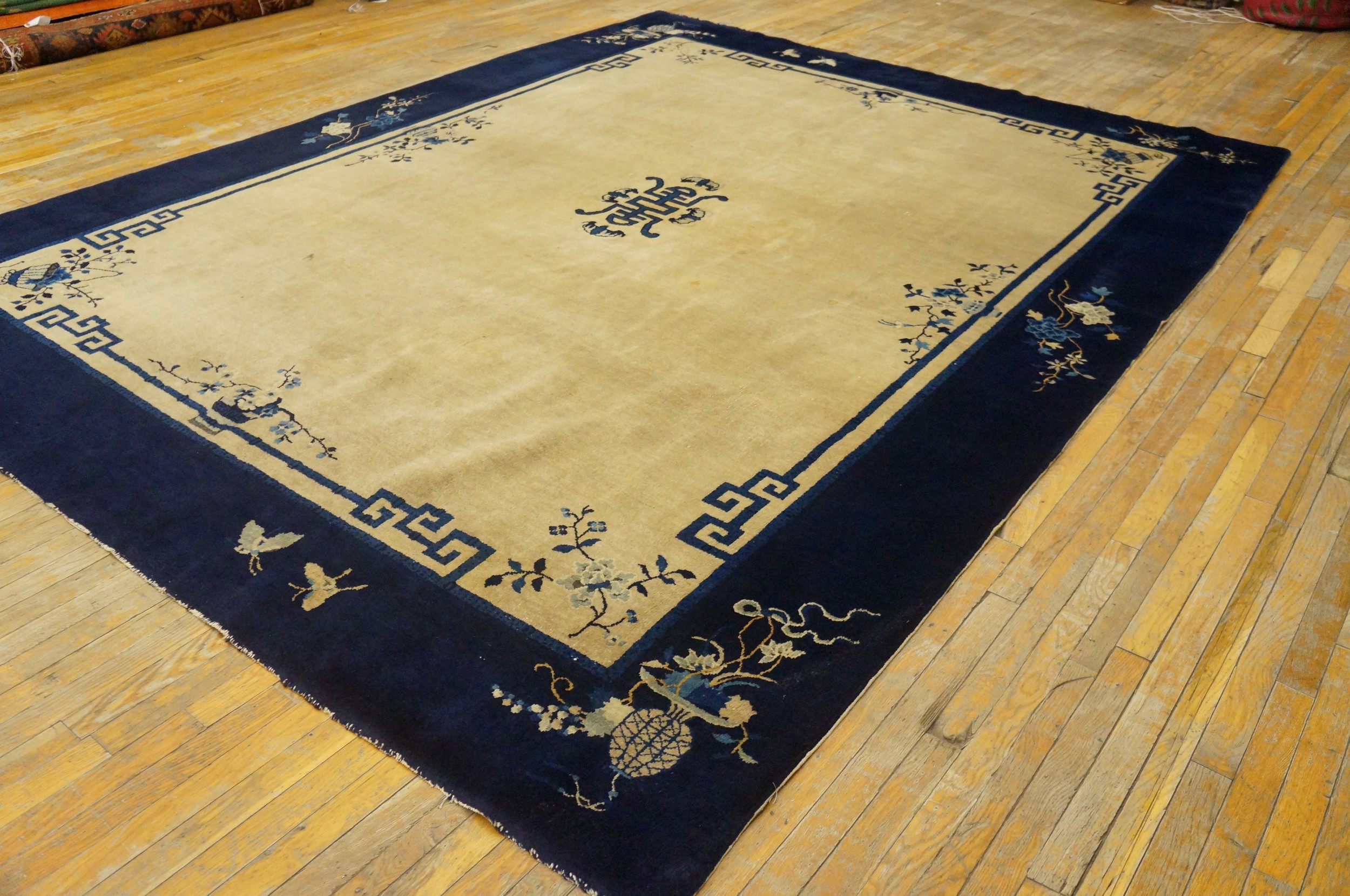 Antique Peking Chinese Floral, Medallion Beige, Blue 1920s Rug, Circa Date: 1920s. This exceptional example of early 20th-century Chinese weaving captures the restrained elegance characteristic of high-quality antique rugs from the Republican era. The design features a vast, luminous beige field, providing a perfect counterpoint to the dramatic indigo border.