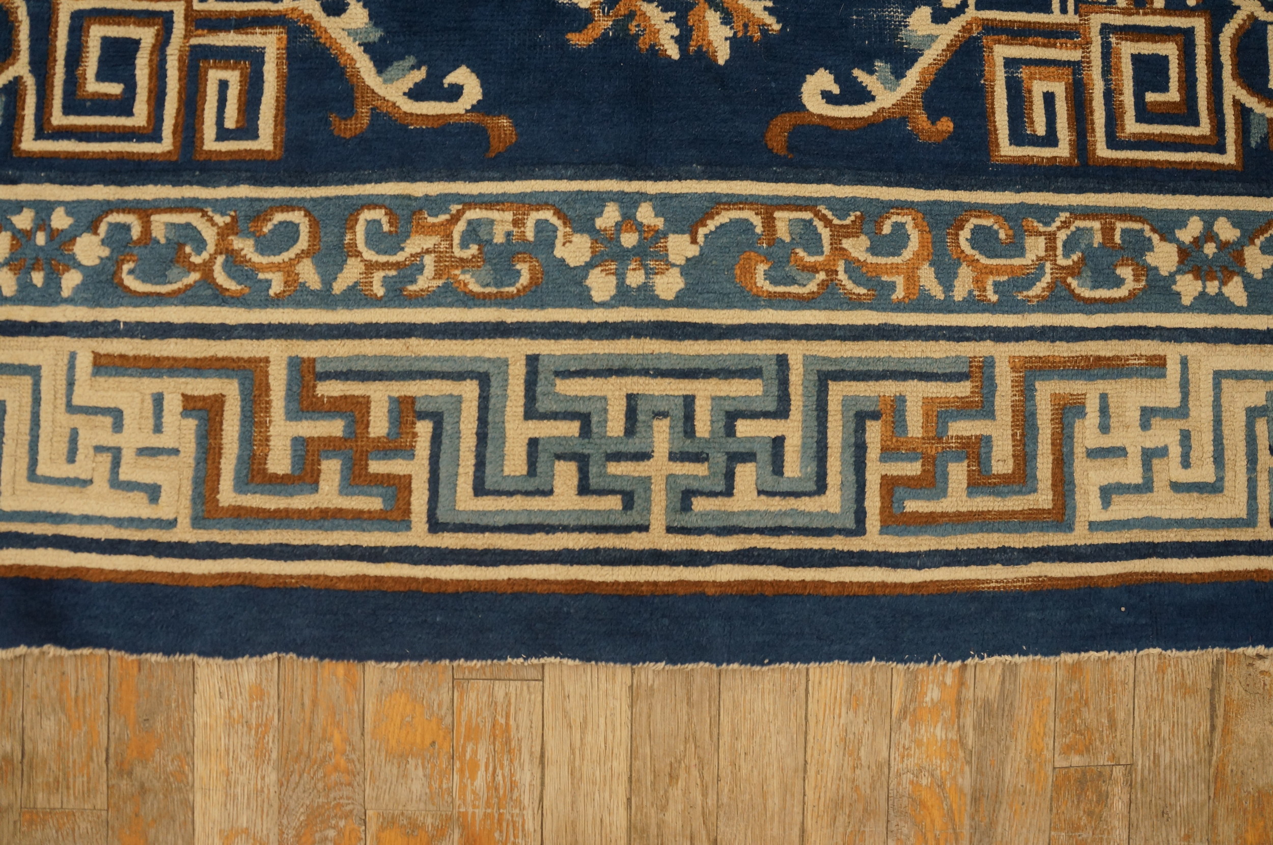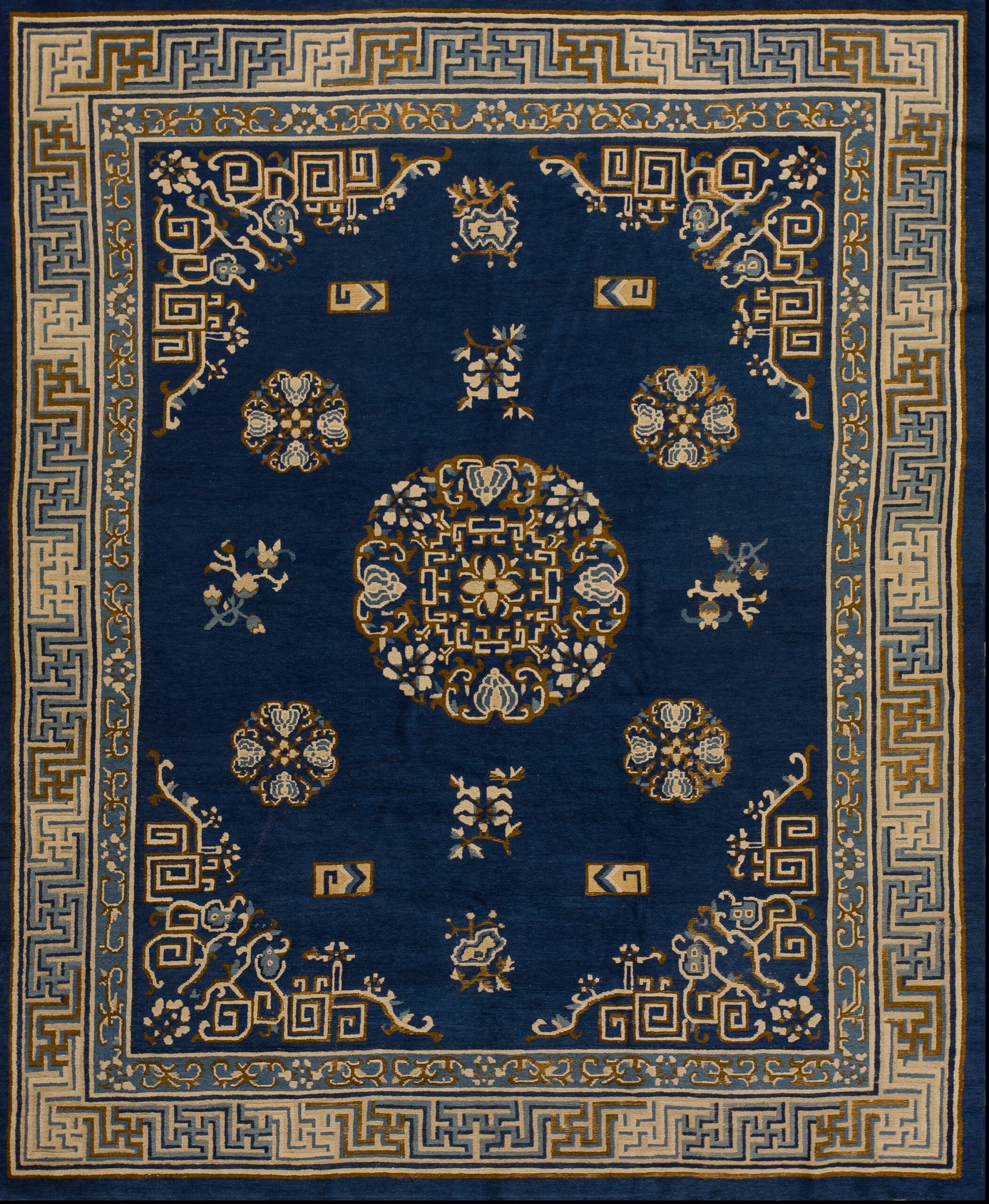 The design relies on classical Chinese motifs, balancing organic forms with strict geometry. The main border features a bold, multi-layered Greek key (Meander) pattern, executed in alternating tones of blue and beige, providing a structured frame that contrasts beautifully with the fluidity of the inner field. The corner spandrels integrate the floral elements with scrolling cloud bands, demonstrating masterful technical execution.