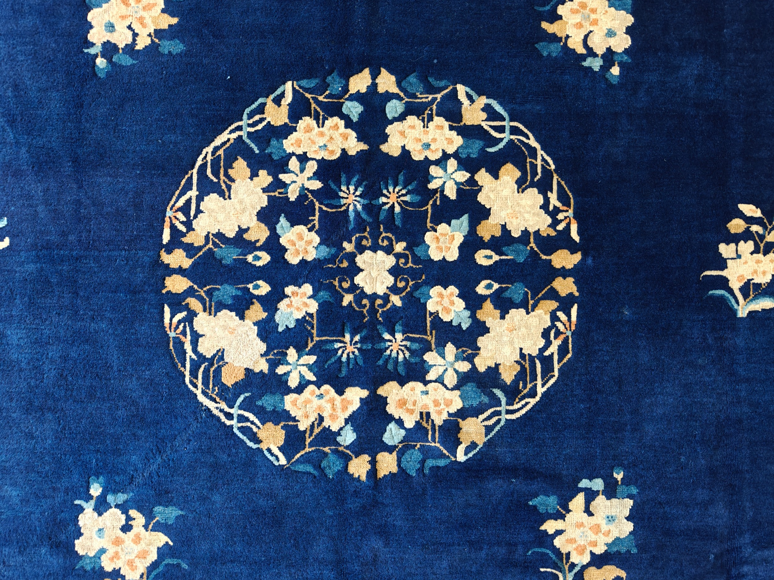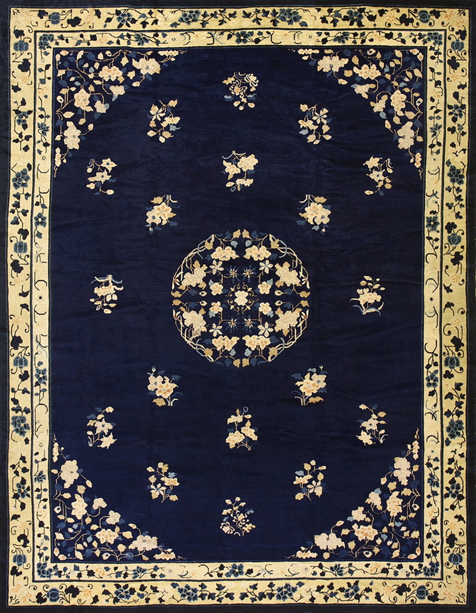 The commanding field is rendered in a saturated, deep navy, providing a dramatic backdrop for the delicate ornamentation. This rich hue is characteristic of the finest blue color rugs produced during this era, offering visual depth without heaviness. The composition features a beautifully articulated central medallion surrounded by individual bouquets, creating a sense of movement and asymmetry typical of Chinese Art Deco sensibilities.