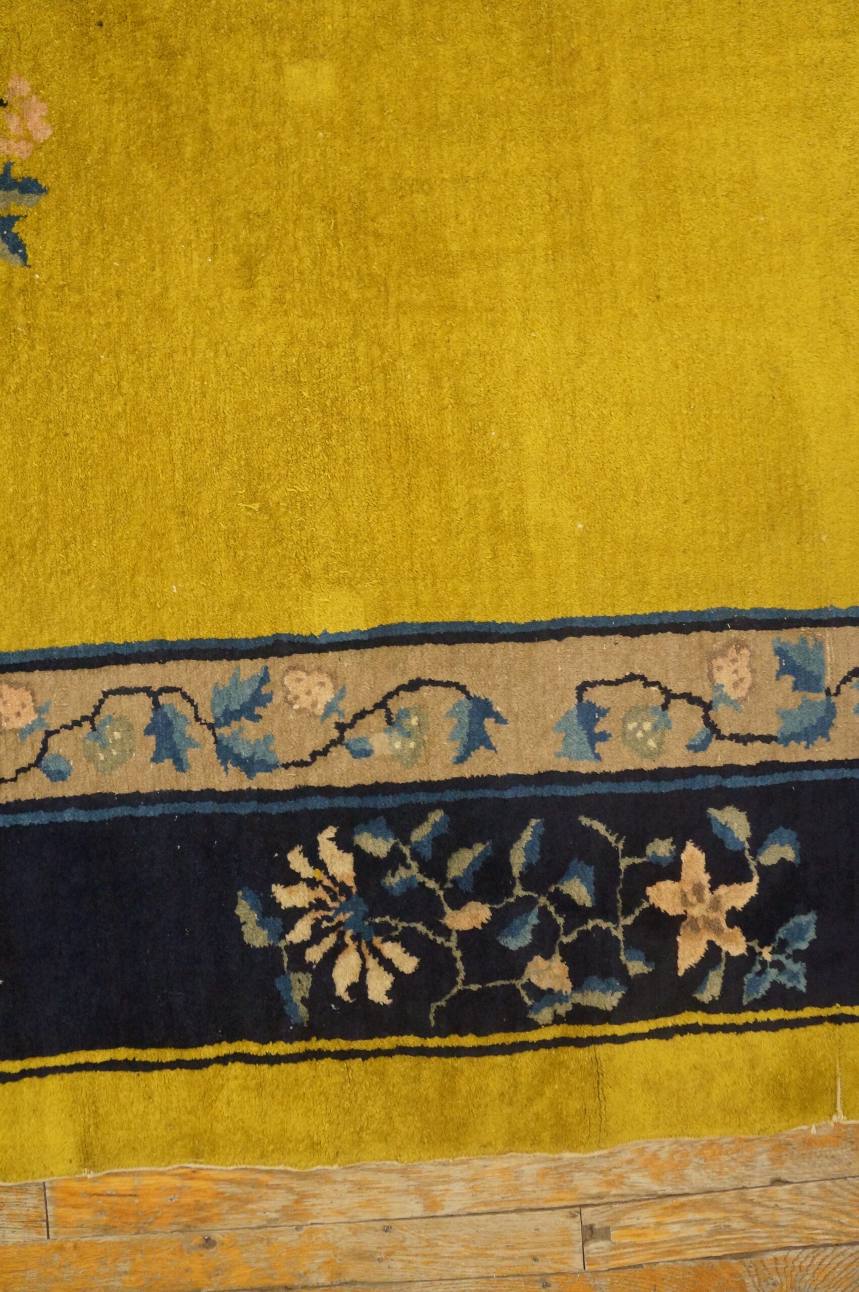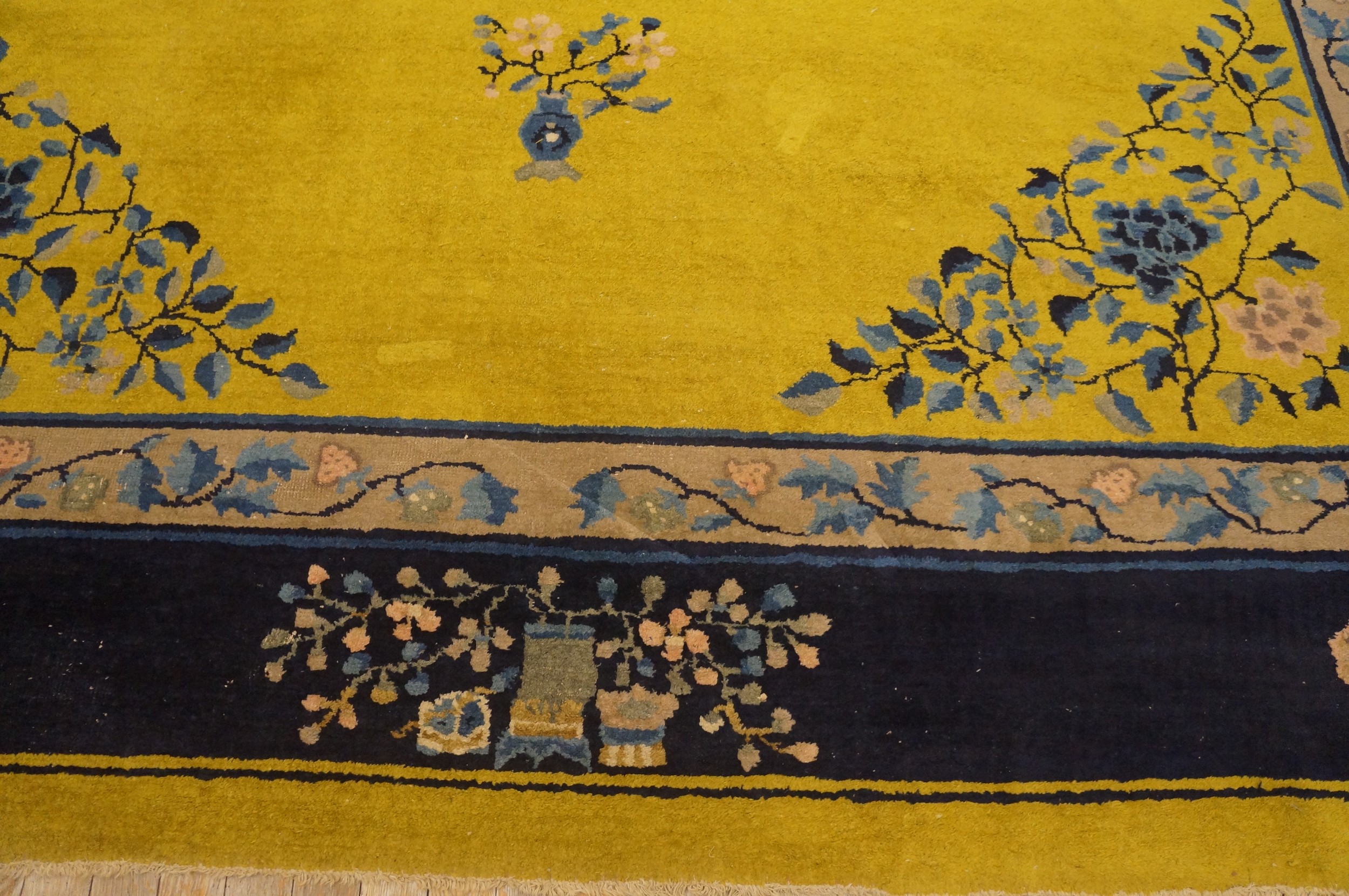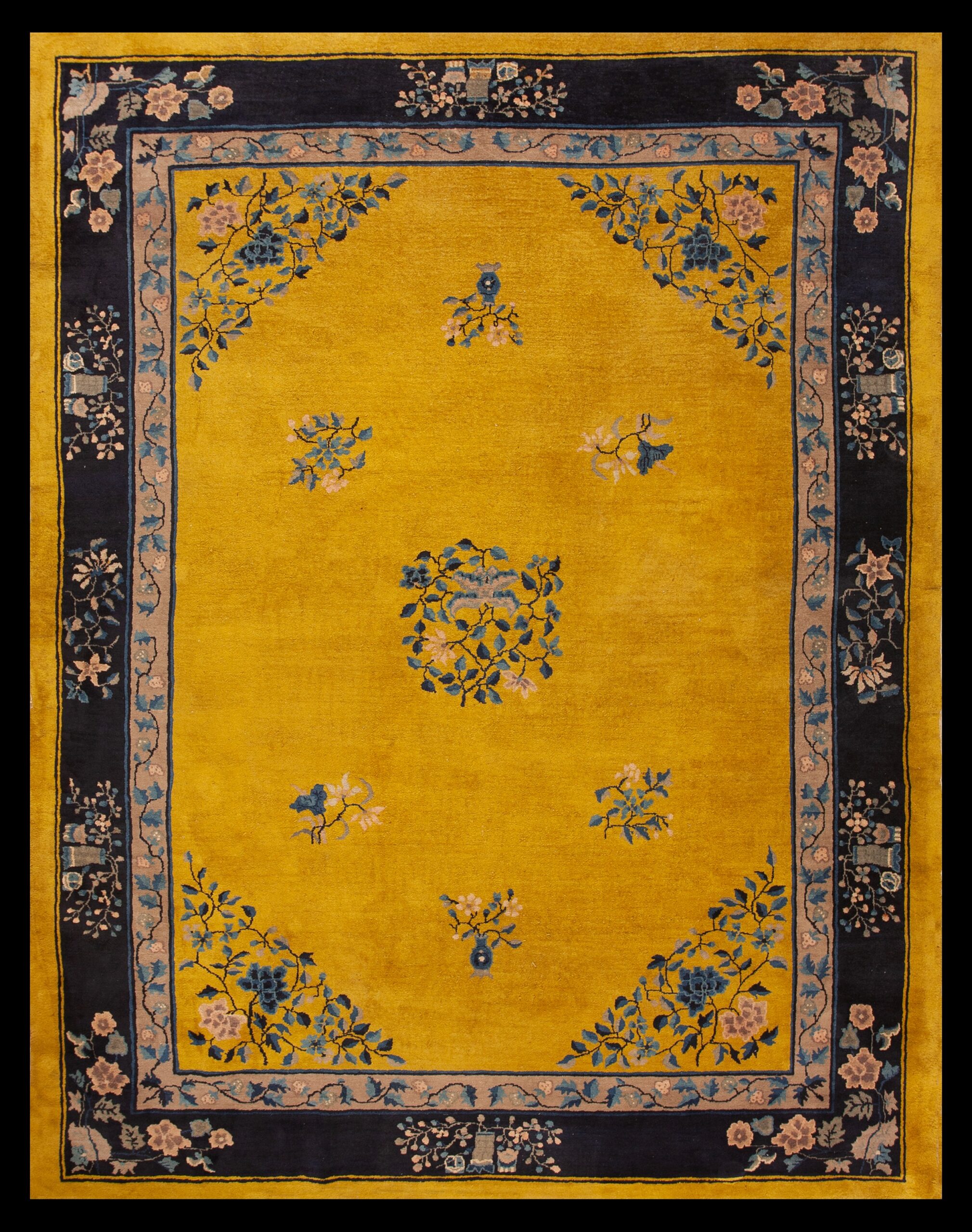 Antique Peking Chinese Floral, Medallion Other 1920s Rug, Circa Date: 1920s. This exceptional Chinese Peking piece captures the elegance of the early Republican era, showcasing a daring yet sophisticated color combination rarely seen in antique rugs of this period. The expansive field is dominated by a brilliant, saturated golden yellow, a hue traditionally reserved for imperial use, which provides a dramatic contrast to the deep indigo border.