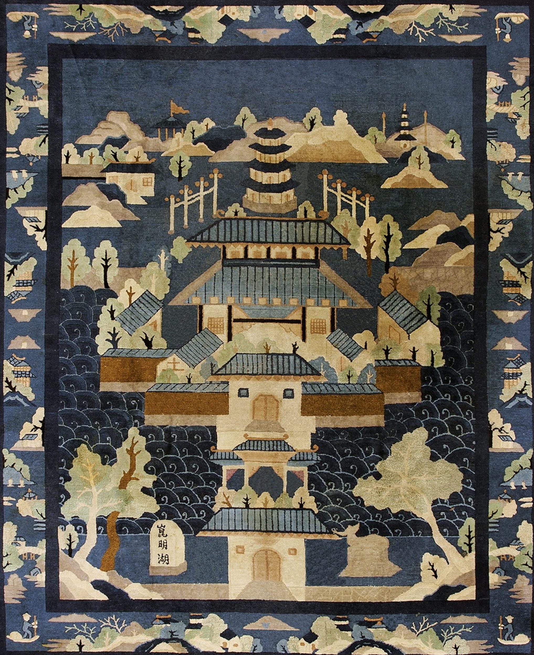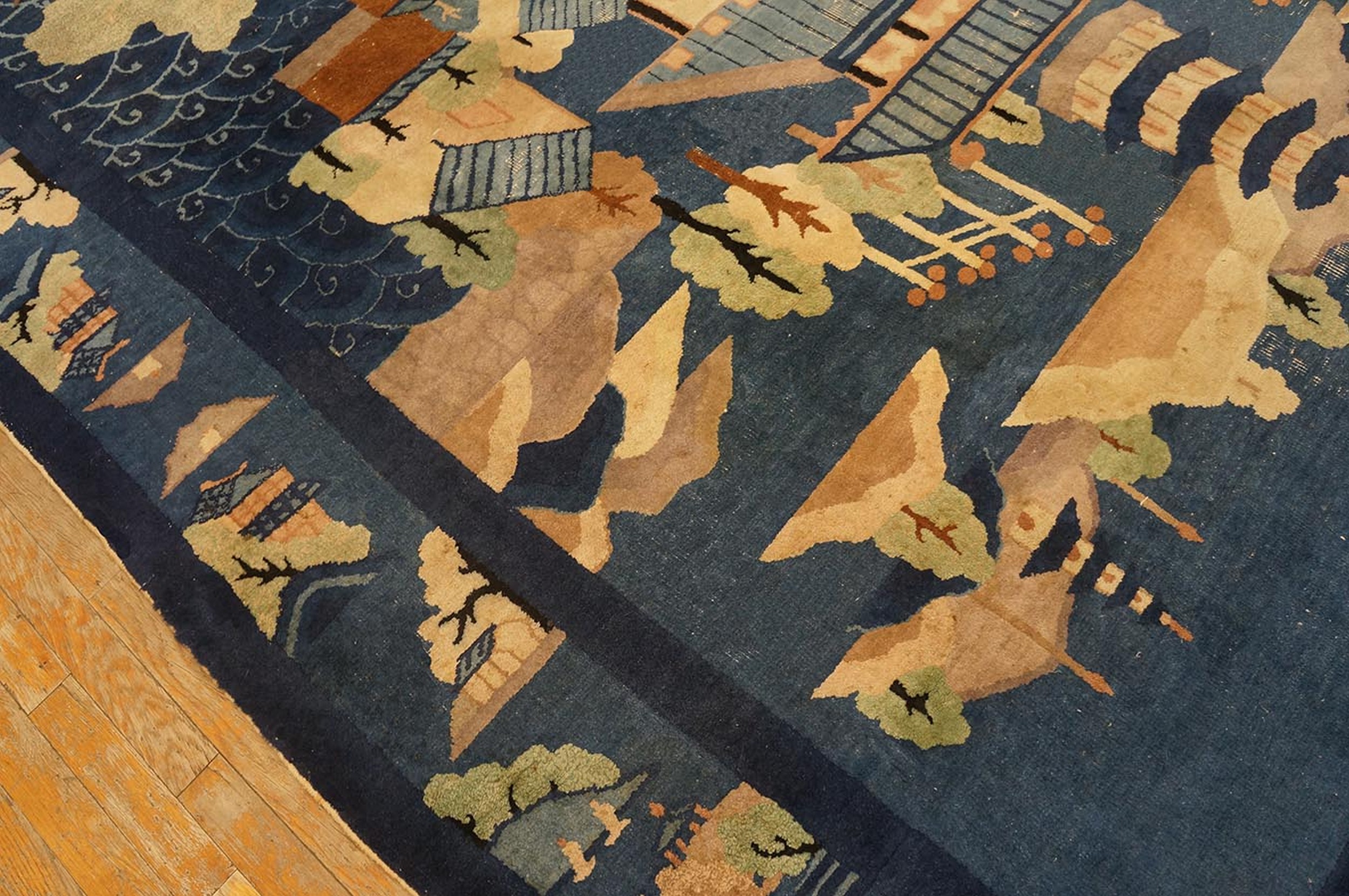 Antique Peking Chinese Geometric Blue 1920s Rug, Circa Date: 1920s. This exceptional Chinese Peking carpet captures a stylized, immersive landscape, rendered in a striking palette dominated by rich indigo and deep navy. The artistic merit of this piece places it among the finest antique rugs produced during China’s early Republican era.
