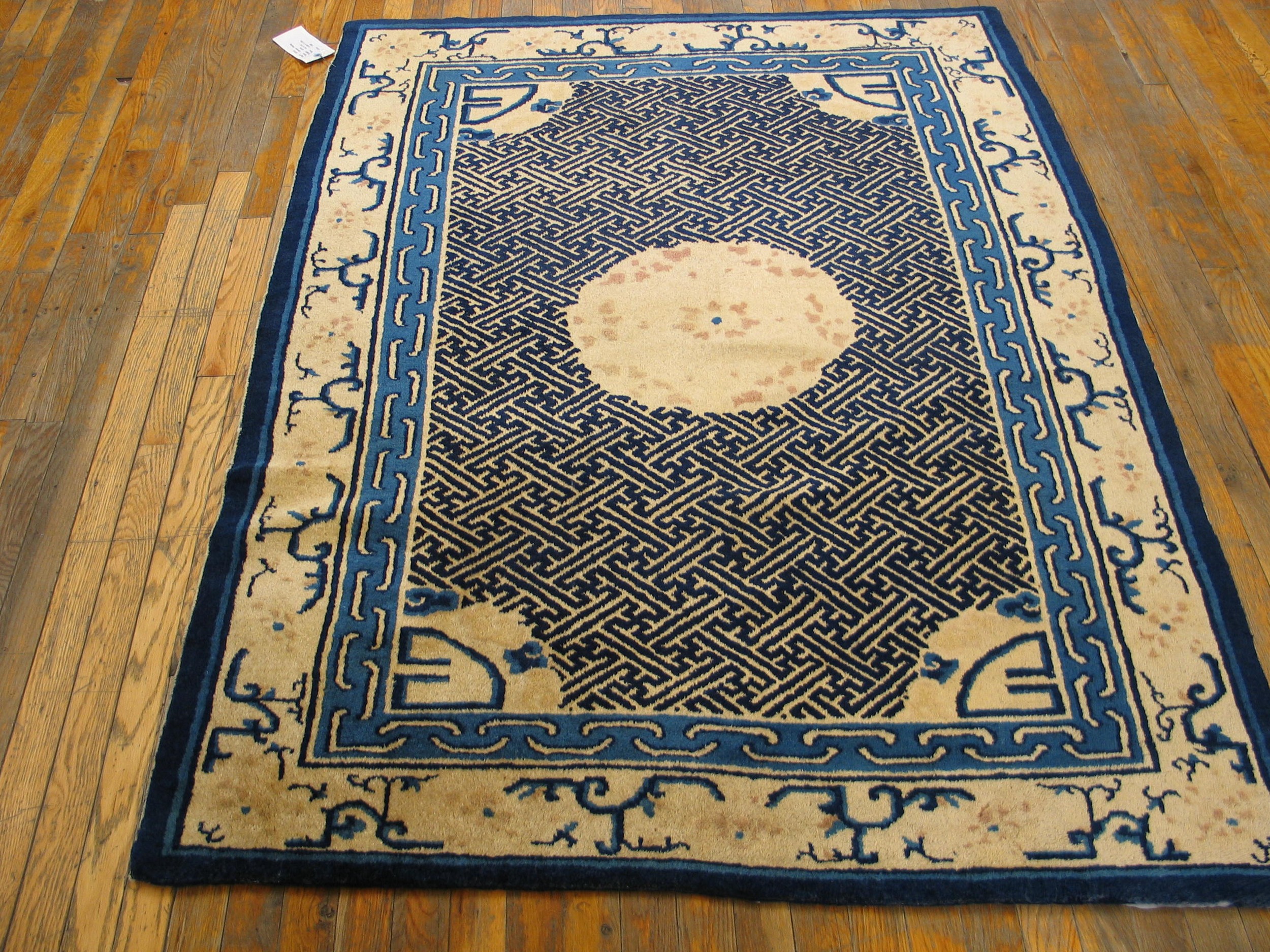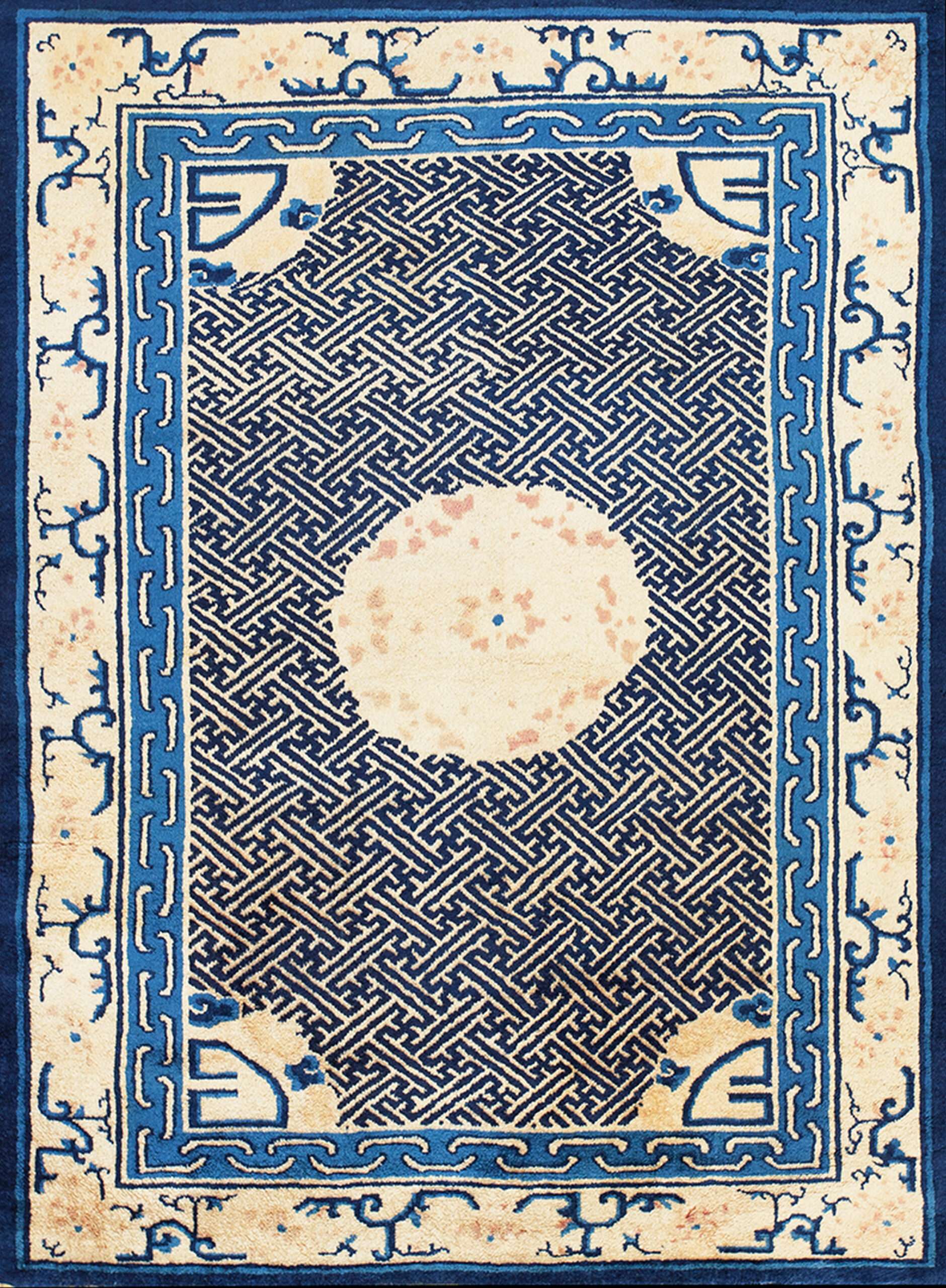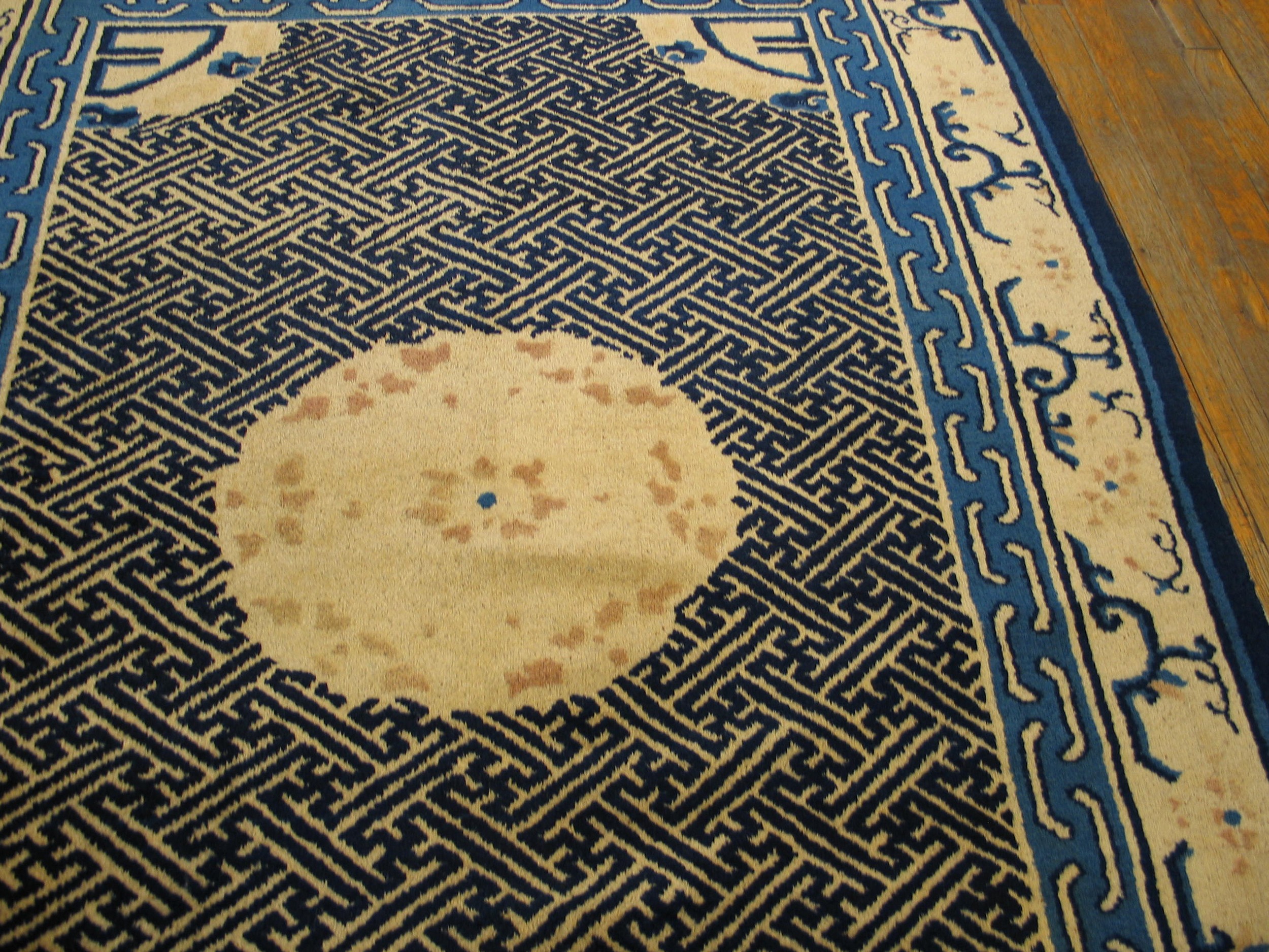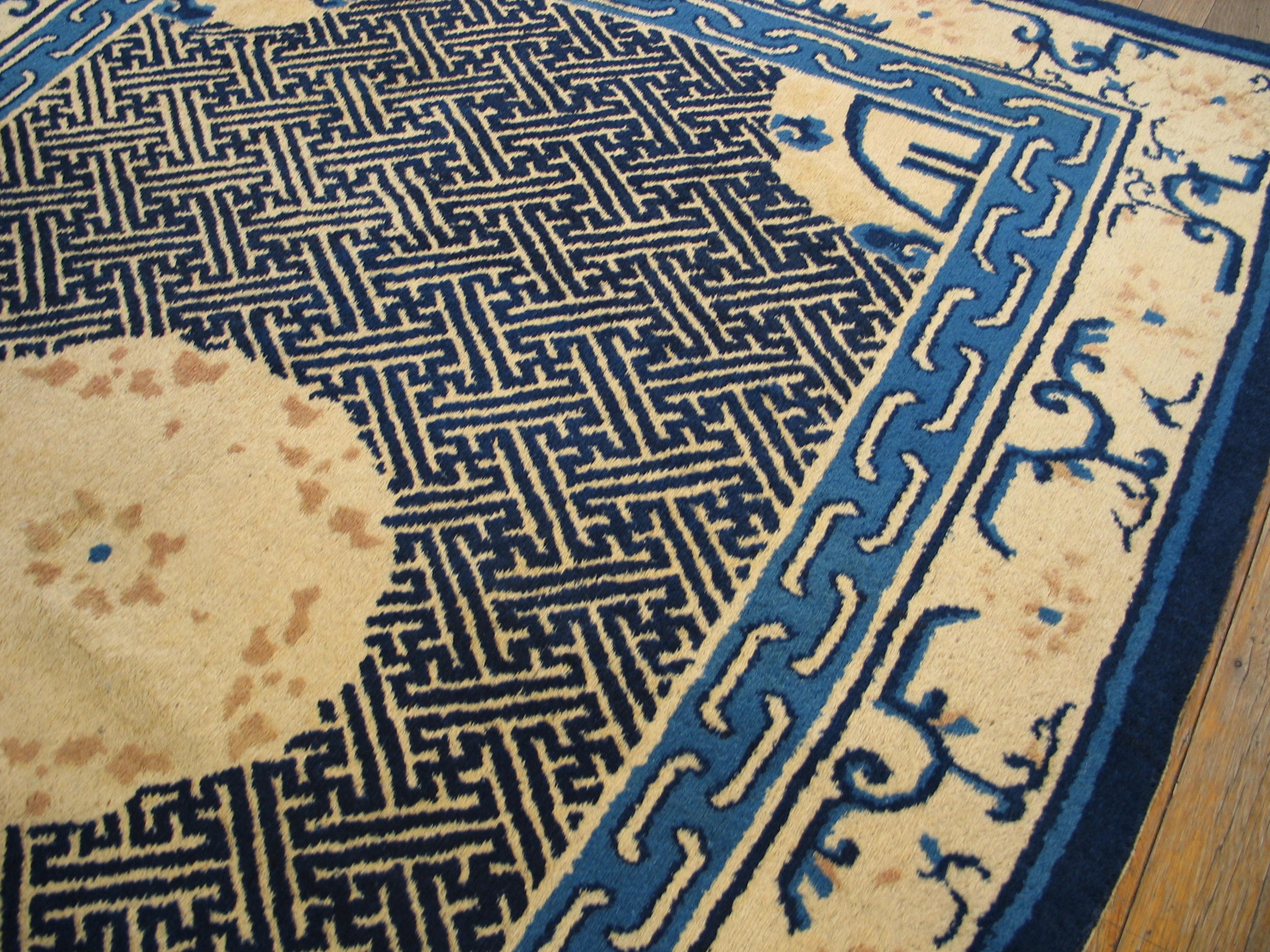 Antique Peking Chinese Ivory 1900s Rug, Circa Date: 1900s. This striking Chinese Peking rug presents a superb example of early 20th-century design, utilizing a high-contrast palette of deep indigo and soft, aged ivory color. The use of a luminous ivory field provides a sophisticated backdrop, characteristic of the finest pieces produced in Northern China during this transitional period.