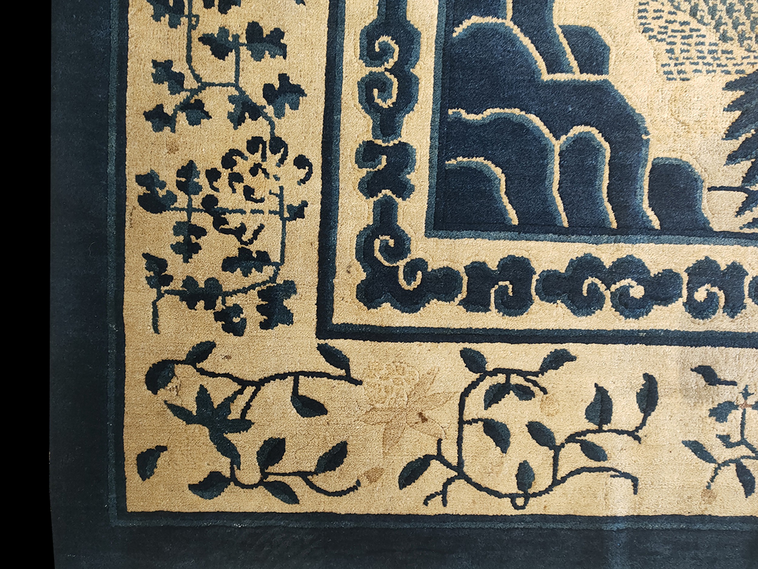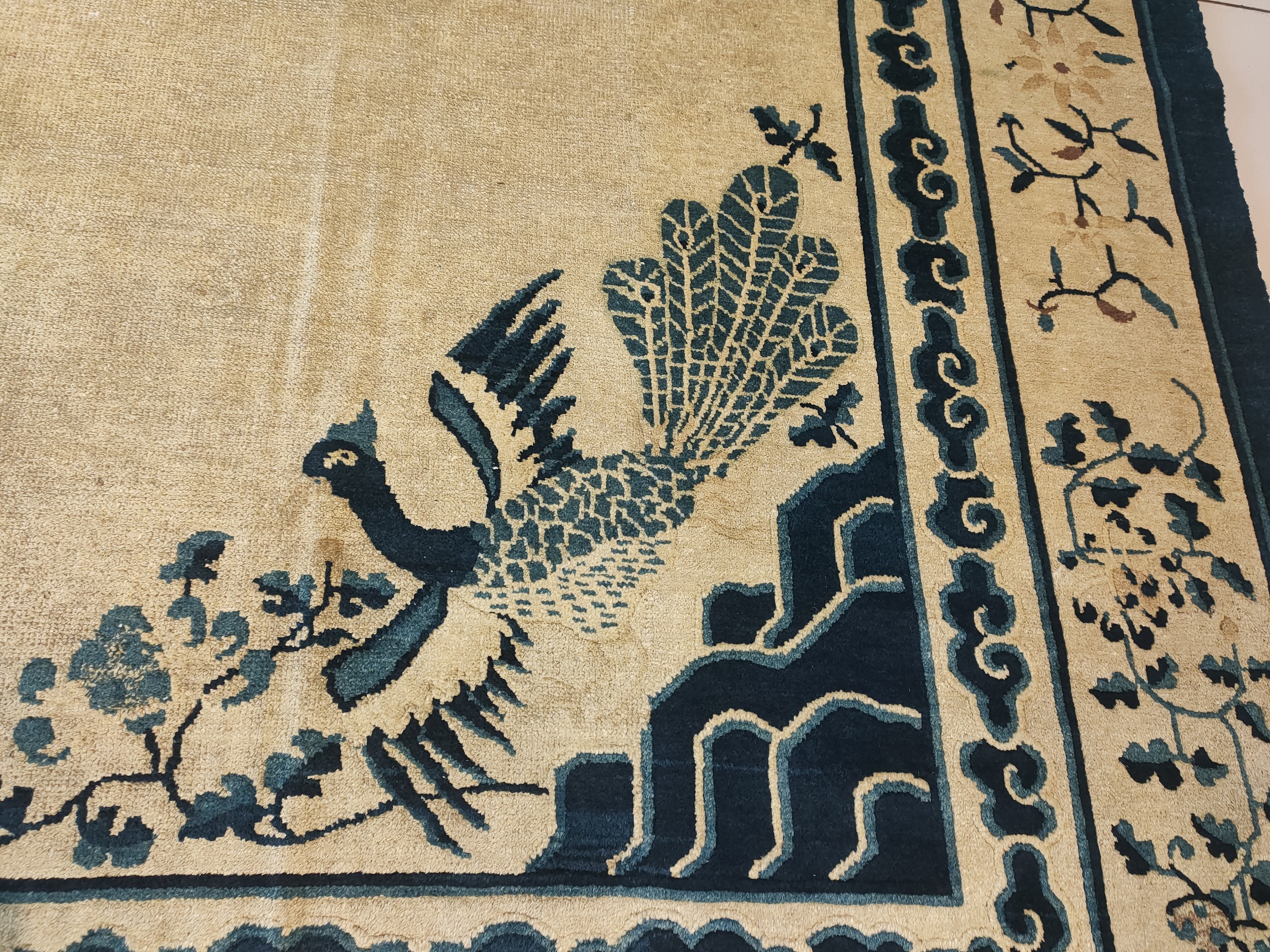The design is anchored by a striking circular medallion and corresponding corner spandrels, all rendered in rich indigo blue. These motifs depict highly stylized birds—likely phoenixes or peacocks—intertwined with delicate flowering vines and cloud scrolls, symbols of prosperity and longevity in Chinese culture. The precision of the knotting highlights the graphic quality of these traditional forms, distinguishing it from earlier, more densely patterned antique rugs.