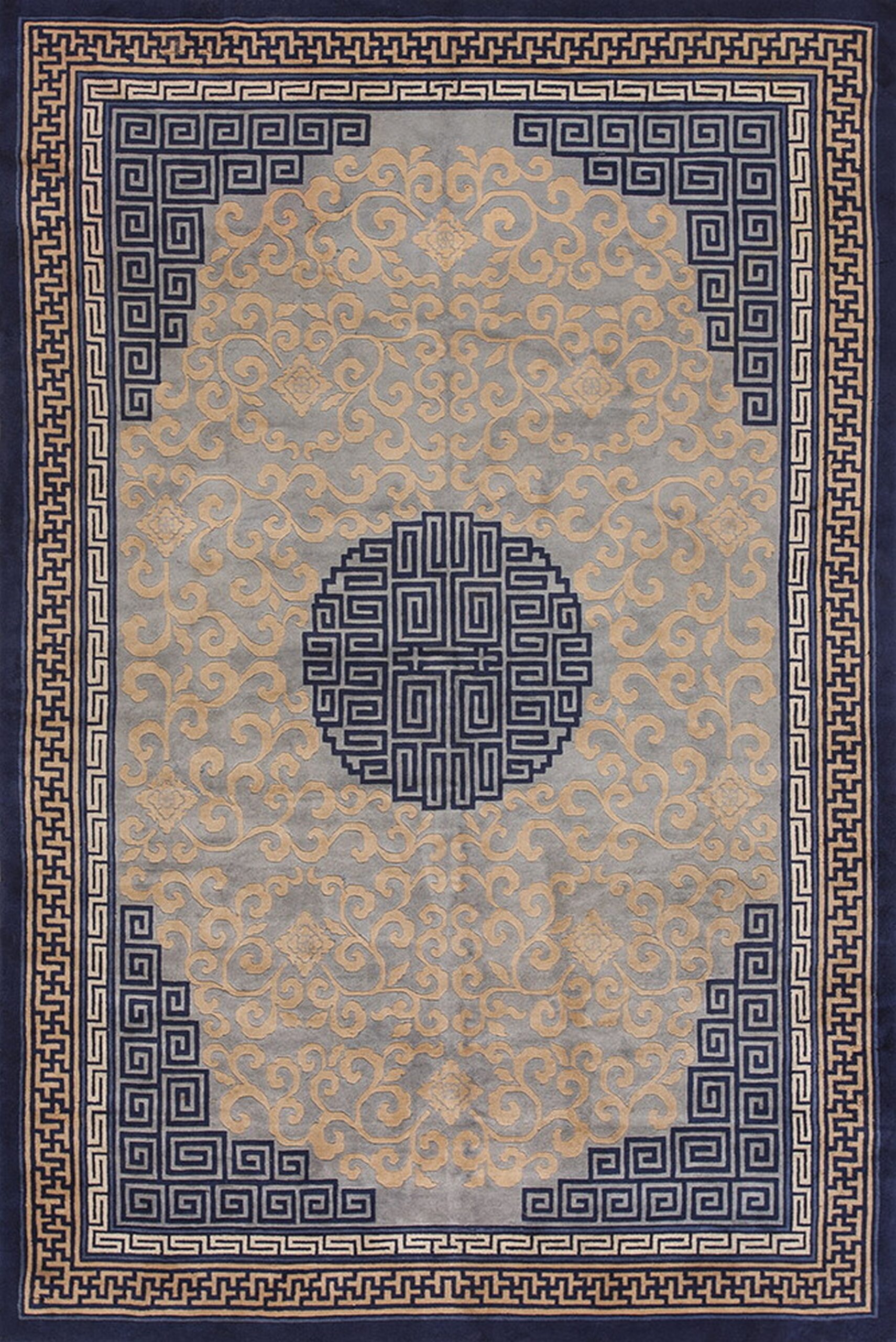 The central field features an intricate, all-over pattern of stylized cloud-band scrolls rendered in a luminous, slightly raised pile. This dynamic movement is anchored by a bold, circular medallion executed in the geometric meander pattern, providing a powerful focal point against the background’s subtle gray-blue wash.