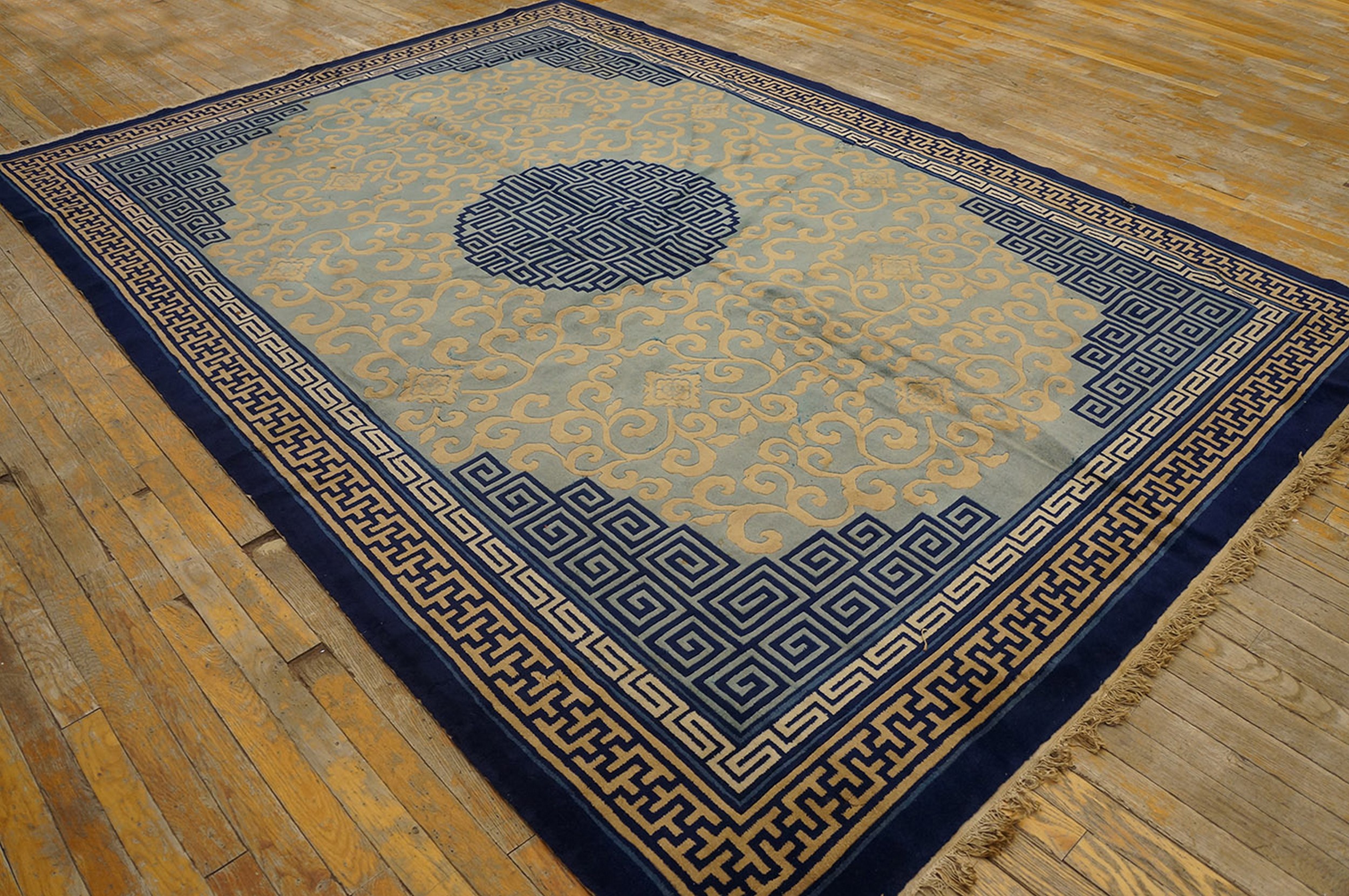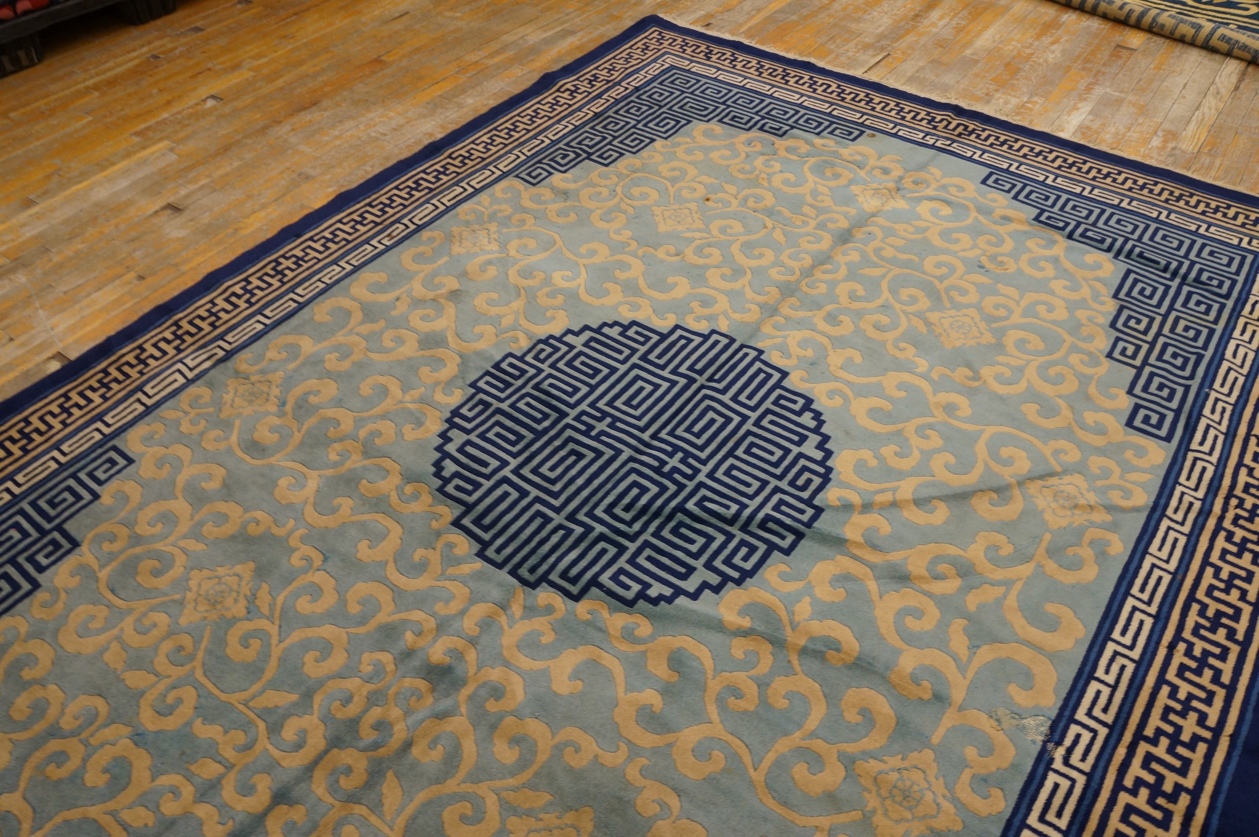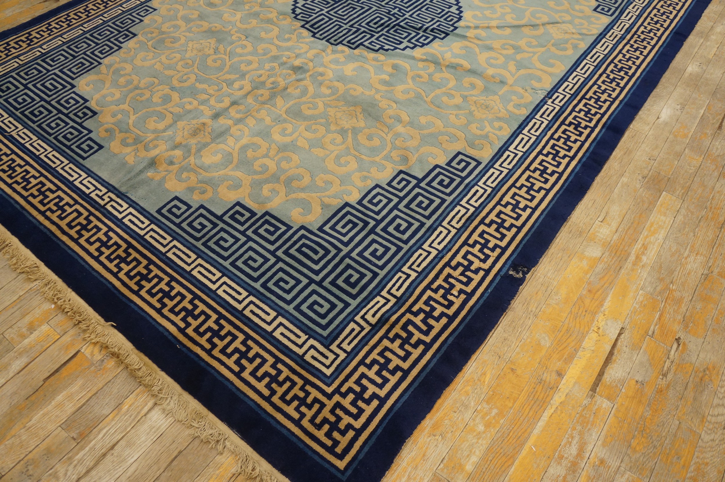 Multiple borders frame the composition, dominated by the classic Greek key or meander motif, which reinforces the architectural structure of the design. Given its substantial dimensions, this piece is perfectly suited for defining a large living space or dining area, functioning as a true room size rugs centerpiece that marries traditional Chinese artistry with mid-century modern sensibilities.