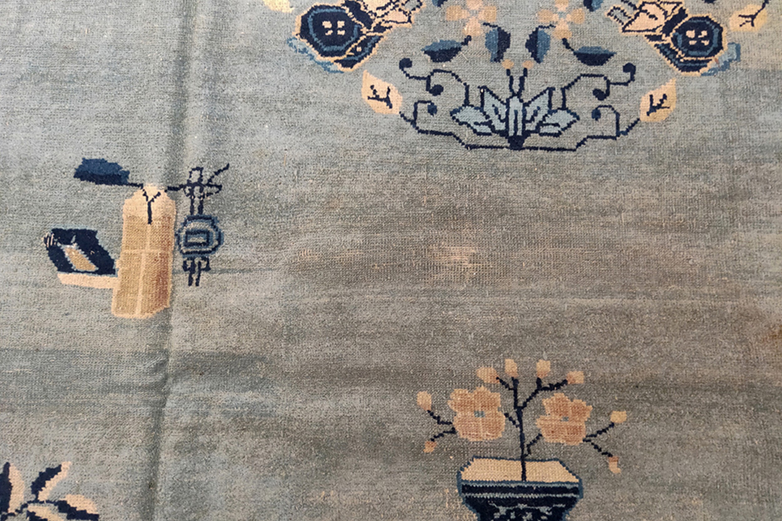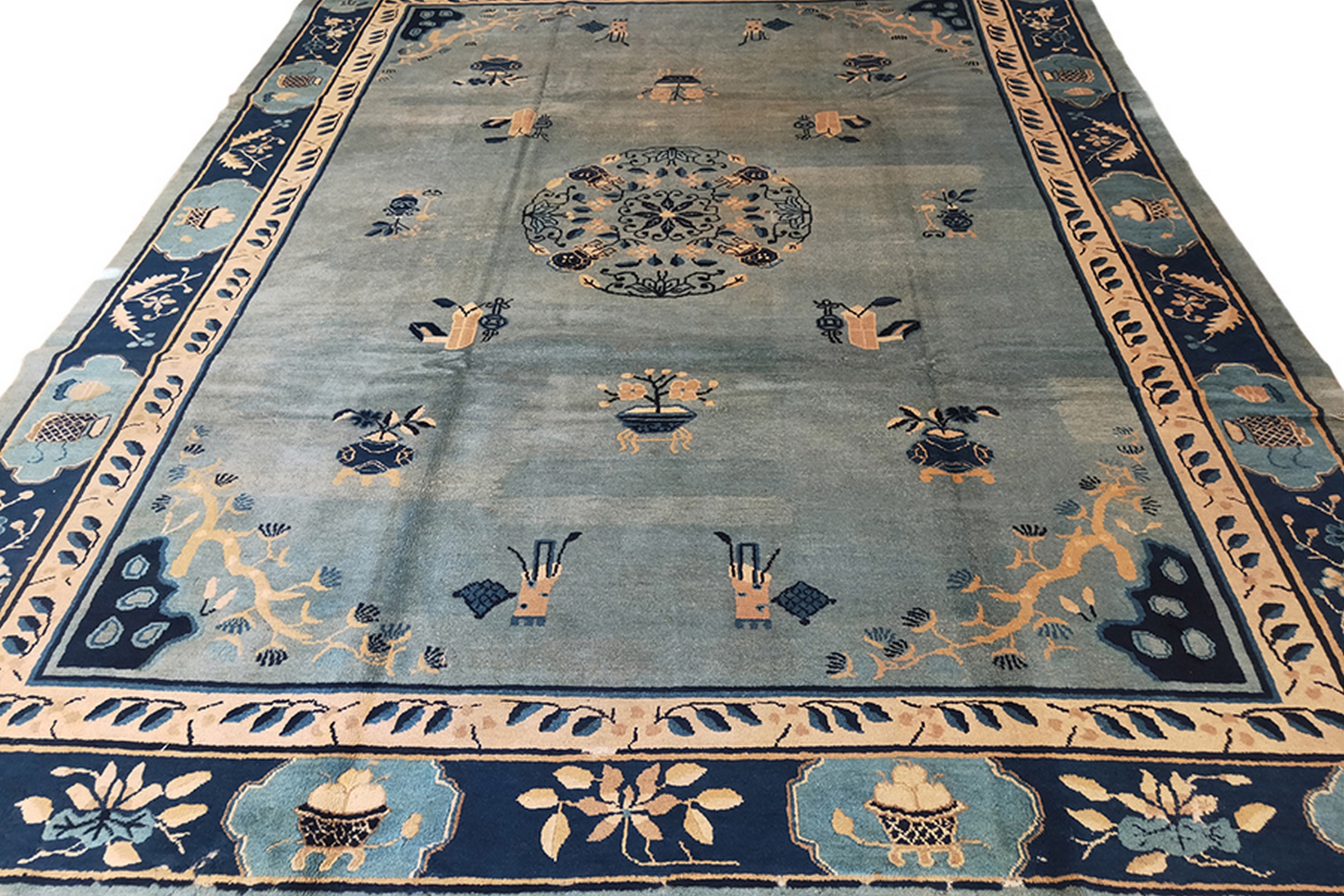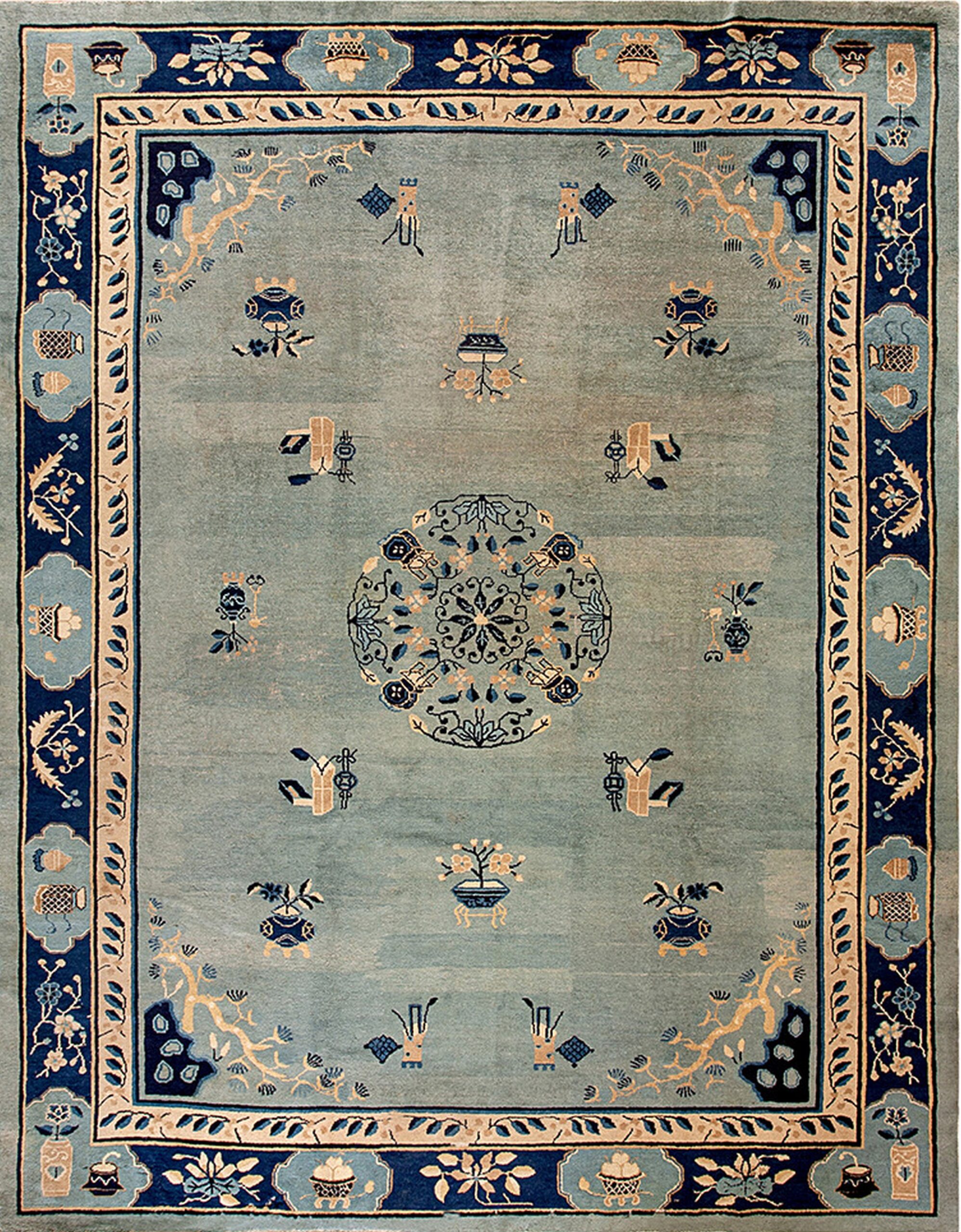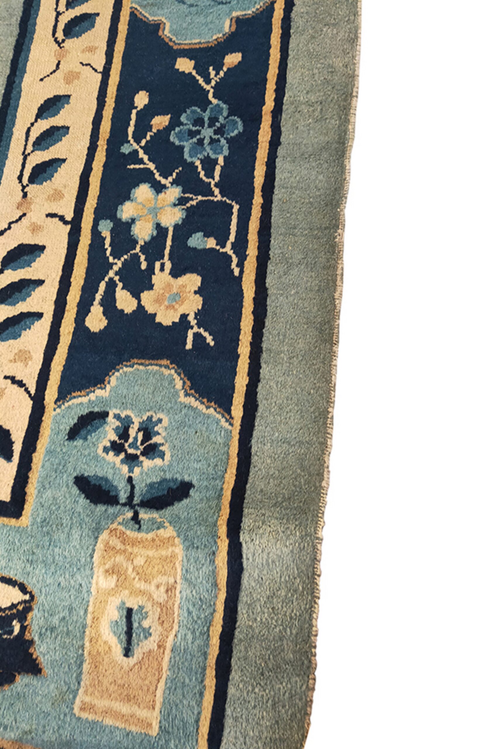 The border provides a dramatic frame, featuring deep navy cartouches interspersed with lighter blue panels, all filled with traditional Chinese iconography—vases, flowering branches, and symbolic objects. This precise execution showcases the highly developed artistry inherent in oriental rugs from this highly collectible period of production.