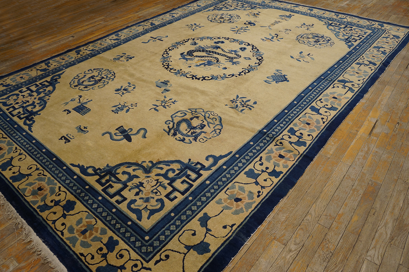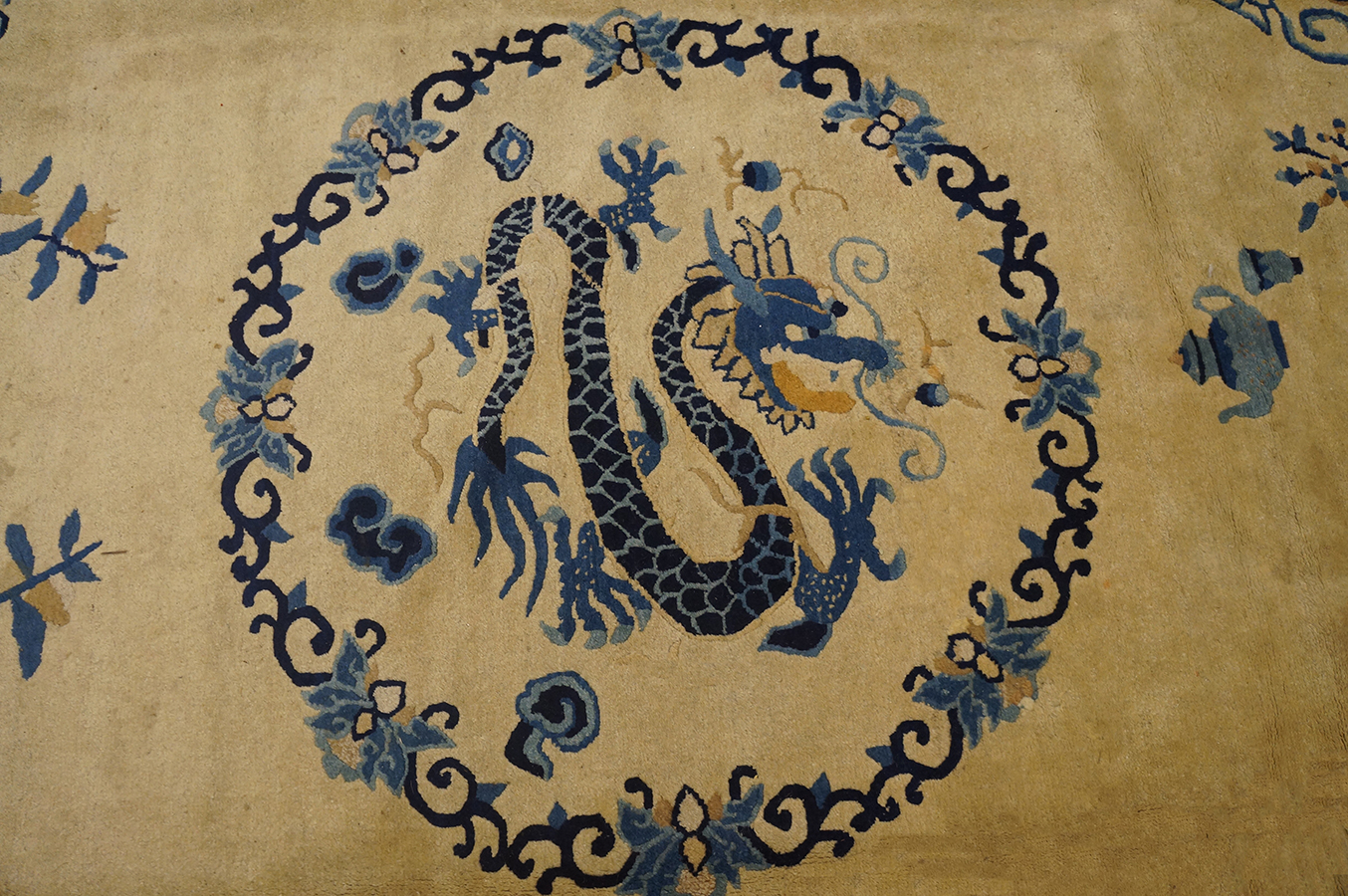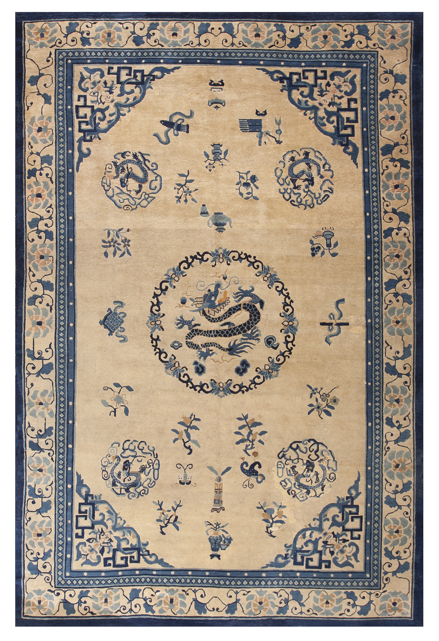 Antique Peking Chinese Medallion Blue Navy, Ivory 1900s Rug, Circa Date: 1900s. This magnificent example of early 20th-century Chinese weaving presents a striking visual contrast, utilizing a luminous ivory field to showcase the powerful, deep navy blue motifs. The central focus is a commanding, coiled dragon medallion, traditional symbol of imperial power and good fortune, rendered with exceptional clarity.