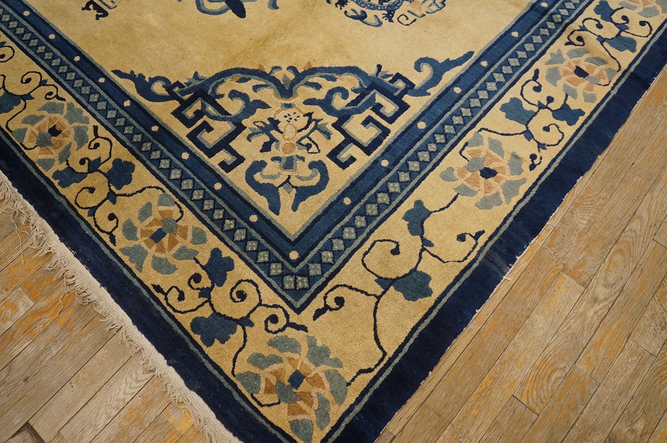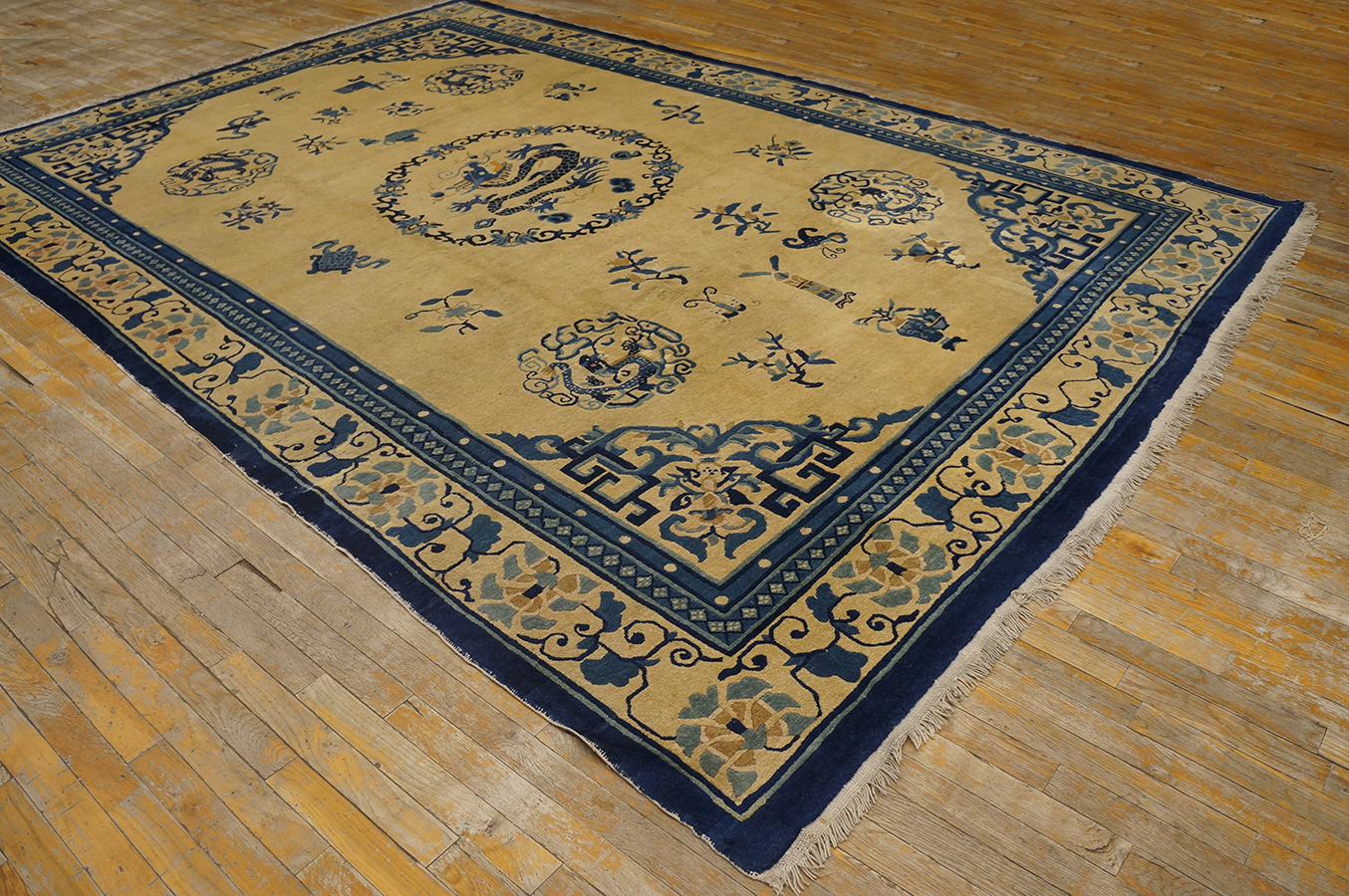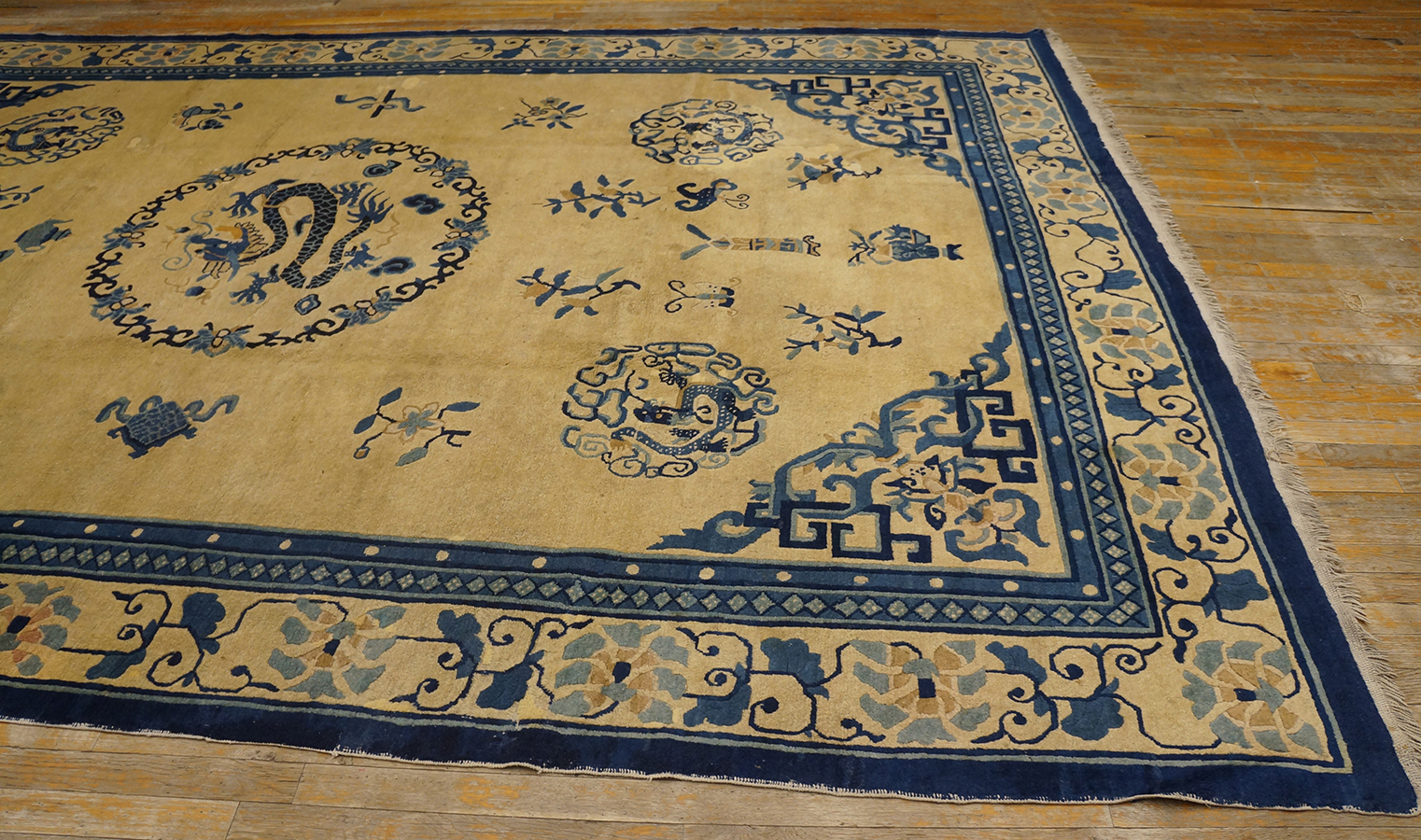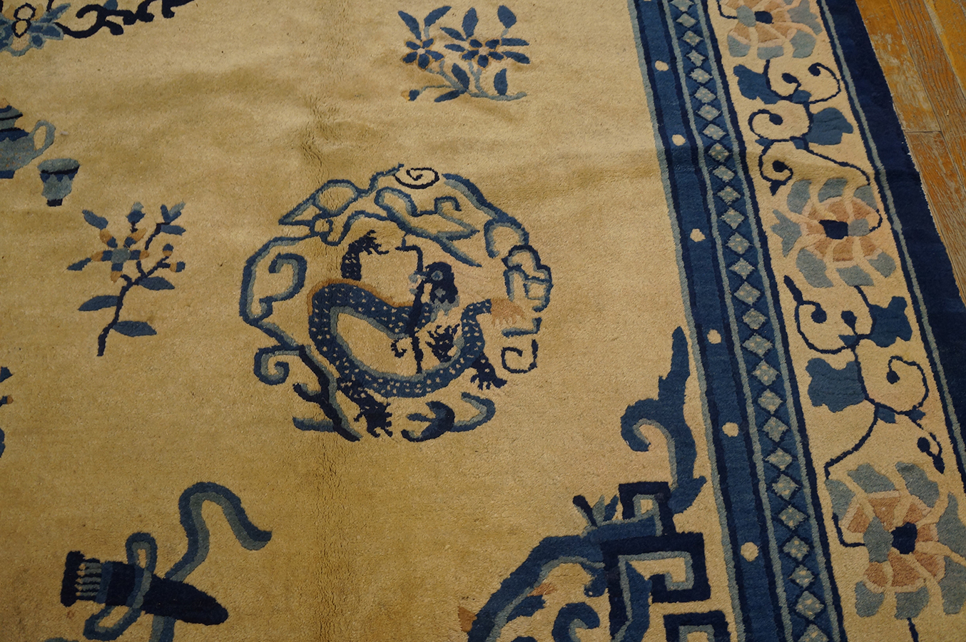 Antique Peking Chinese Medallion Blue Navy, Ivory 1900s Rug, Circa Date: 1900s. This magnificent example of early 20th-century Chinese weaving presents a striking visual contrast, utilizing a luminous ivory field to showcase the powerful, deep navy blue motifs. The central focus is a commanding, coiled dragon medallion, traditional symbol of imperial power and good fortune, rendered with exceptional clarity.