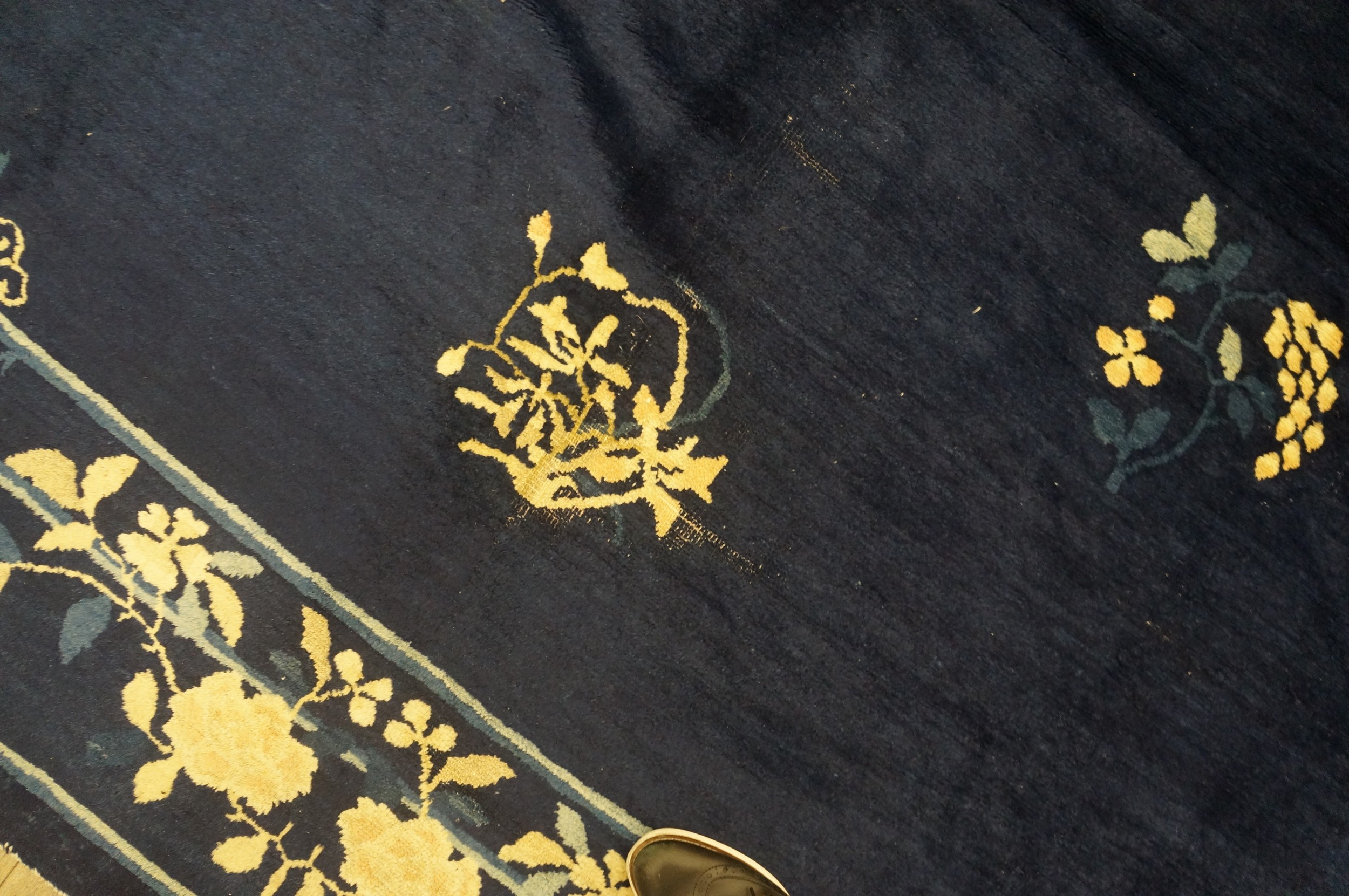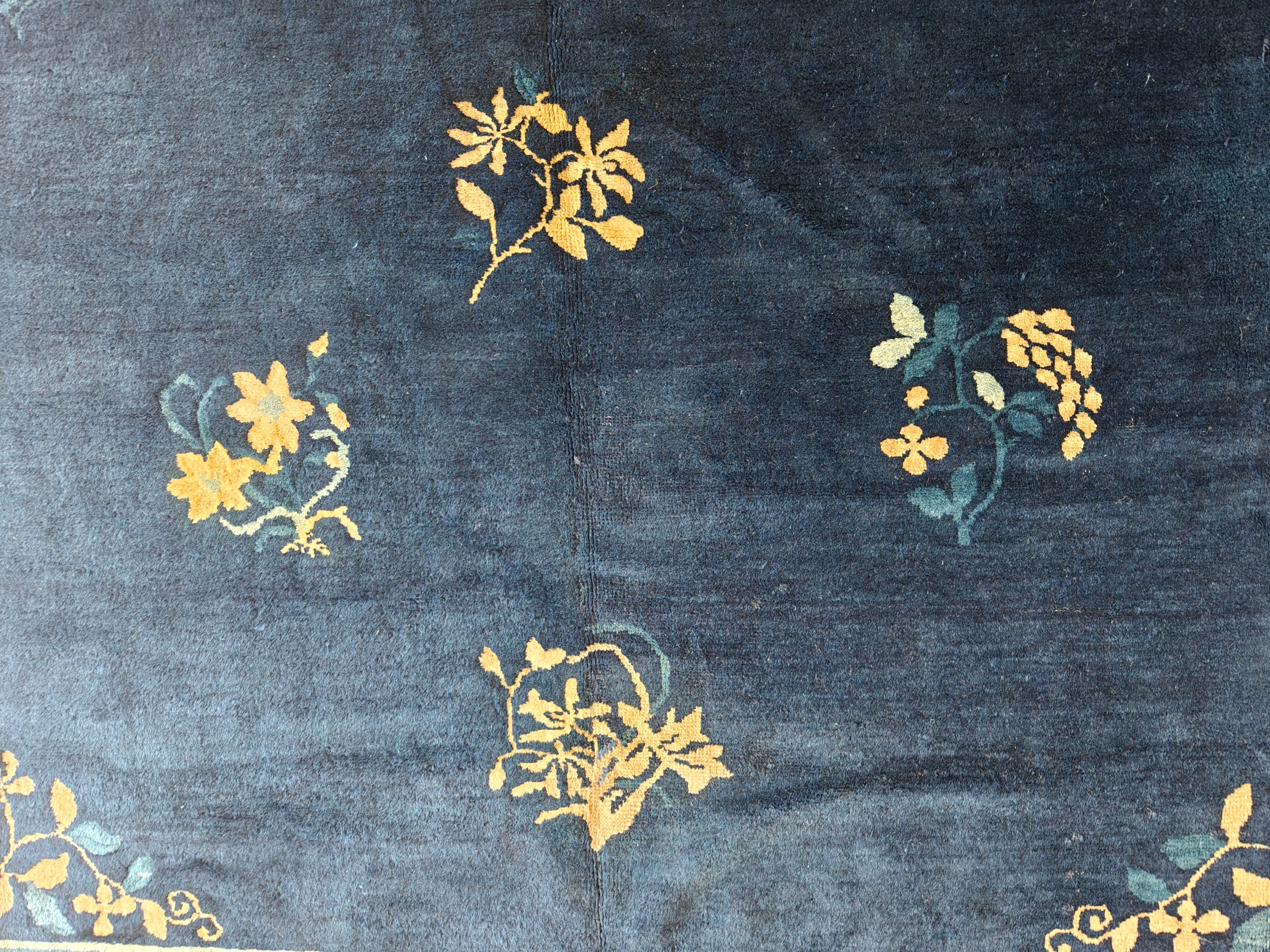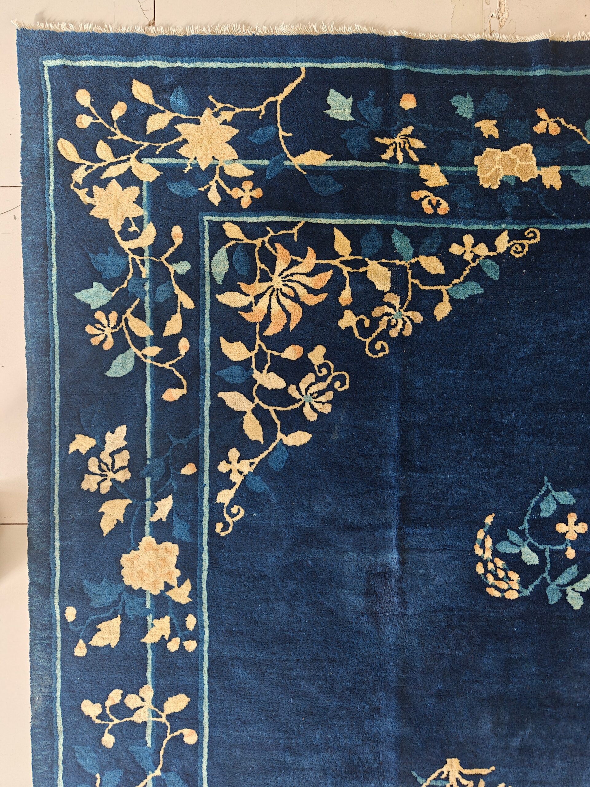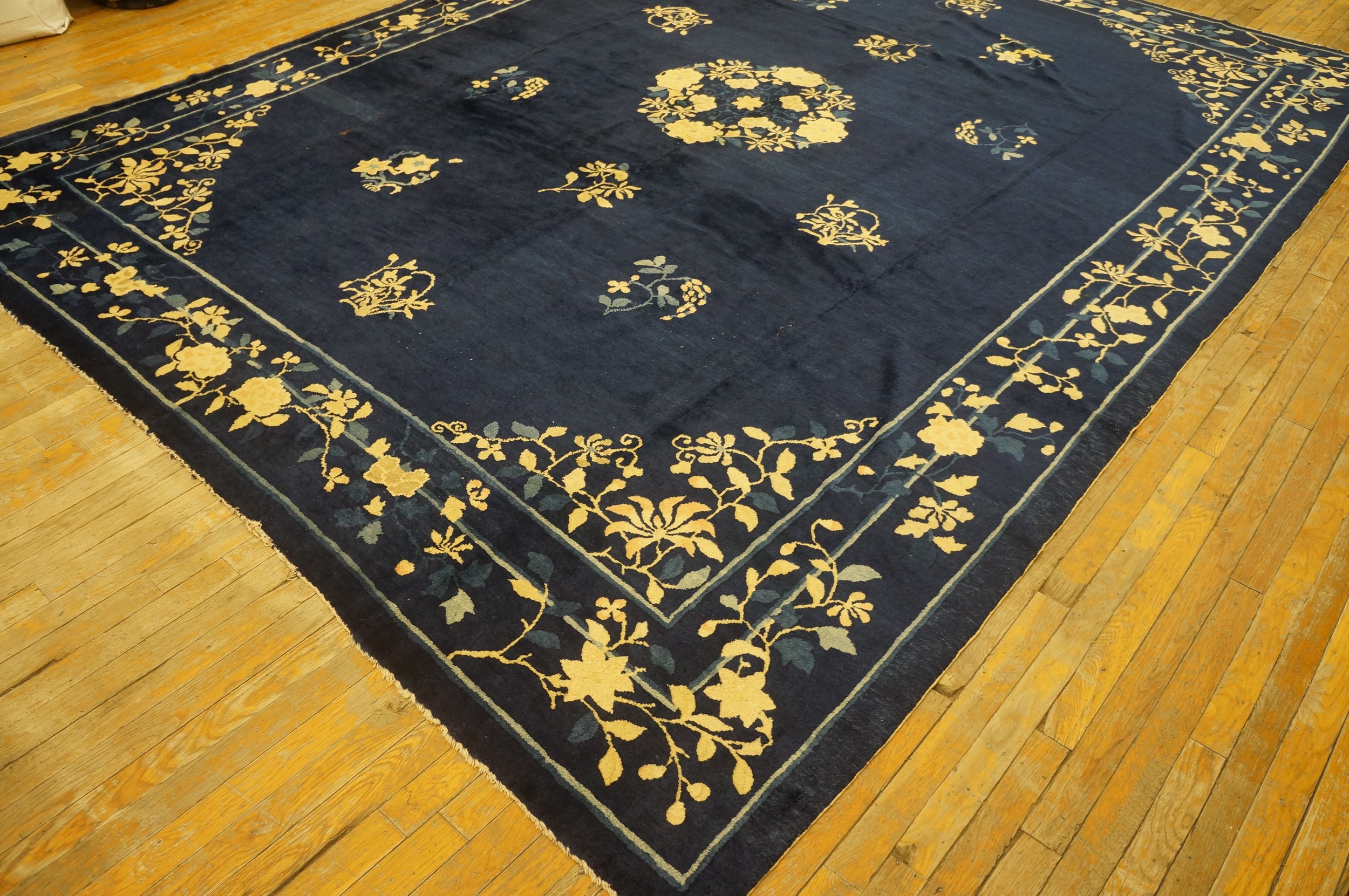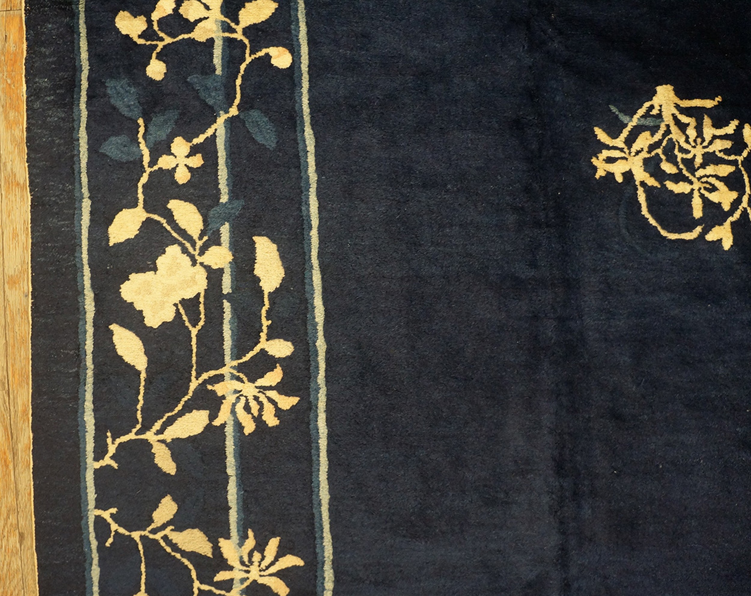Hand Knotted Pile Blue Ivory Beige Cream White Rectangle 1920s Wool Antique Rug, Circa Date: 1920s. This magnificent piece exemplifies the restrained elegance characteristic of early 20th-century Chinese weaving. The expansive, deep indigo field provides a dramatic, monochromatic canvas for the delicate scattering of floral sprays, capturing the essence of the Peking style.