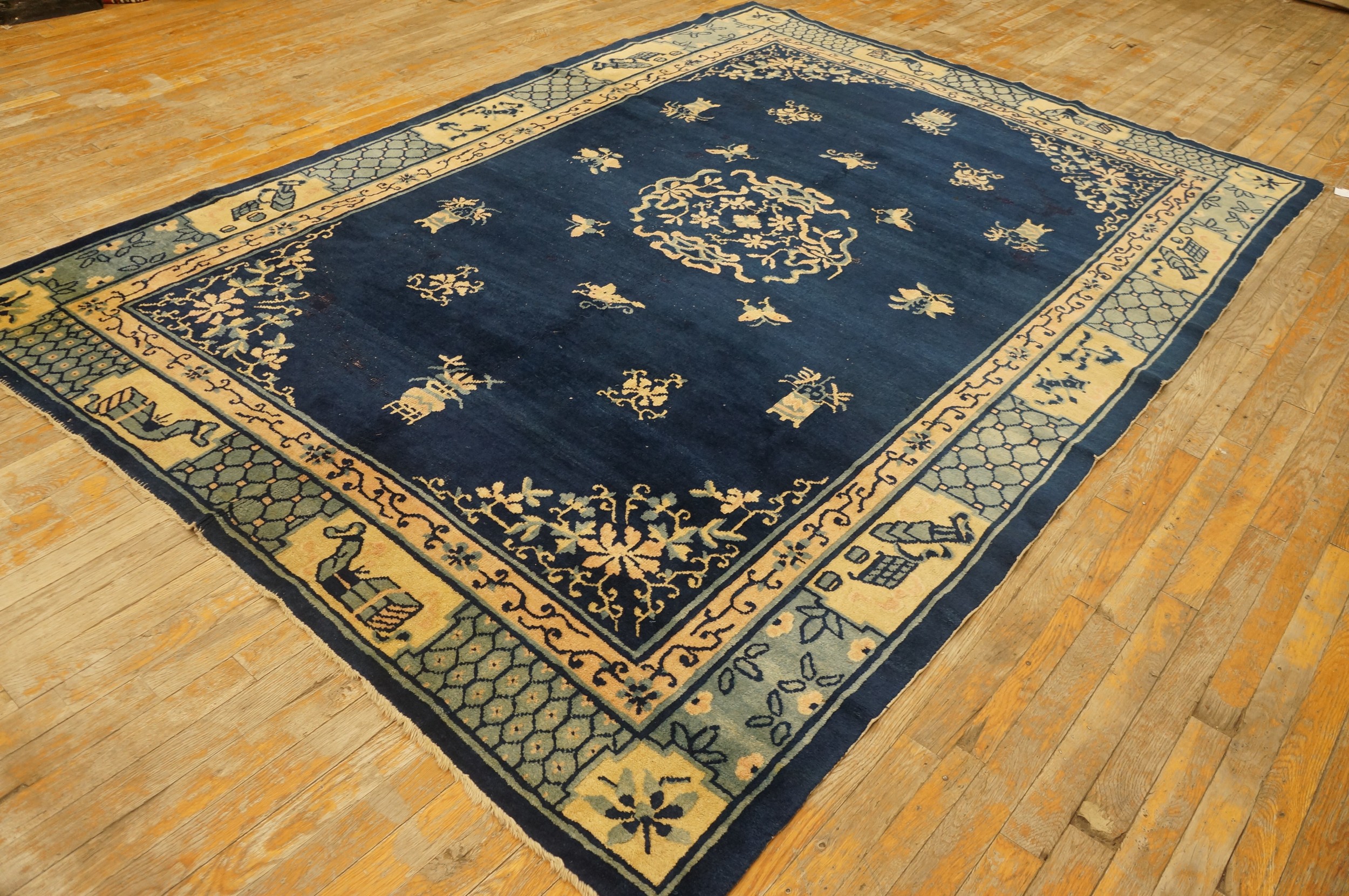 Antique Peking Hallway Runner Wool Beige, Blue Navy Rug, Circa Date: 1920s. This exceptional Chinese runner exemplifies the refined elegance of early 20th-century weaving. Its elongated format makes it an ideal choice for enhancing a long corridor or entryway, characteristic of fine hallway runner rugs. Note: This rug is classified as a Room Size Rug (6ft x 8.06ft).