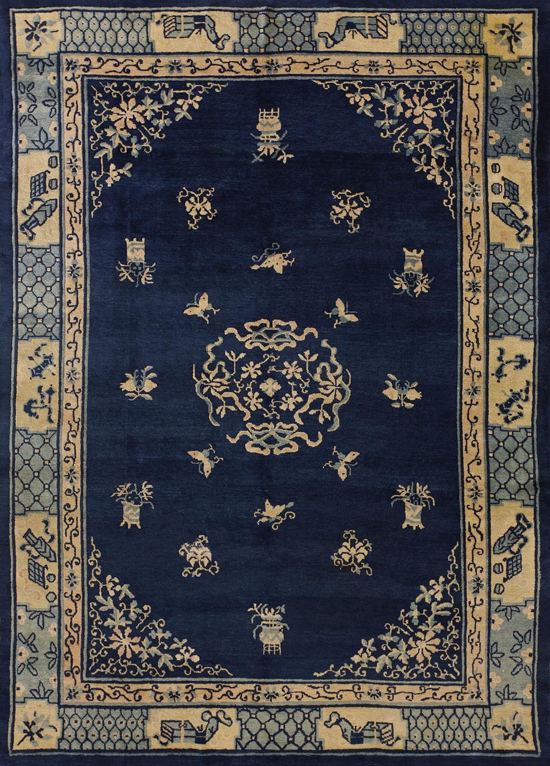 The design features an open field centered around a delicate, curvilinear medallion, surrounded by scattered auspicious symbols, including vases and butterflies. The main border utilizes geometric patterns alternating with cartouches containing traditional Chinese emblems, demonstrating meticulous craftsmanship and balance.
