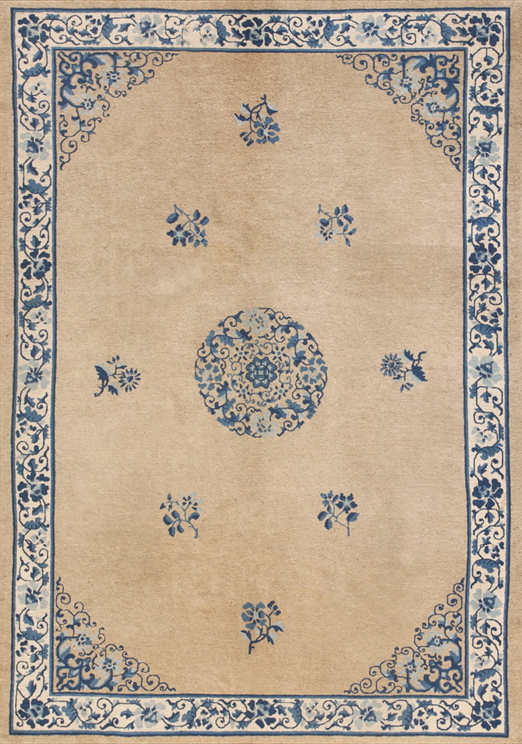 The palette is particularly striking, featuring a vast, luminous field of natural sand color wool, which provides a serene backdrop for the detailed motifs. This neutral ground is dramatically framed and accented by rich, deep cobalt blue, typical of the high-quality mineral dyes used during the period.