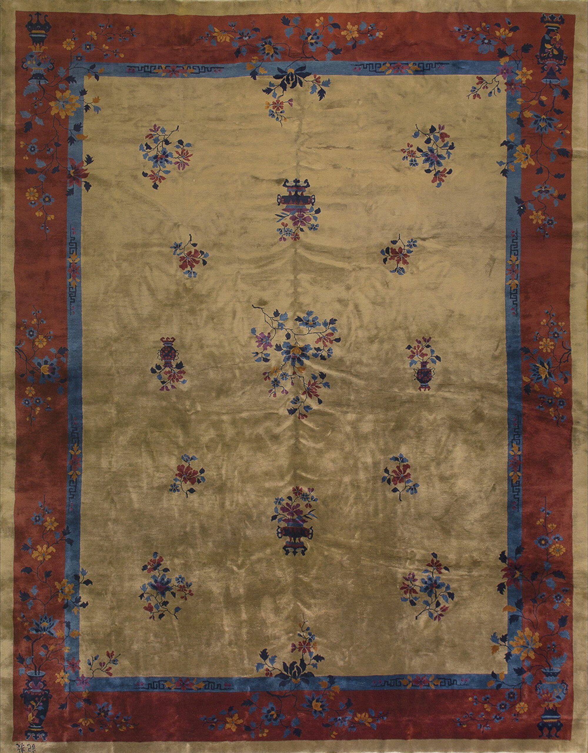 A striking, wide border frames the composition in a deep terracotta red, accented by a narrow band of vivid cobalt blue. Within the border, trailing vines of stylized chrysanthemums and peonies in shades of blue, gold, and crimson create a dynamic, continuous flow. The design’s restraint ensures that the vibrant secondary colors remain elegant rather than overwhelming.