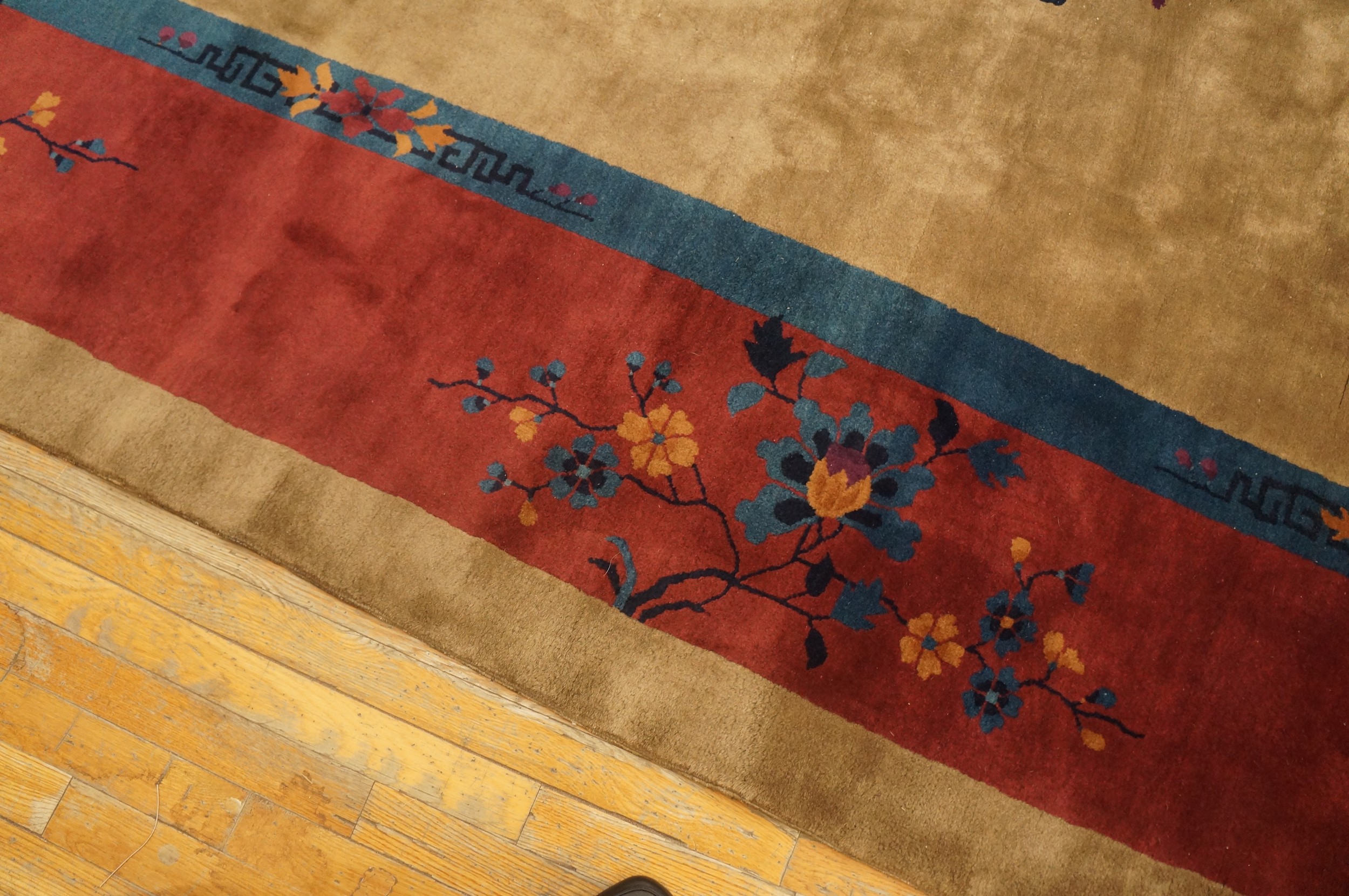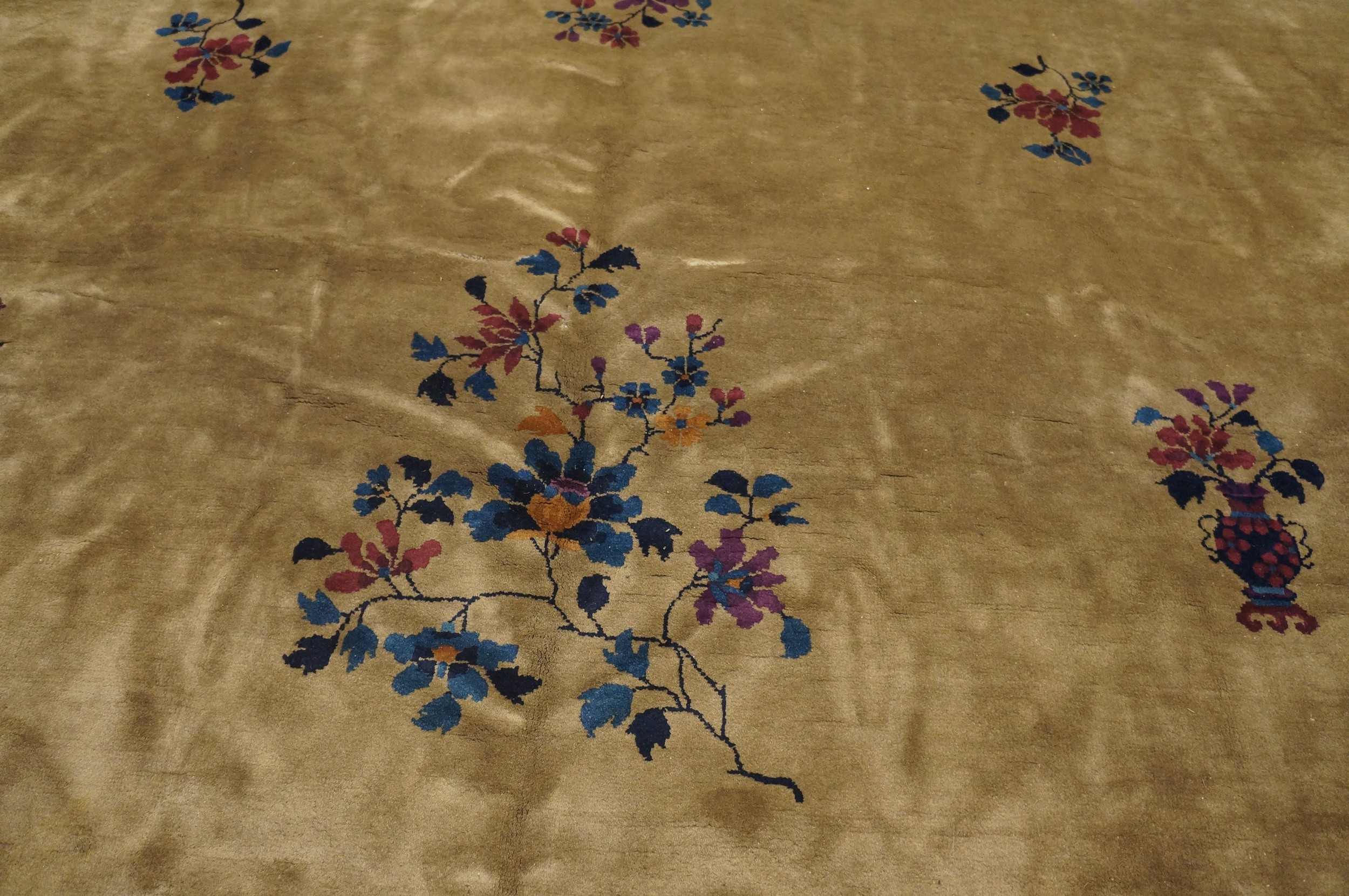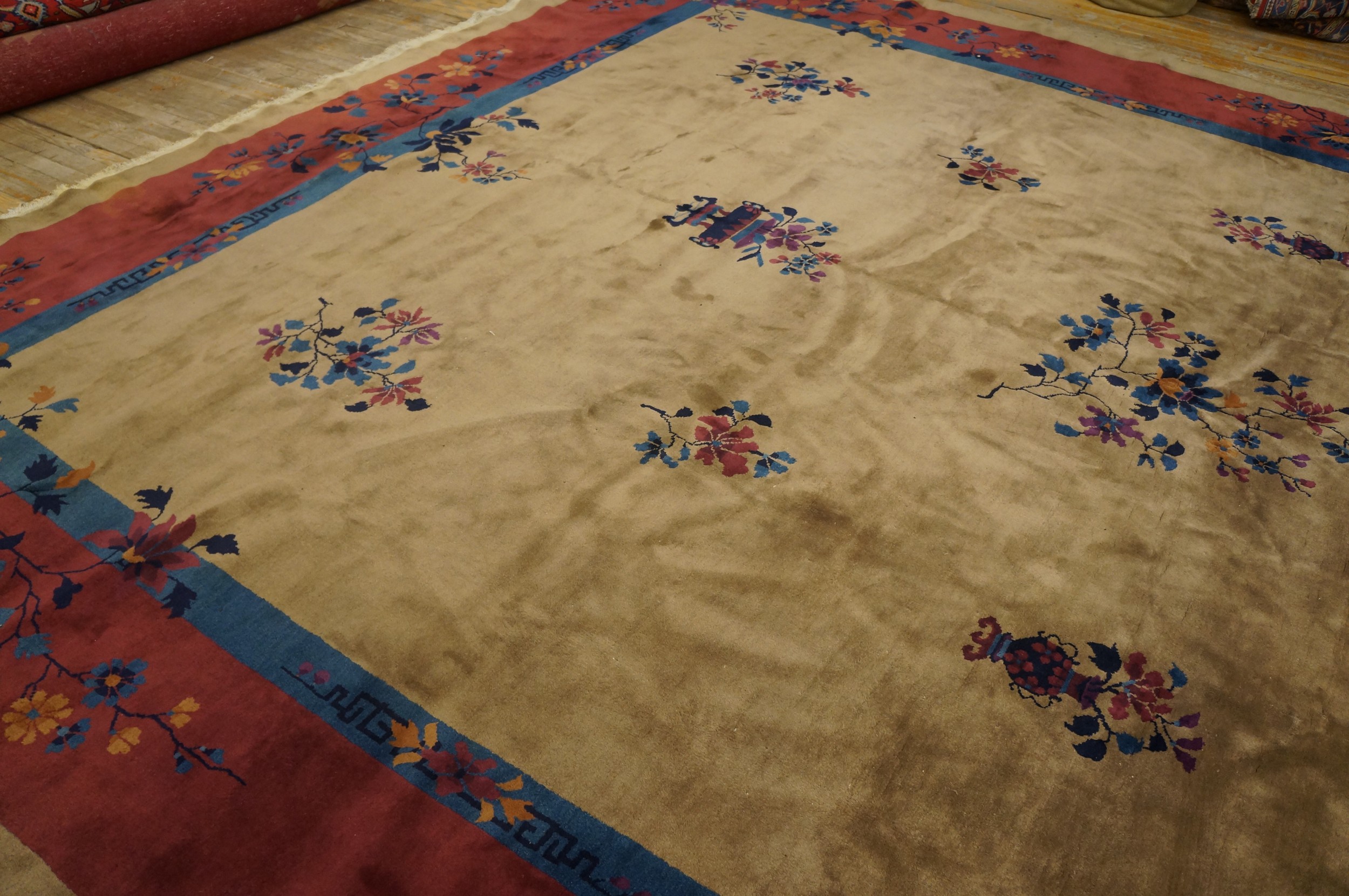 With its impressive dimensions, this piece is classified as a large oversized rug, making it an ideal anchor for a grand living room or formal dining area. The exceptional quality of the wool and the enduring charm of the circa 1925 design ensure that this rug remains a timeless centerpiece, offering both historical value and unmatched decorative appeal.