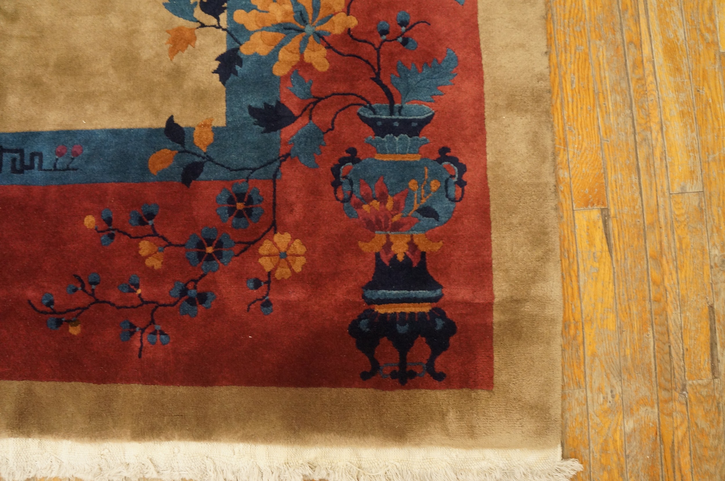 Antique Large Wool – Manchester Ivory Beige Cream White Hand Knotted Pile Rug, Circa Date: 1925. This exquisite piece represents the height of early 20th-century weaving, characterized by its luxurious Manchester wool pile and refined color palette. The rug is a superb example of antique rugs from this period, showcasing a sophisticated balance between traditional Chinese iconography and emerging Art Deco aesthetics.