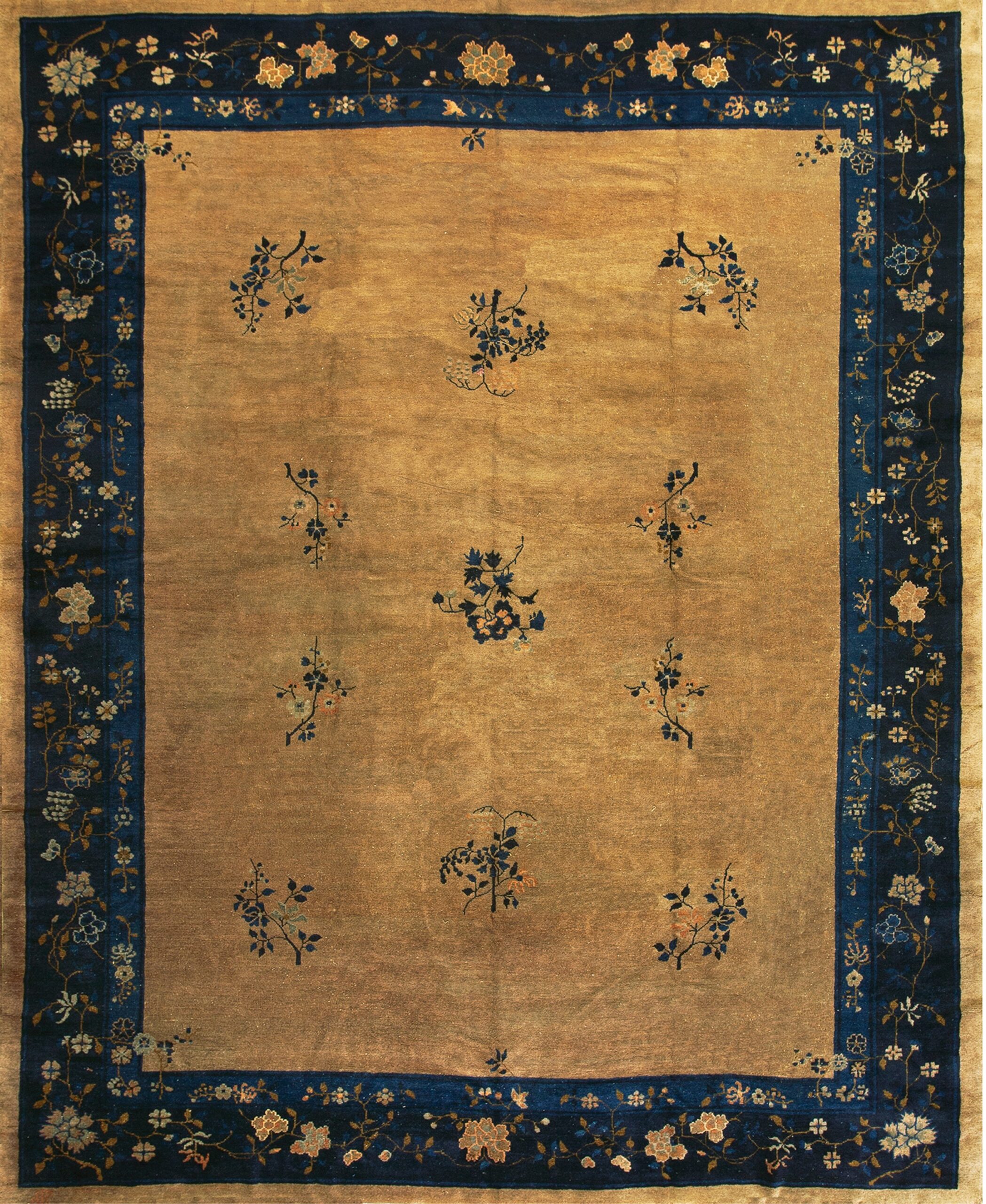Characteristic of the Peking style, the composition favors negative space, allowing delicate, scattered floral sprays to float gracefully across the central expanse. These stylized branches, rendered primarily in shades of blue and soft apricot, lend a poetic simplicity rarely seen in more densely patterned oriental rugs.