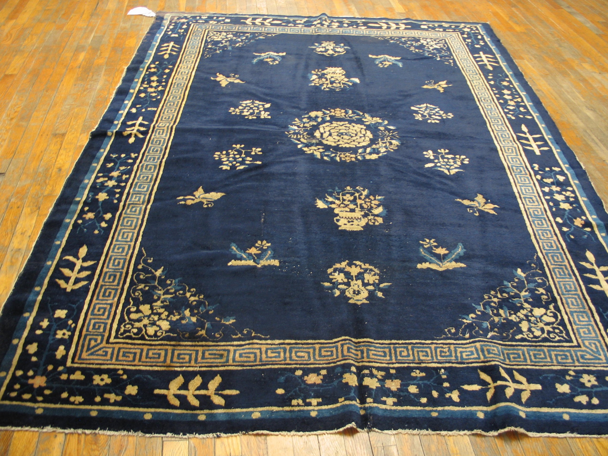 Antique Rectangle 1900s Blue Wool Hand Knotted Pile Rug, Circa Date: 1900s. This exceptional Chinese textile, likely woven in the Peking region, represents the sophisticated aesthetic of early 20th-century antique rugs. Its generous proportions and high-quality hand-knotted wool pile make it a substantial and enduring decorative statement, reflecting the period’s masterful craftsmanship.