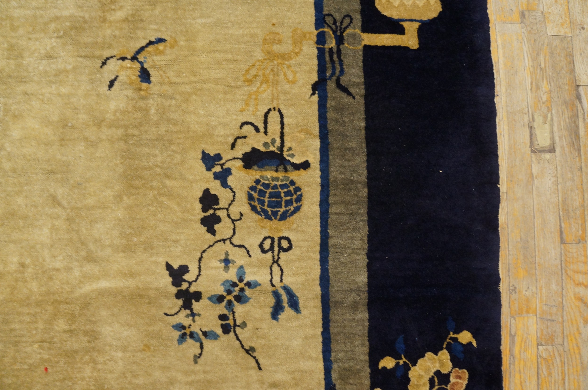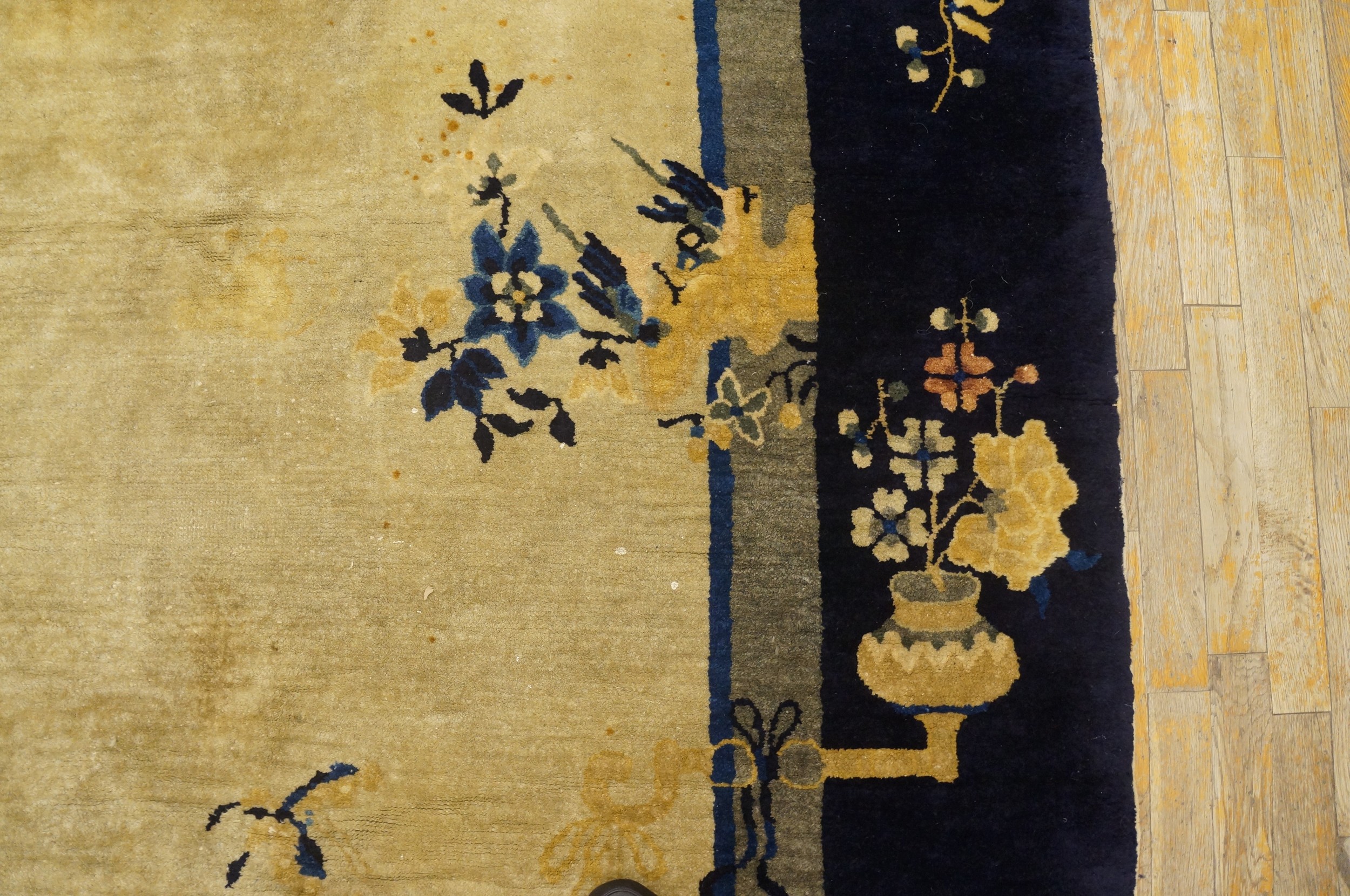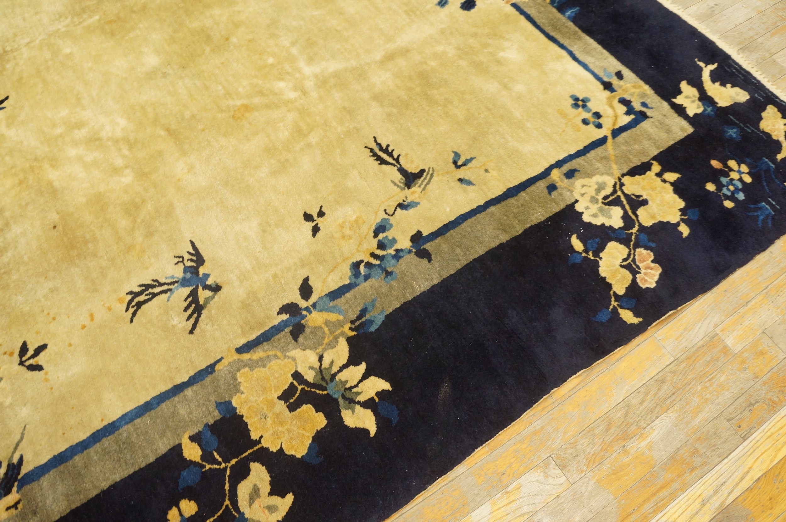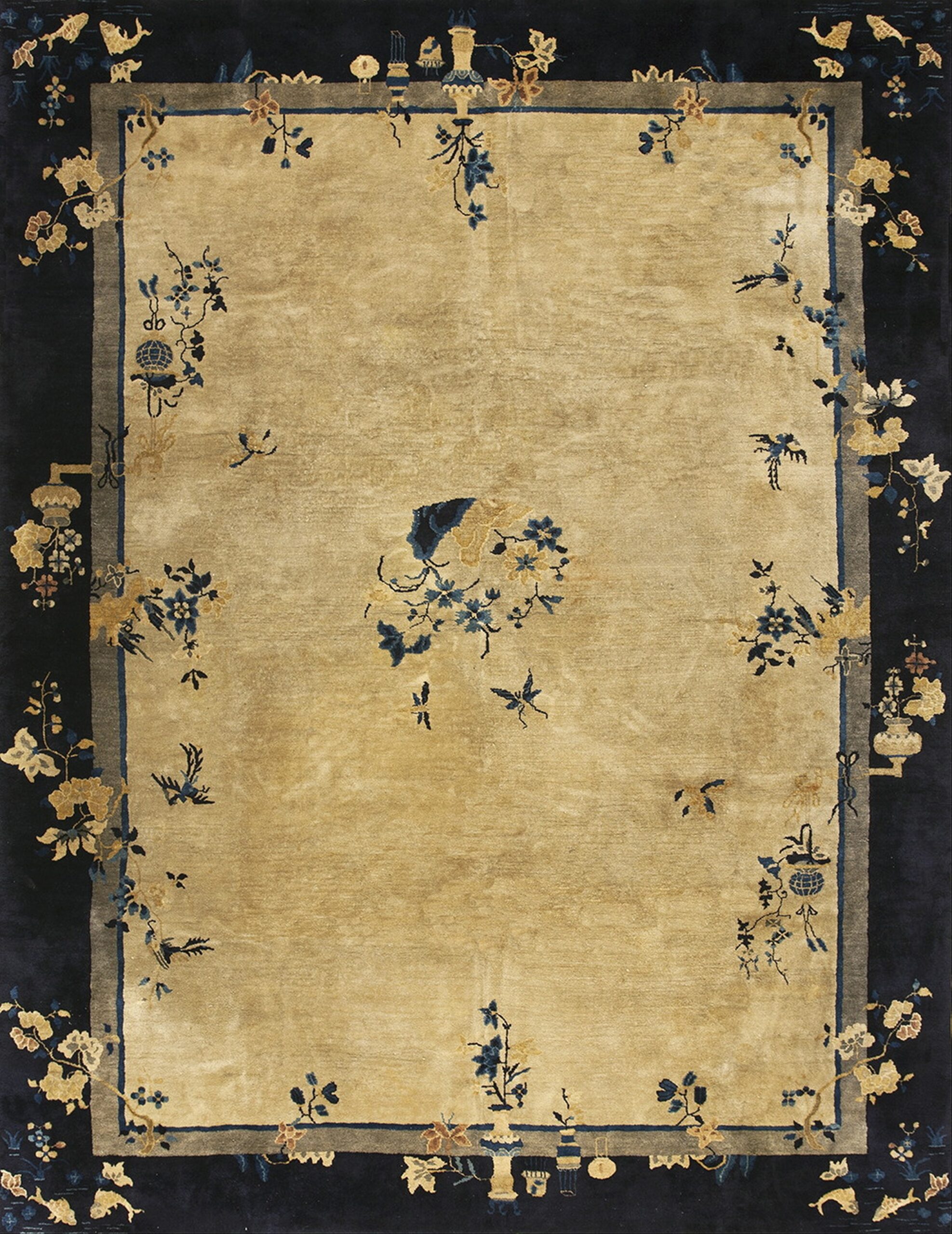 Characteristic of the period’s departure from dense traditional patterns, the design features a beautifully sparse arrangement of traditional Chinese symbols. Scattered floral sprays, vases, and butterflies drift across the open field, showcasing the mastery of the weavers who produced these exceptional antique rugs.