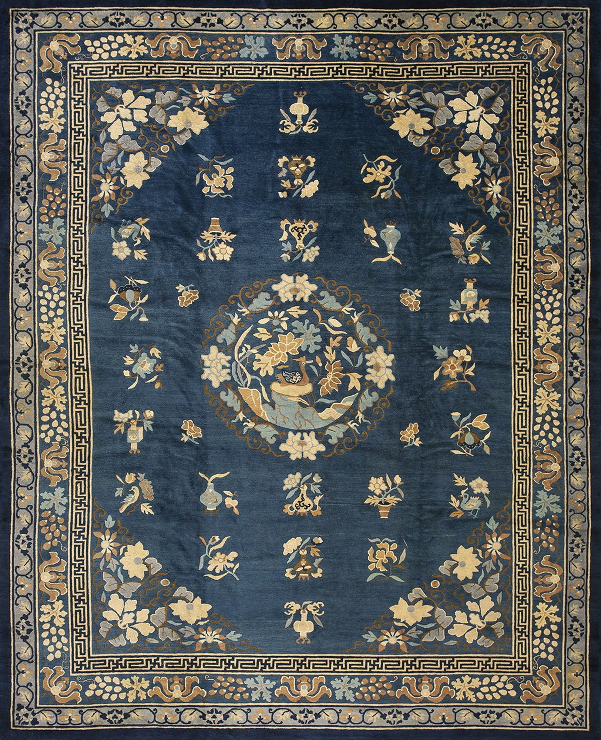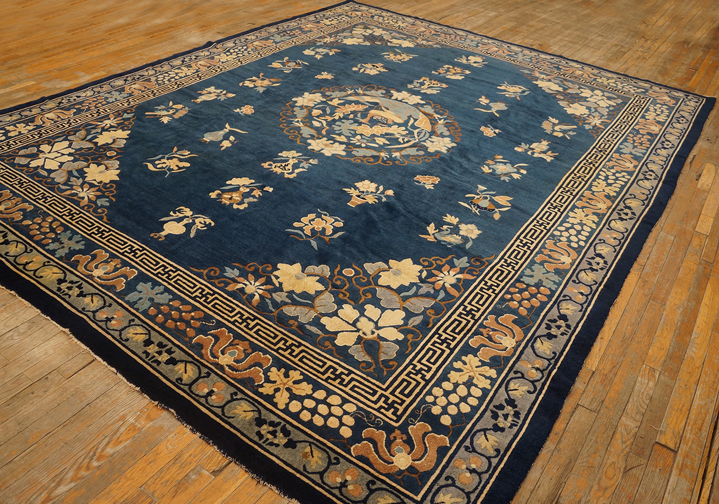 The complex border system, incorporating both traditional Chinese fretwork (the key pattern) and lush, scrolling grapevines, frames the composition with architectural precision. Pieces of this age and quality are increasingly rare, representing the pinnacle of late 19th-century antique rugs production from the Peking region, offering both aesthetic beauty and significant collectible value.