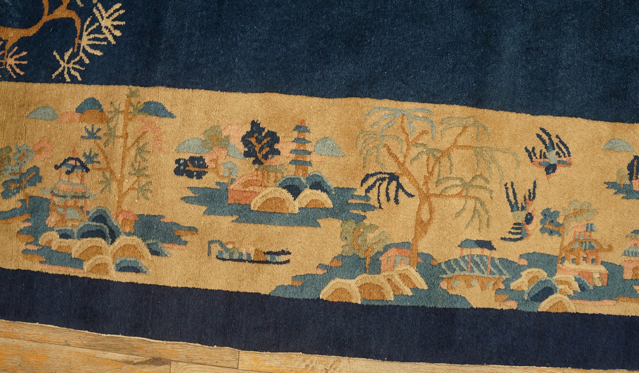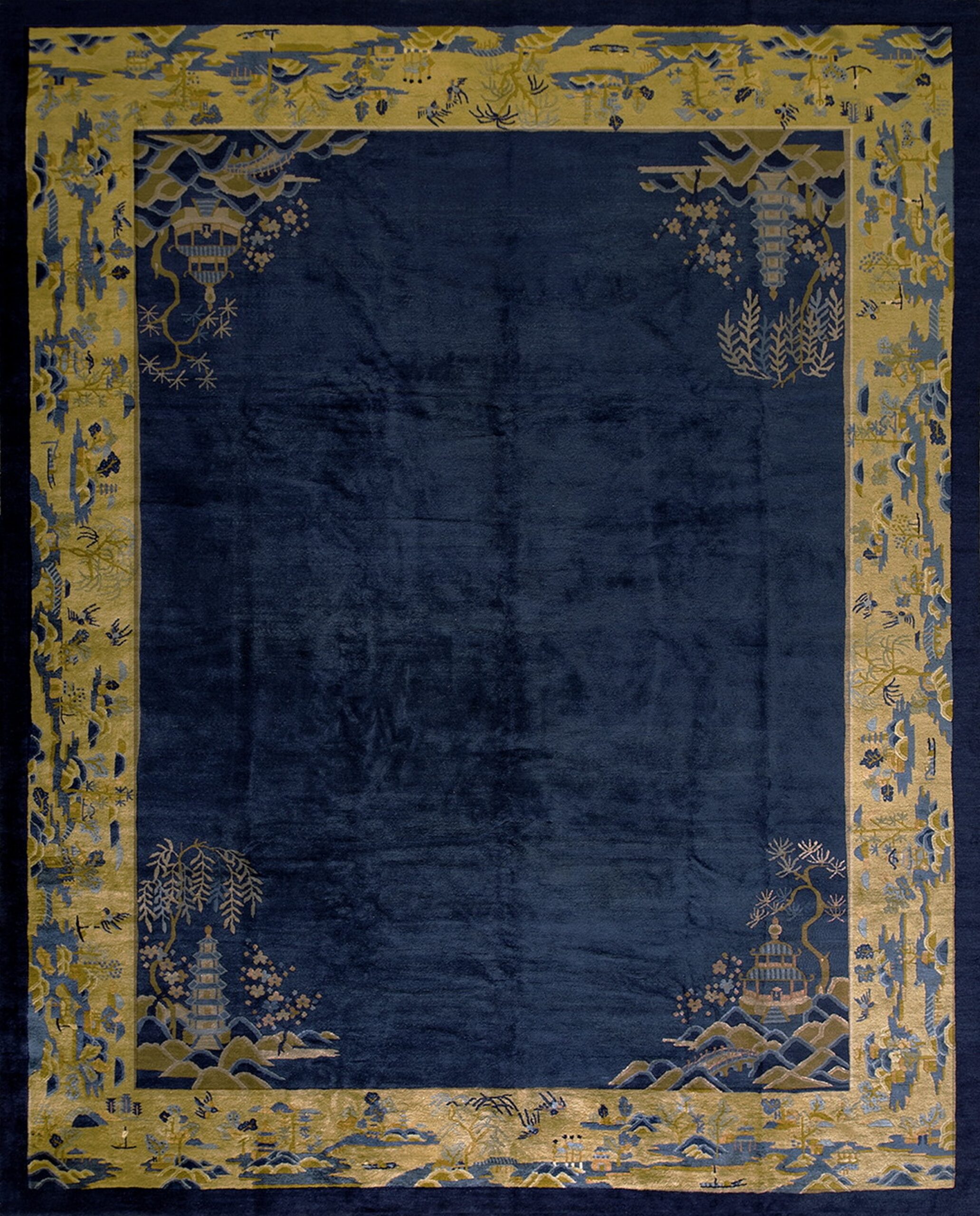 The expansive central field is rendered in a magnificent, velvety navy blue, a hue highly prized during the Republican period. This rich saturation highlights the luxurious quality of the hand-spun wool and the masterful dyeing techniques employed by the Peking workshops. Collectors seeking textiles featuring this depth of tone will appreciate this piece among our finest blue color rugs.