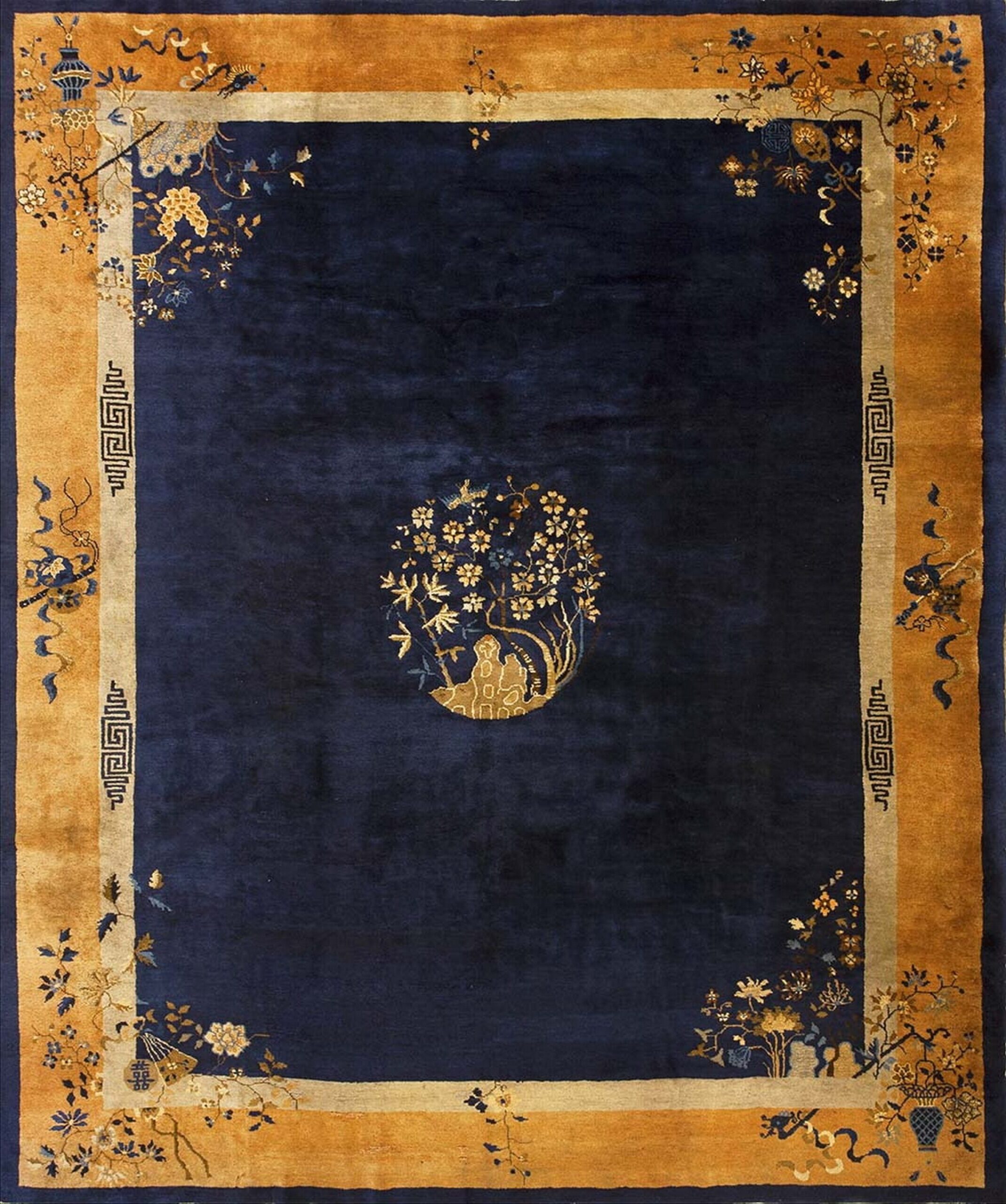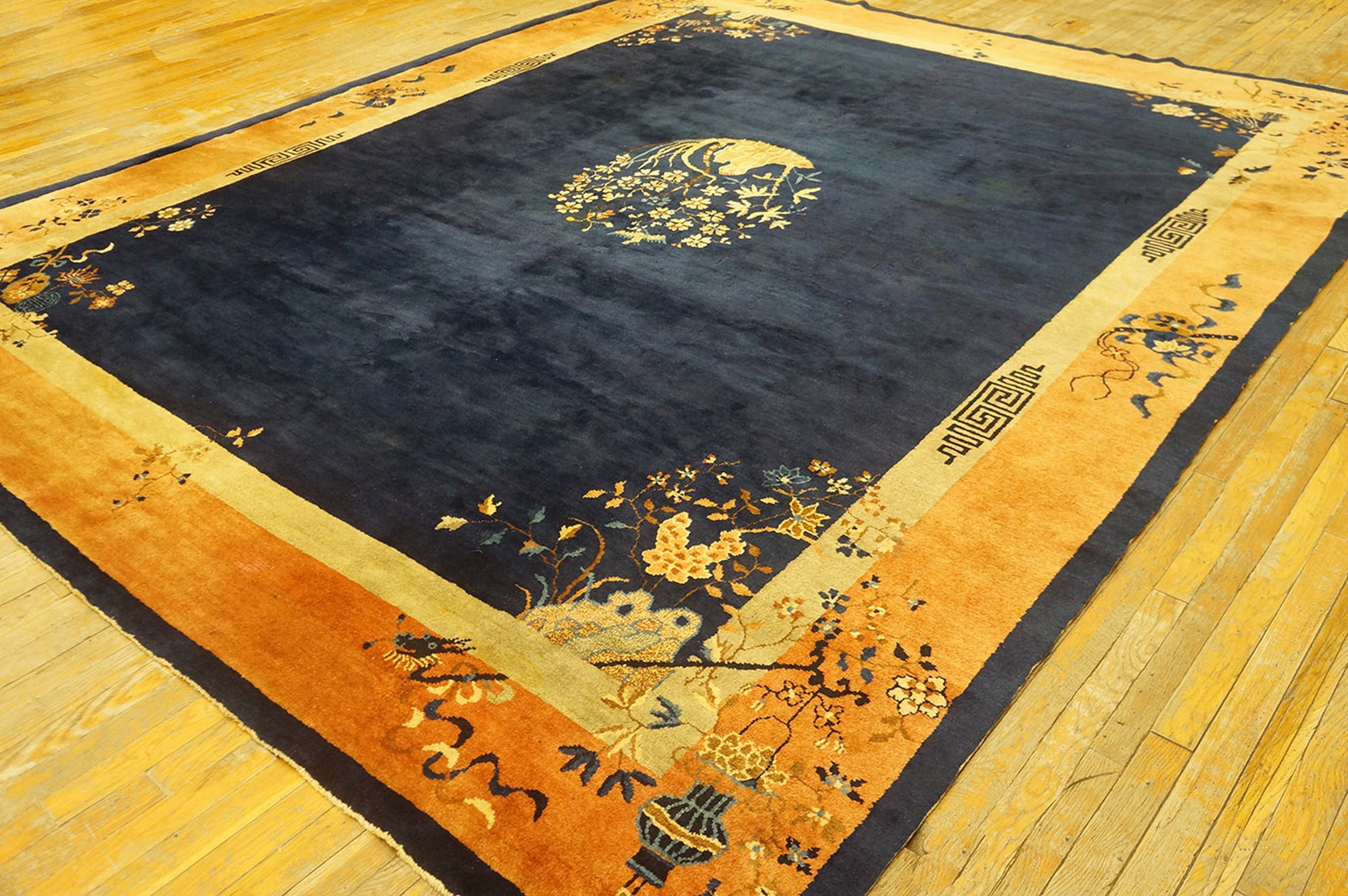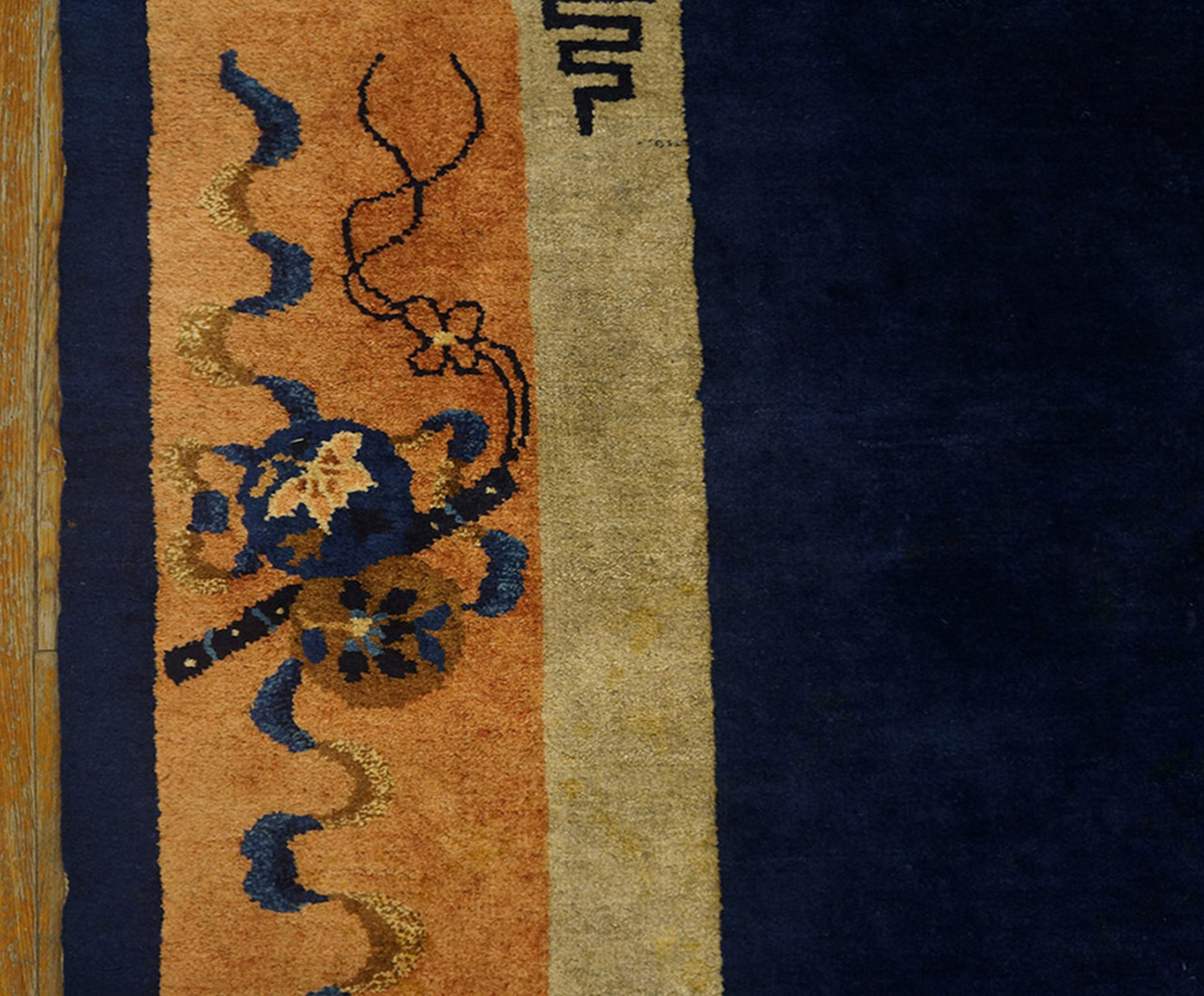 Antique Peking Room Size Wool Blue Navy, Yellow / Gold / Orange Rug, Circa Date: 1920s. This magnificent example of Chinese Art Deco weaving represents the height of the Peking style during the Republican Era. Its generous dimensions classify it among the most sought-after room size rugs available from this period.