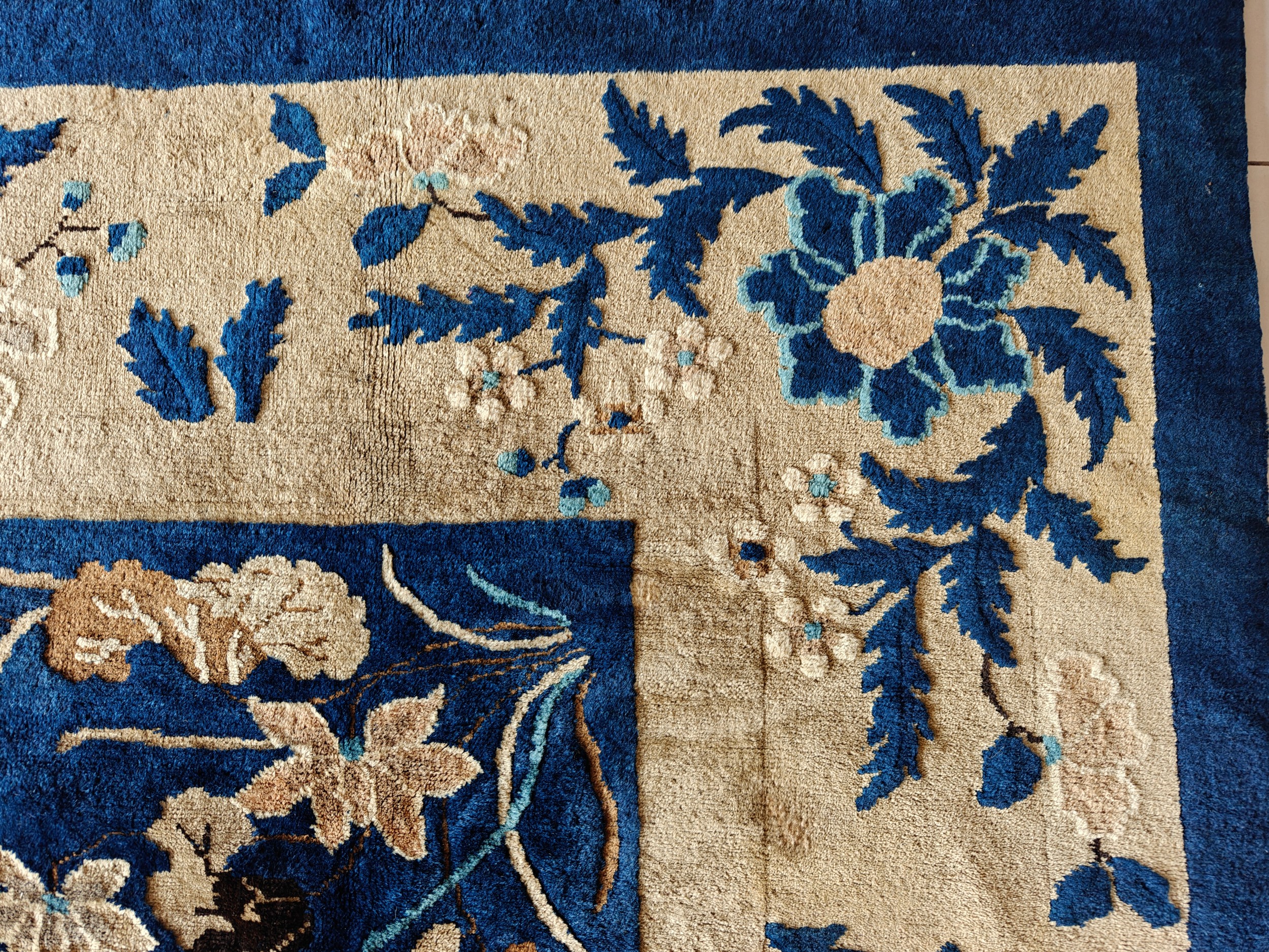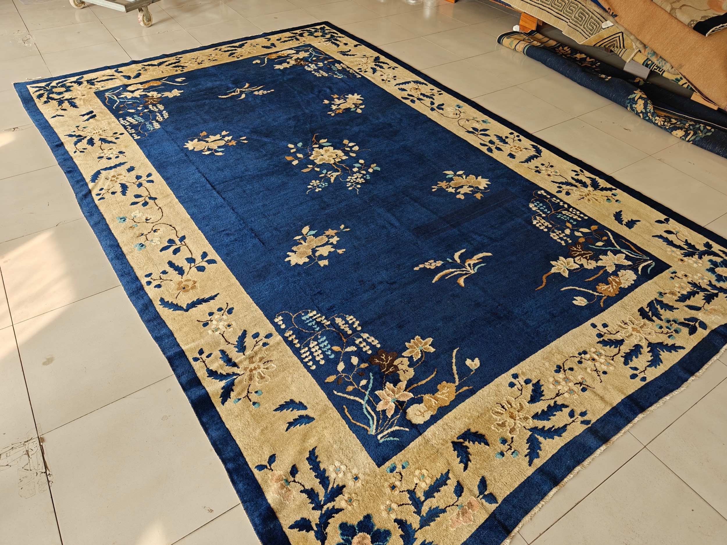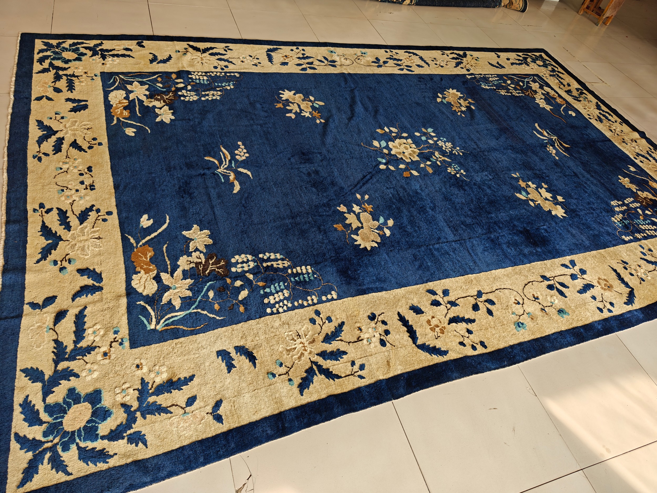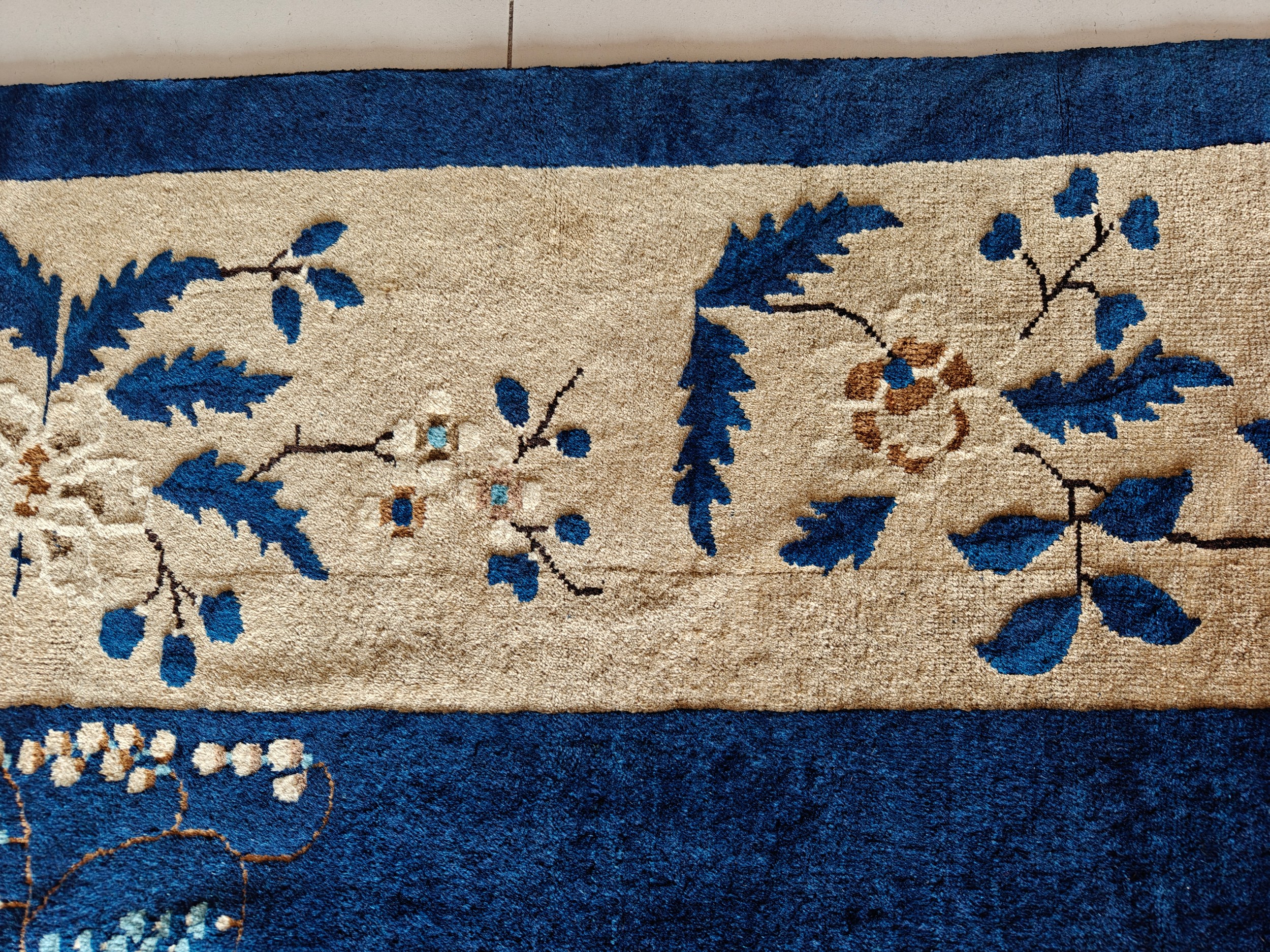 Antique Peking Room Size Wool Blue Rug, Circa Date: 1920s. This magnificent example of early 20th-century Chinese weaving presents a striking contrast of color and texture. The expansive central field is rendered in a rich, saturated indigo, providing a dramatic backdrop for the delicate design elements. This specific shade of blue color is characteristic of the finest Peking production of the era.