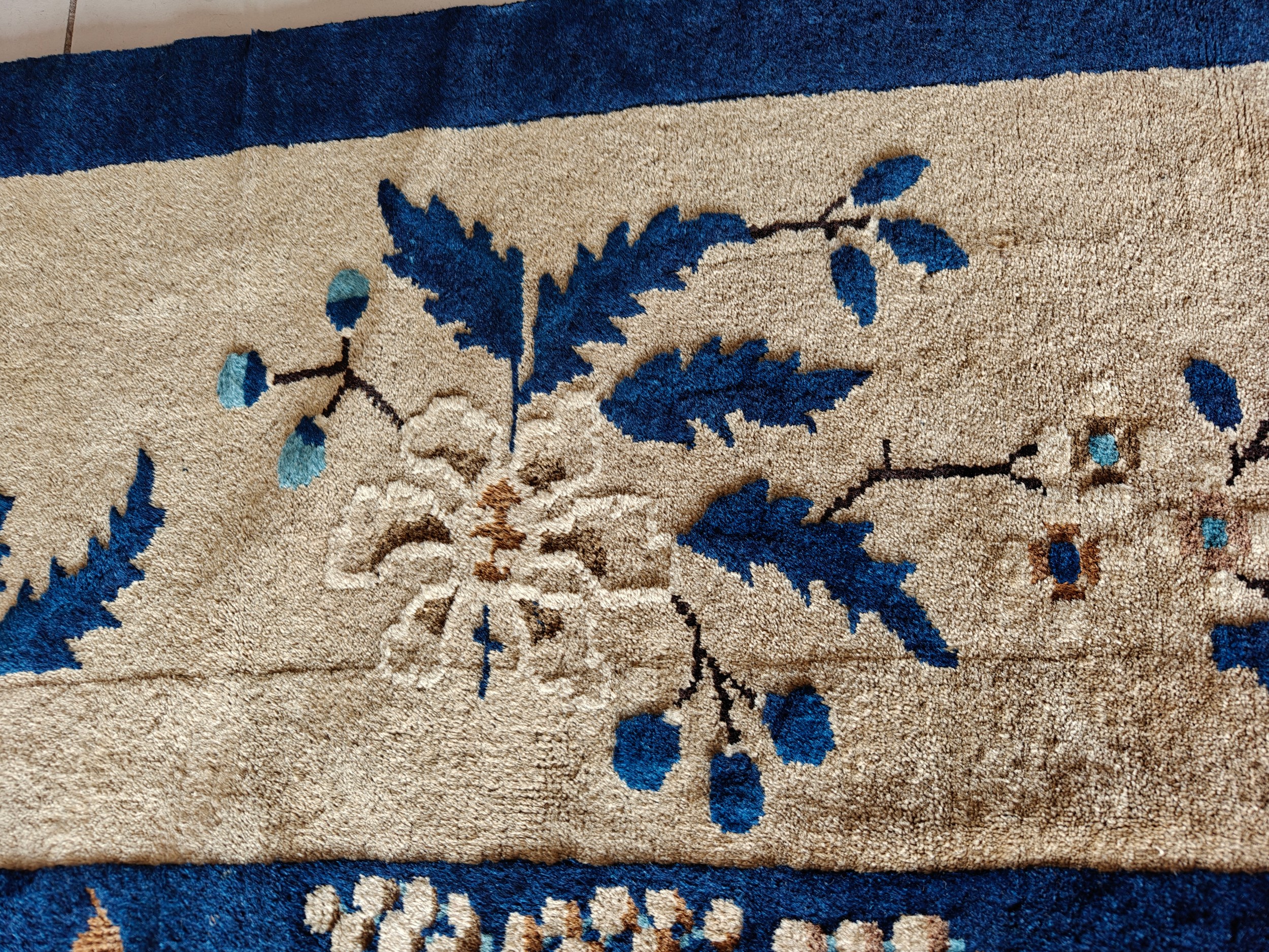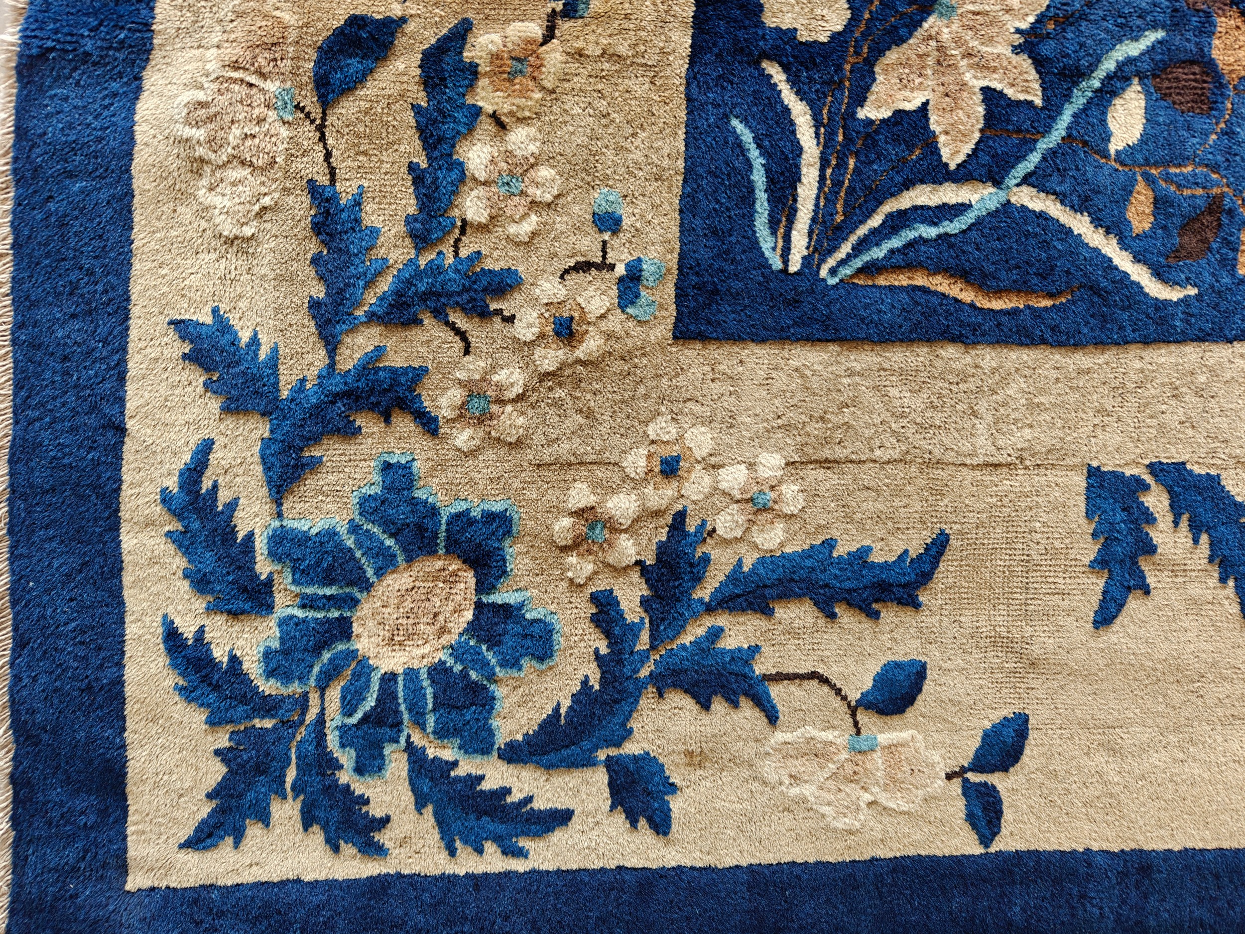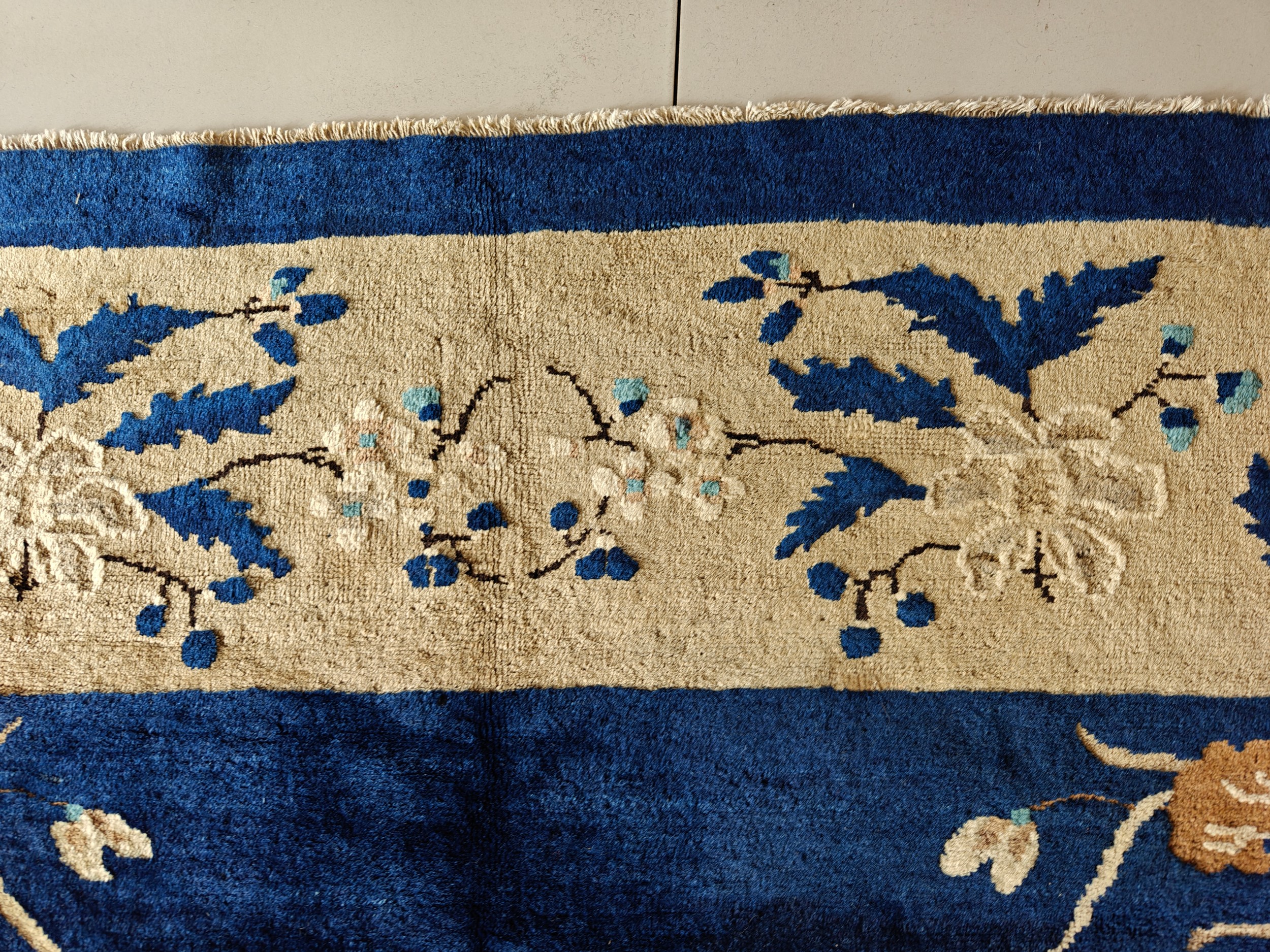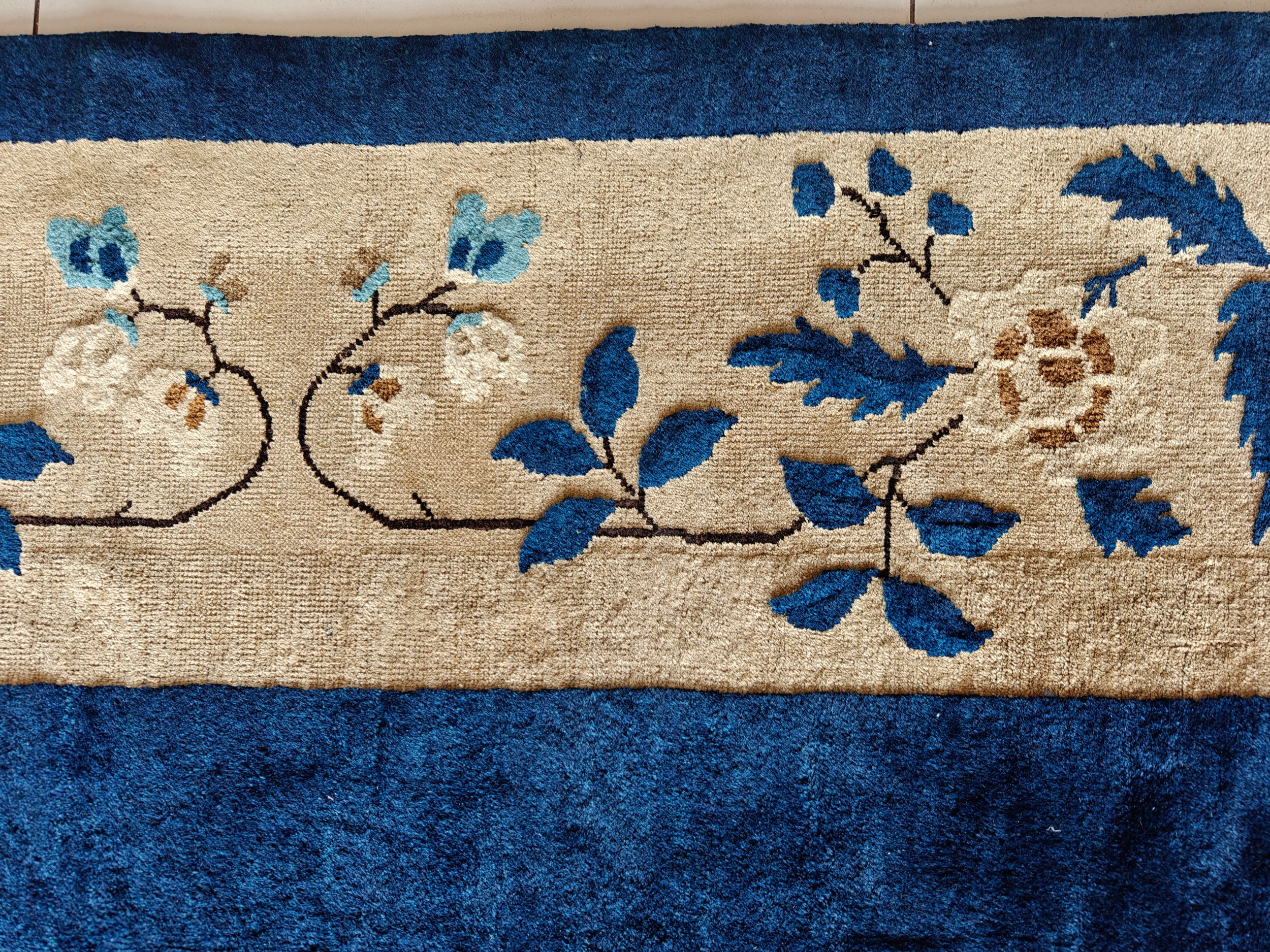 Antique Peking Room Size Wool Blue Rug, Circa Date: 1920s. This magnificent example of early 20th-century Chinese weaving presents a striking contrast of color and texture. The expansive central field is rendered in a rich, saturated indigo, providing a dramatic backdrop for the delicate design elements. This specific shade of blue color is characteristic of the finest Peking production of the era.