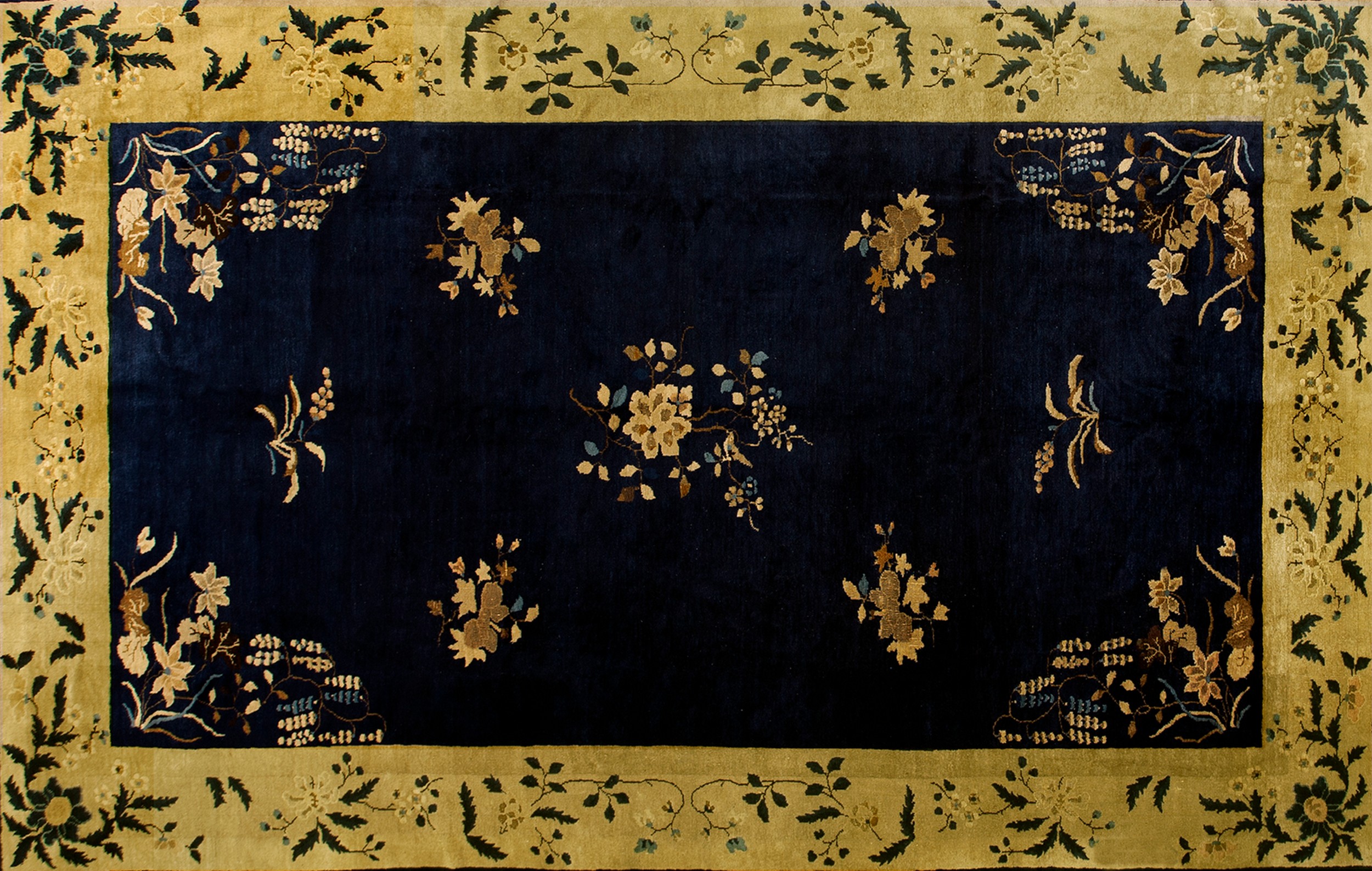 The design employs an elegant, minimalist approach, featuring scattered floral sprays and vines that float across the dark ground. The main border offers a dramatic counterpoint, utilizing a wide band of luminous gold-ochre wool, densely populated with stylized blossoms and trailing foliage. This piece represents a sophisticated evolution of oriental rug aesthetics during the Republican period.