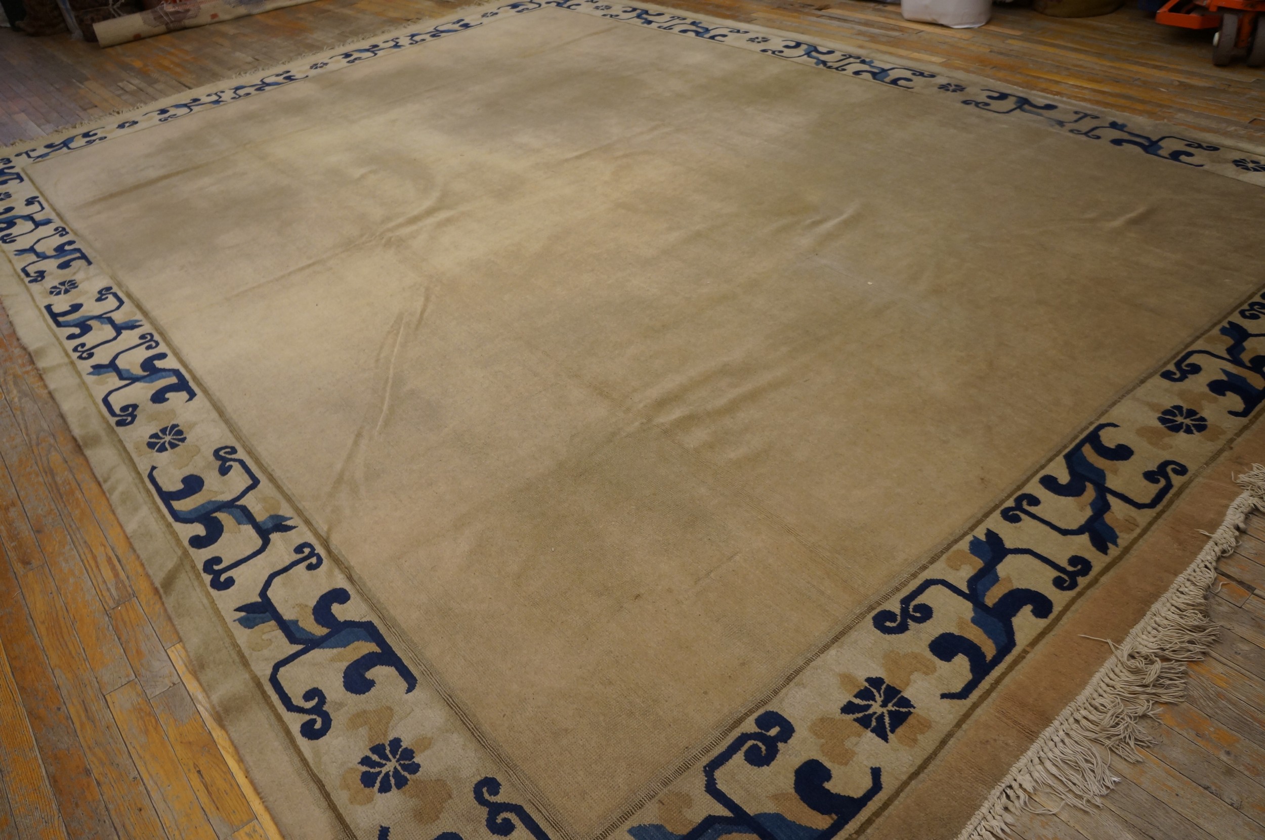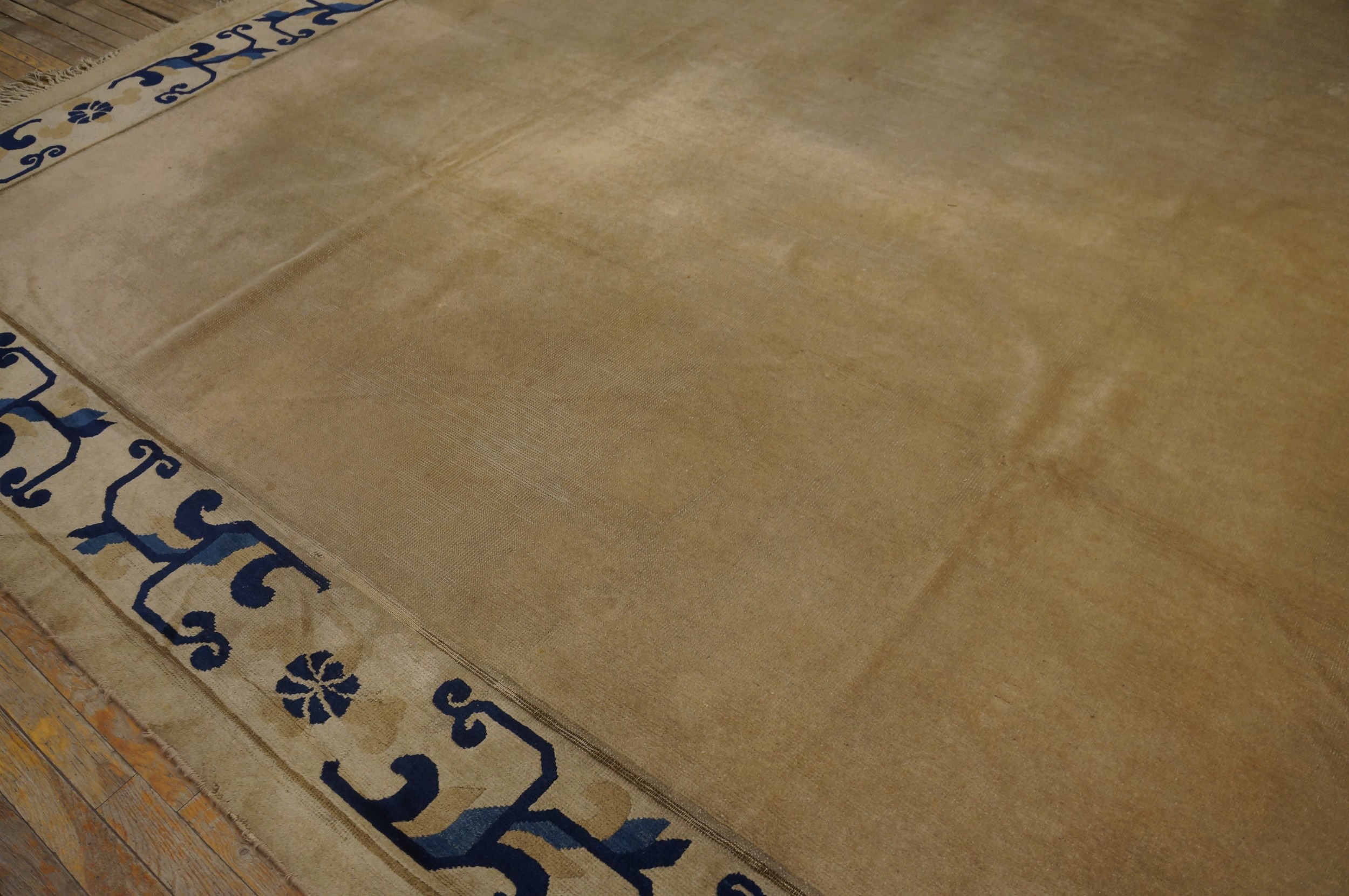 Antique Peking Room Size Wool Ivory Beige Cream White Rug, Circa Date: 1920s. This exceptional Chinese textile embodies the restrained elegance of early 20th-century weaving. Its generous dimensions make it a true room size rug, perfectly suited to anchor a large living space while providing a foundation of quiet sophistication.