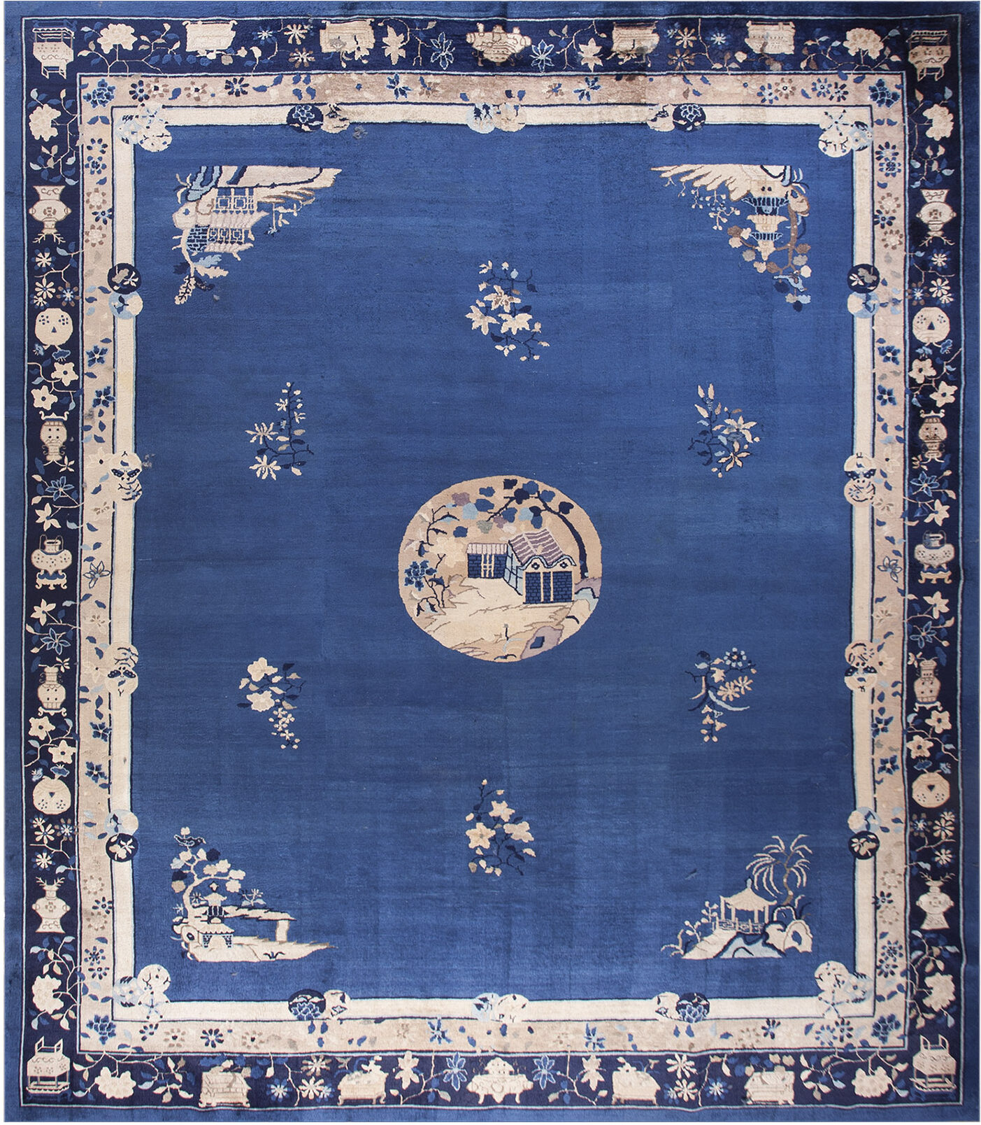 The expansive field is rendered in a saturated indigo blue, providing a dramatic canvas for the detailed motifs. While the palette leans toward deep blue, the overall effect is one of profound depth, often categorized alongside black color rugs due to its intensity. The central circular medallion presents a finely detailed pastoral scene, a hallmark of the Peking style.