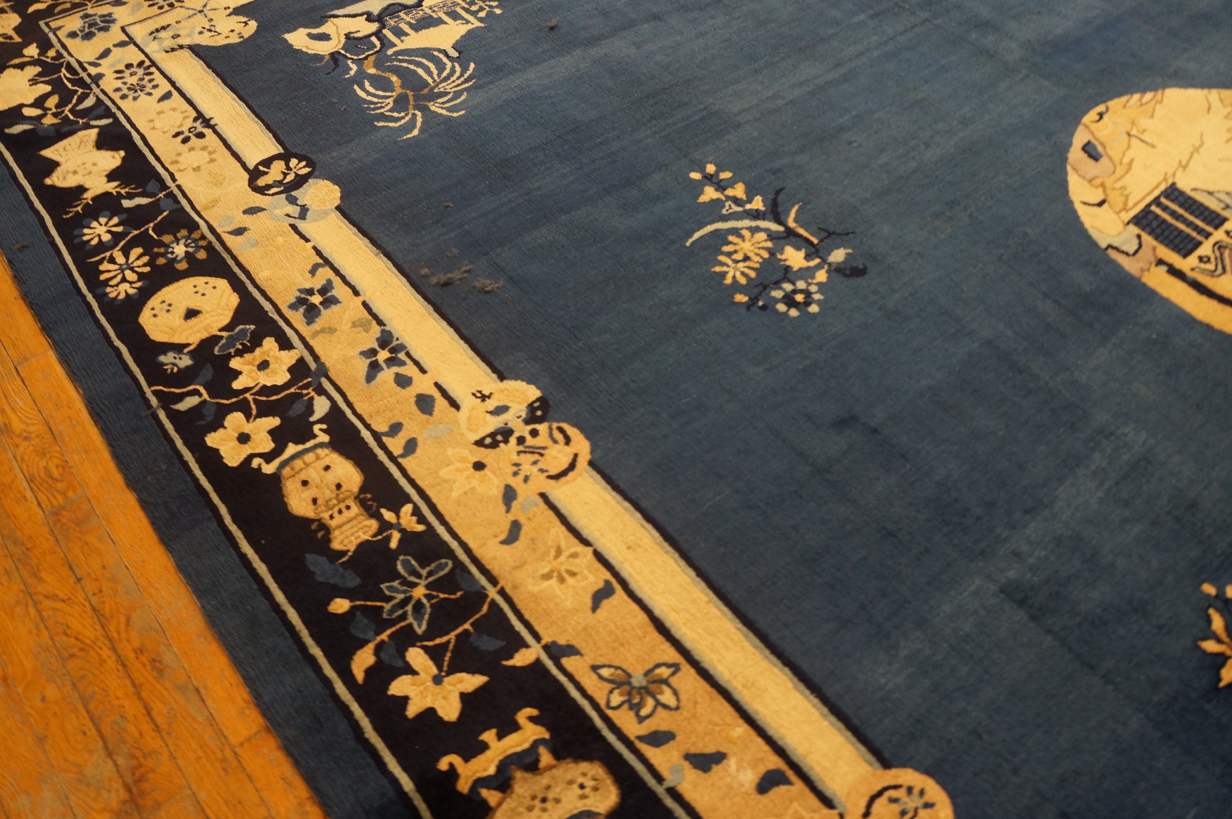 A complex series of borders frames the composition, featuring traditional Chinese symbols such as the “Hundred Antiques” and stylized floral elements executed in soft creams and pale blues. Woven entirely in high-quality wool, this Peking masterpiece retains the soft luster and durable handle characteristic of fine Chinese textiles from the turn of the century.