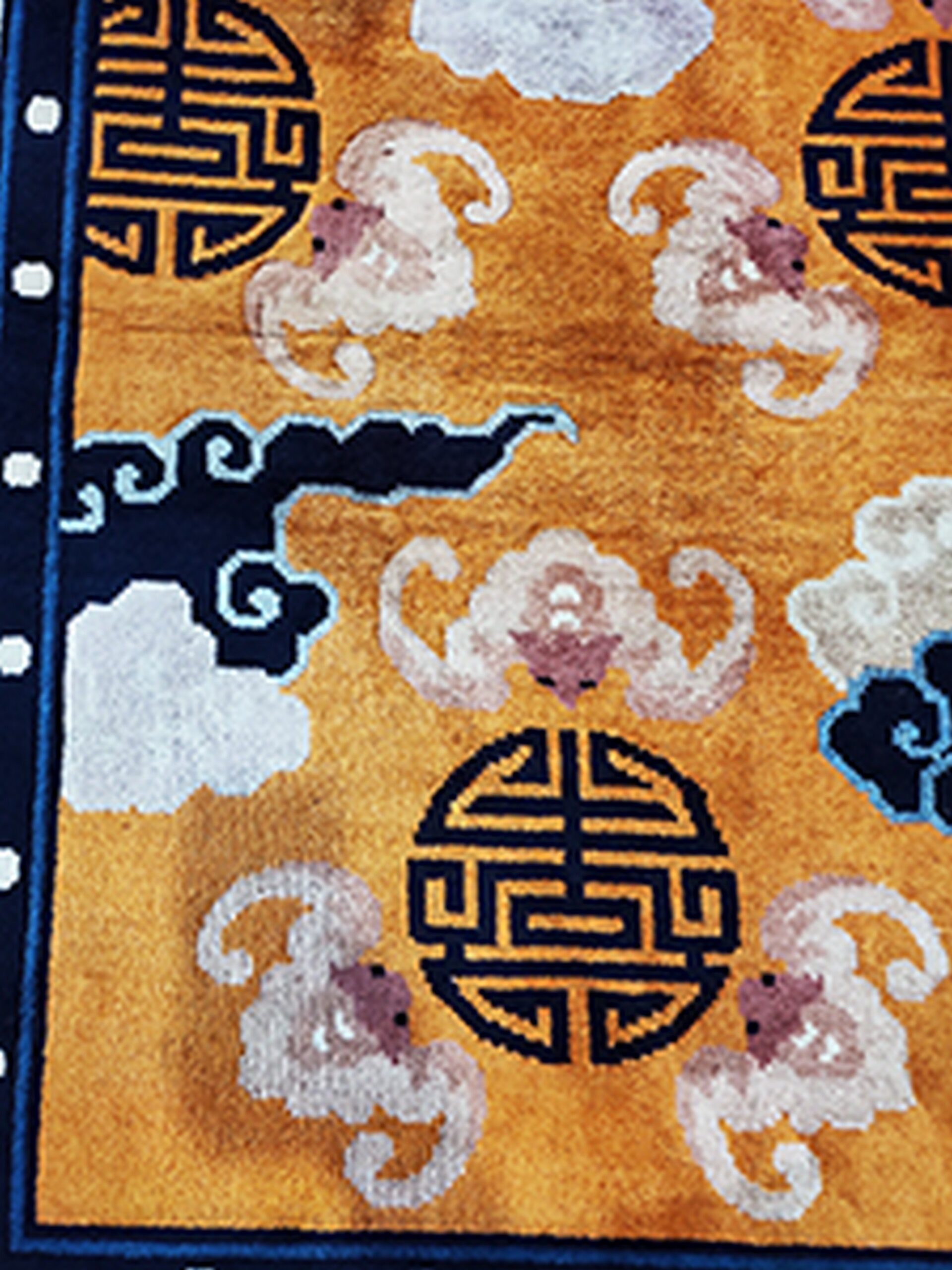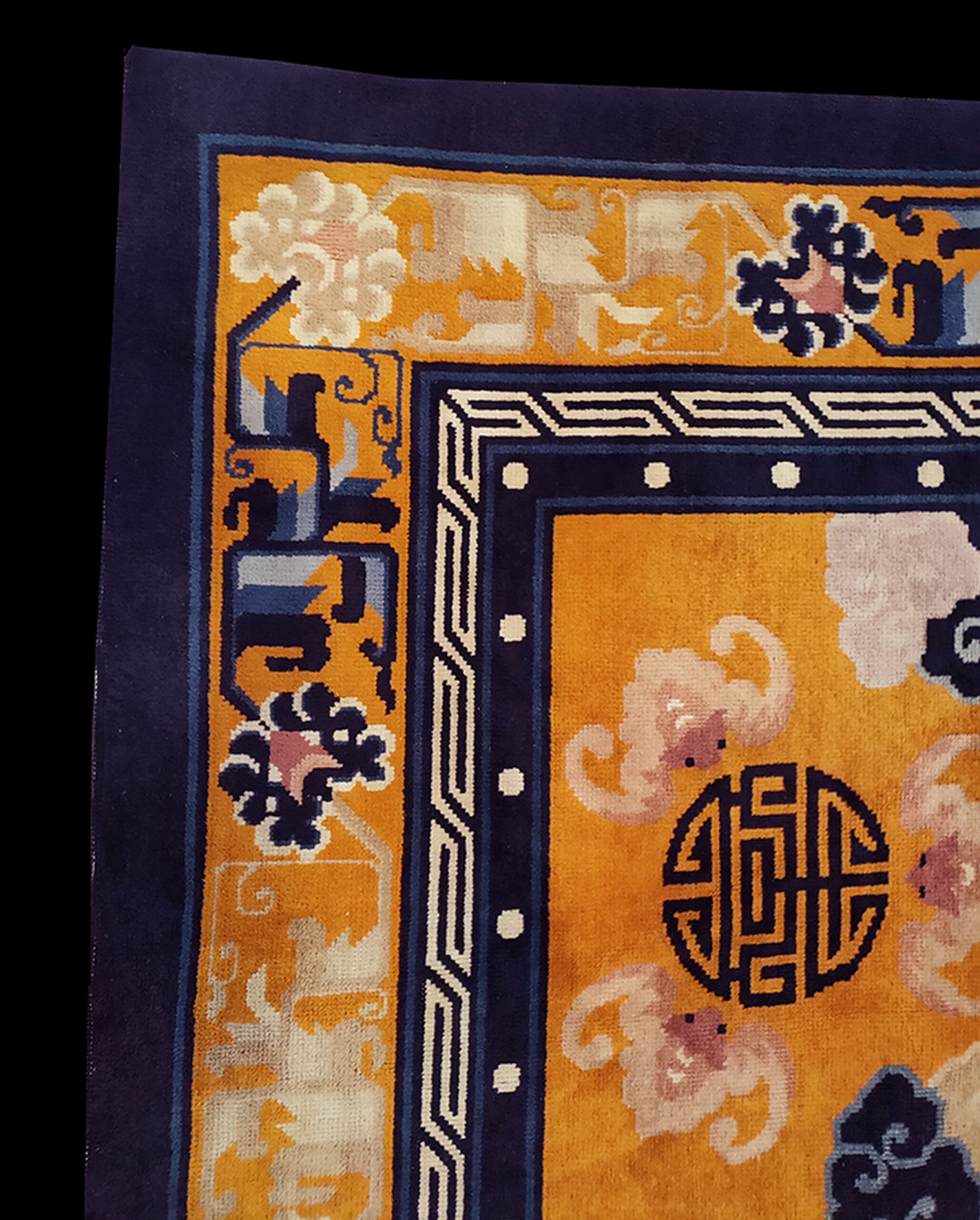 The brilliant saffron field is heavily saturated, providing a dramatic backdrop for the traditional Chinese iconography. This exceptional example showcases the powerful impact of gold yellow orange color rugs, utilizing a palette that balances warmth with the cool contrast of navy and pale blue cloud motifs. Repeating circular Shou symbols, representing longevity, are meticulously rendered across the surface.