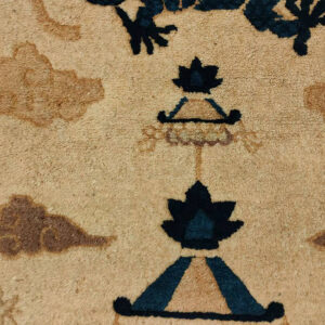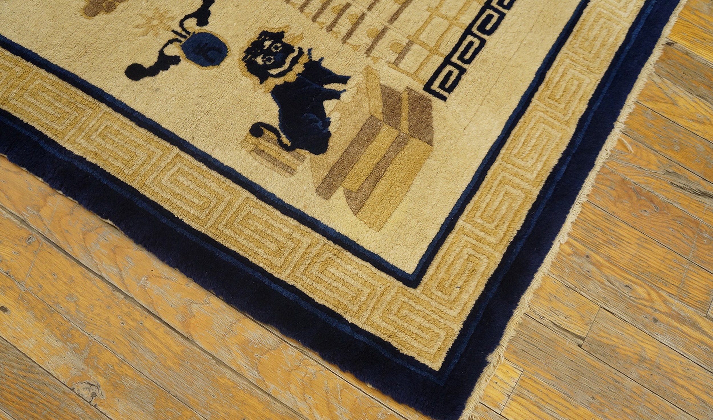 Antique Peking Small Scatter Size Wool Blue, Ivory Beige Cream White Rug, Circa Date: 1900s. This exceptional Chinese textile captures the refined aesthetic of early 20th-century court artistry. Woven entirely of wool, this piece exemplifies the highly symbolic and pictorial designs characteristic of antique rugs from the region, often commissioned for high-status homes or governmental use.