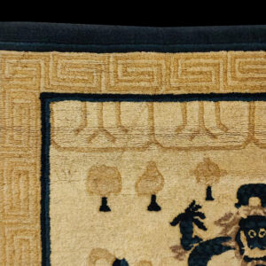 The palette is intentionally restrained, featuring a creamy ivory ground that allows the striking indigo and subtle beige accents to achieve maximum contrast and visual depth. The primary border employs a classic Chinese meander or Greek key pattern, framing the pictorial scene with geometric precision. This careful interplay of color and geometry defines the rug’s sophisticated presence.
