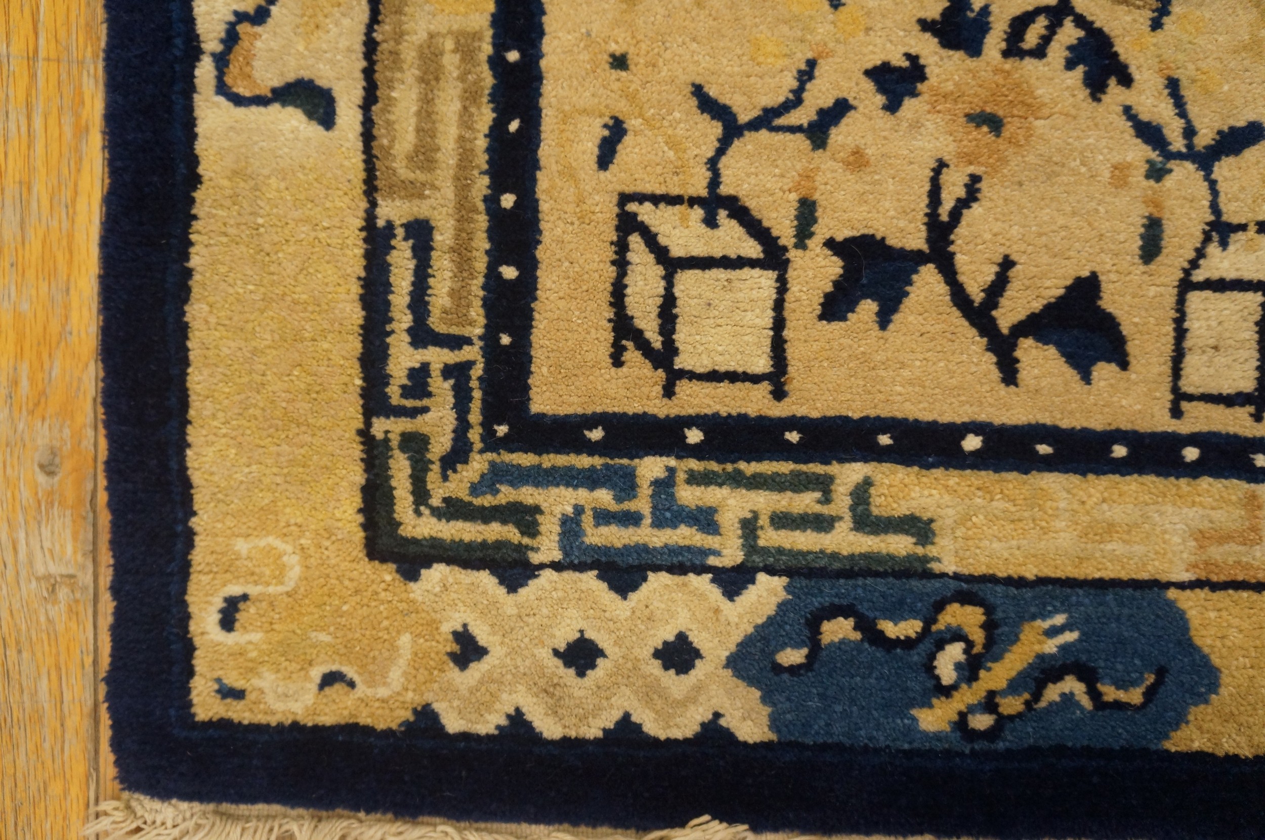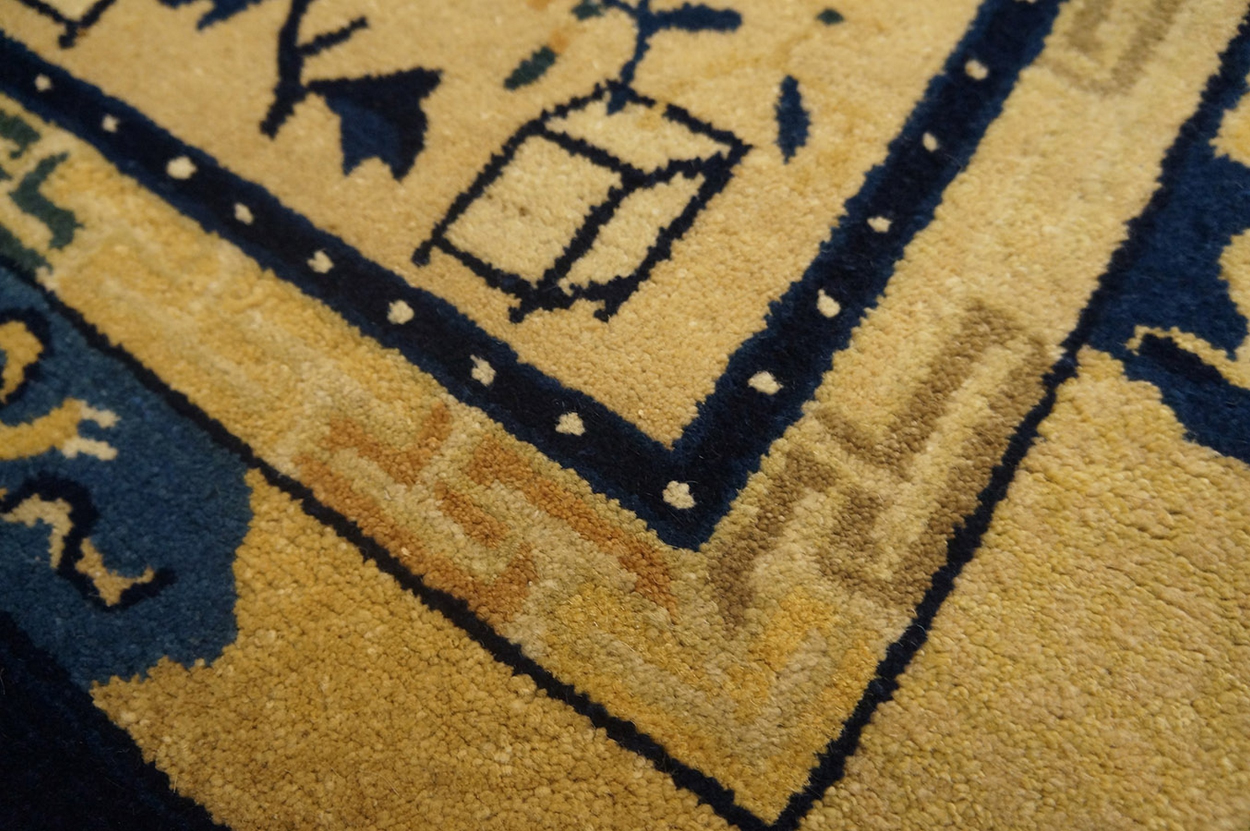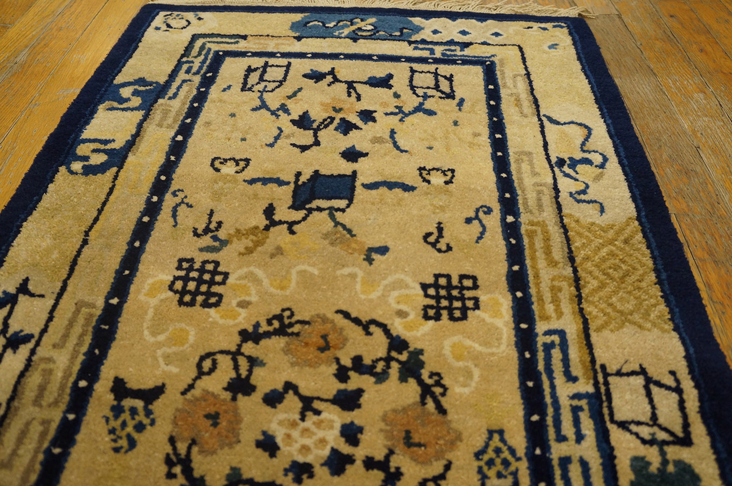 Antique Peking Small Scatter Size Wool Blue Navy, Ivory Beige Cream White Rug, Circa Date: 1900s. This exceptional Chinese Peking carpet, dating from the turn of the 20th century, exemplifies the restrained elegance characteristic of Imperial-era design. The narrow, elongated format makes it a perfect small scatter size piece for hallways or intimate spaces, showcasing a sophisticated balance of negative space and symbolic detail.