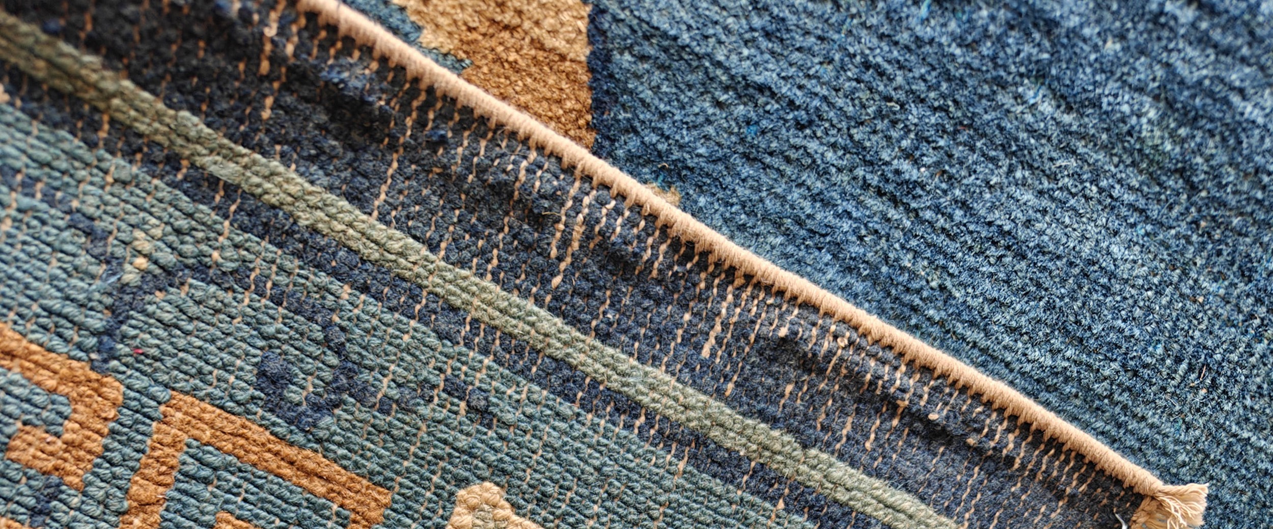 The saturated indigo ground provides a dramatic backdrop for the stylized floral elements rendered in soft cream and ochre tones. This masterful use of depth highlights the sophistication inherent in blue color rugs from this period, offering a powerful visual anchor in any refined interior space.