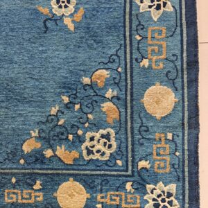 Antique Peking Small Scatter Size Wool Blue Rug, Circa Date: 1920s. This exquisite example of early 20th-century Chinese weaving represents the height of the Peking tradition. Its fine wool pile and classical structure make it a highly desirable piece among antique rugs sought after for their enduring quality and cultural significance.