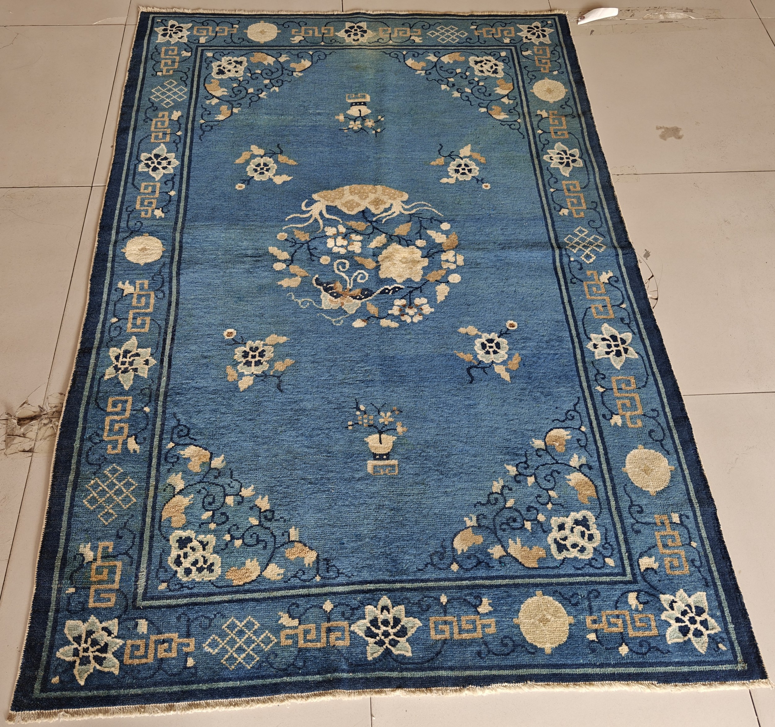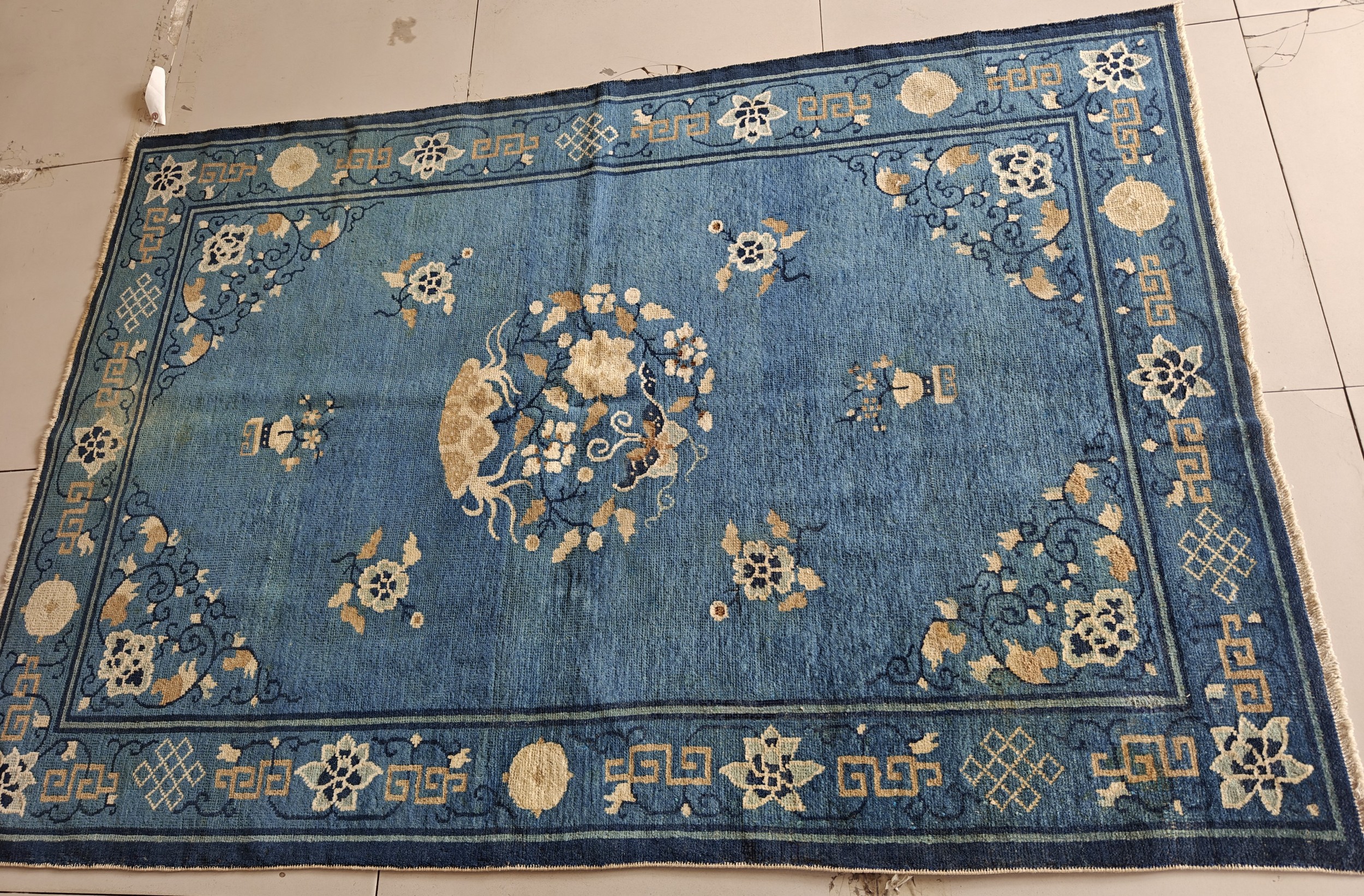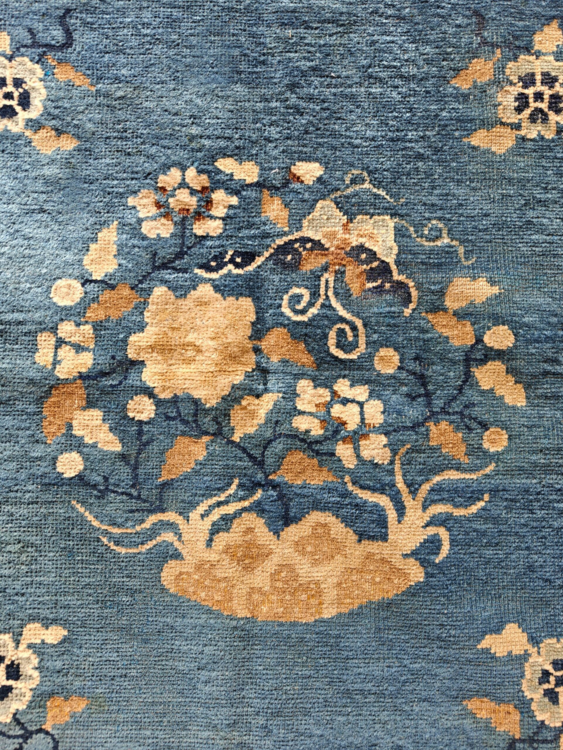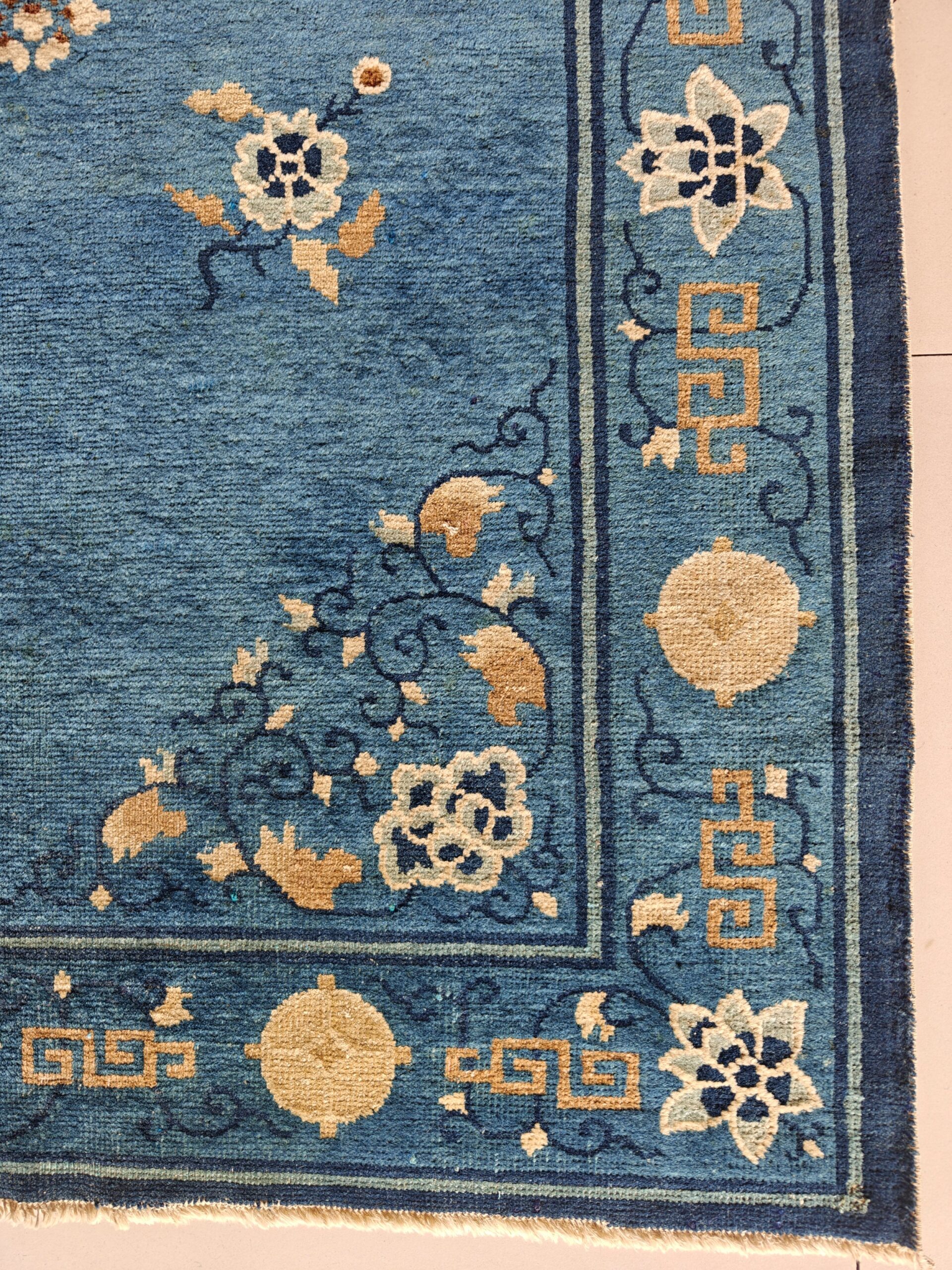 Examining the border reveals classical Chinese fretwork interspersed with auspicious symbols, including the Endless Knot and circular medallions. These traditional elements often served as protective symbols within the home, adding layers of cultural meaning to the rug’s decorative function.