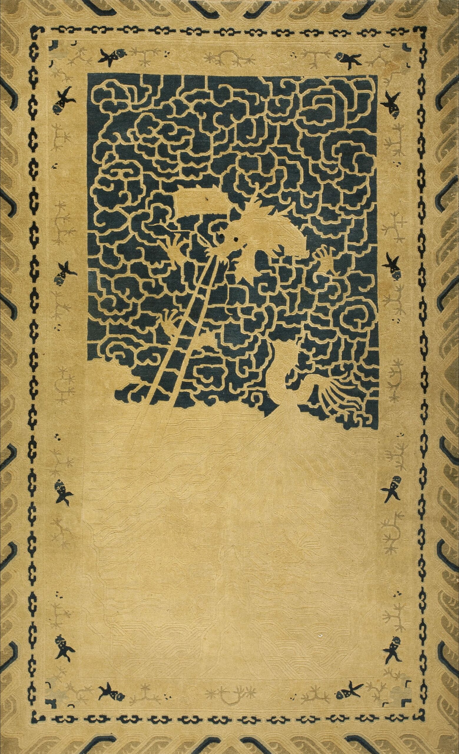 The central design is dominated by an ascending imperial dragon, rendered in the golden hue, climbing through dense, stylized clouds (the *lingzhi* motif). The dragon, a potent symbol of power and good fortune, is depicted mid-ascent, creating a dynamic sense of movement against the dark background. This dramatic, asymmetrical layout is characteristic of the finest antique rugs produced during this period of Chinese textile innovation.