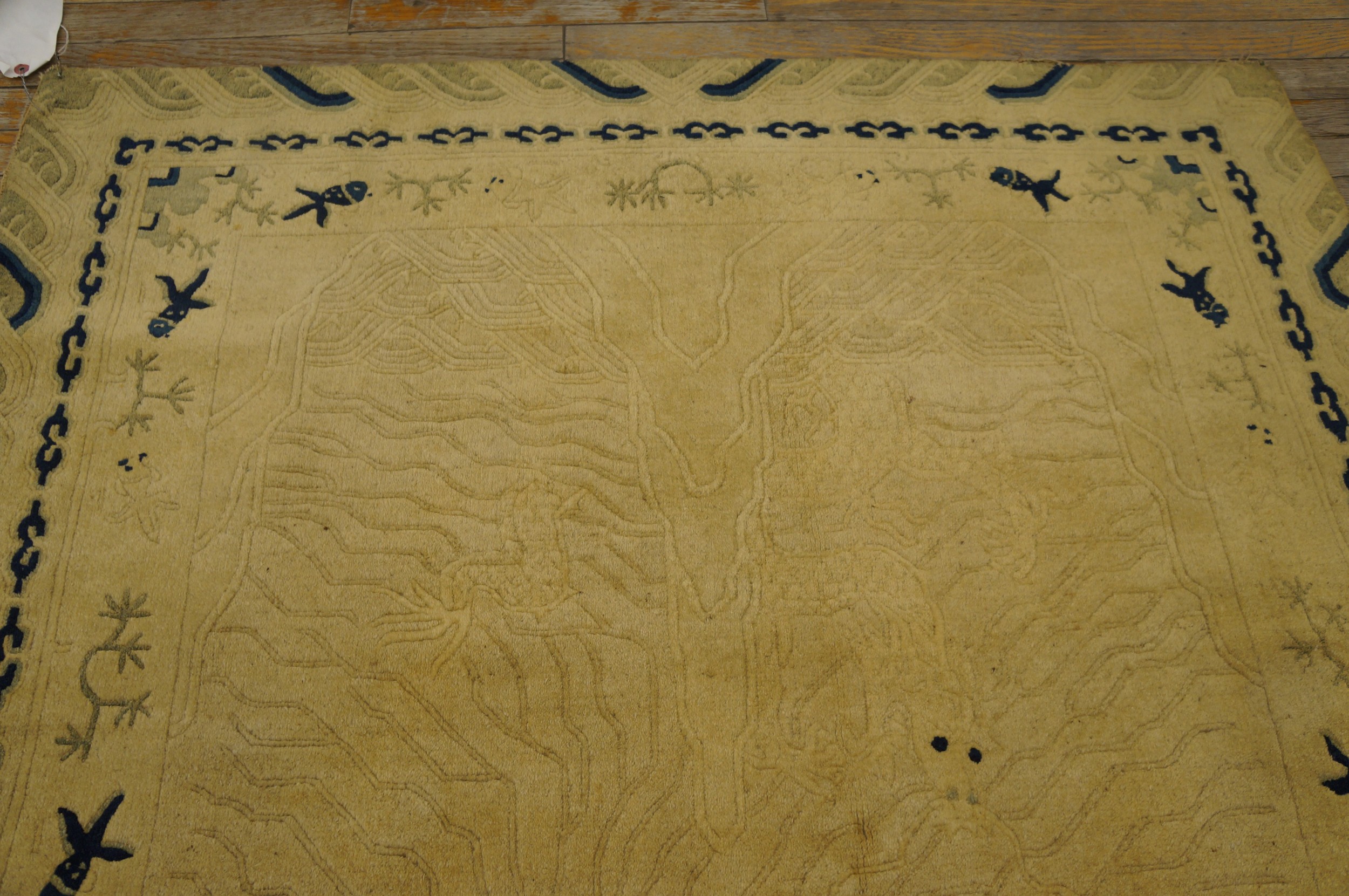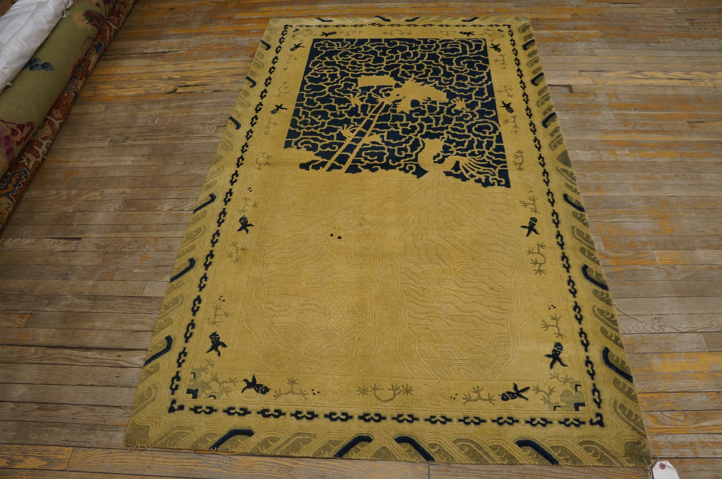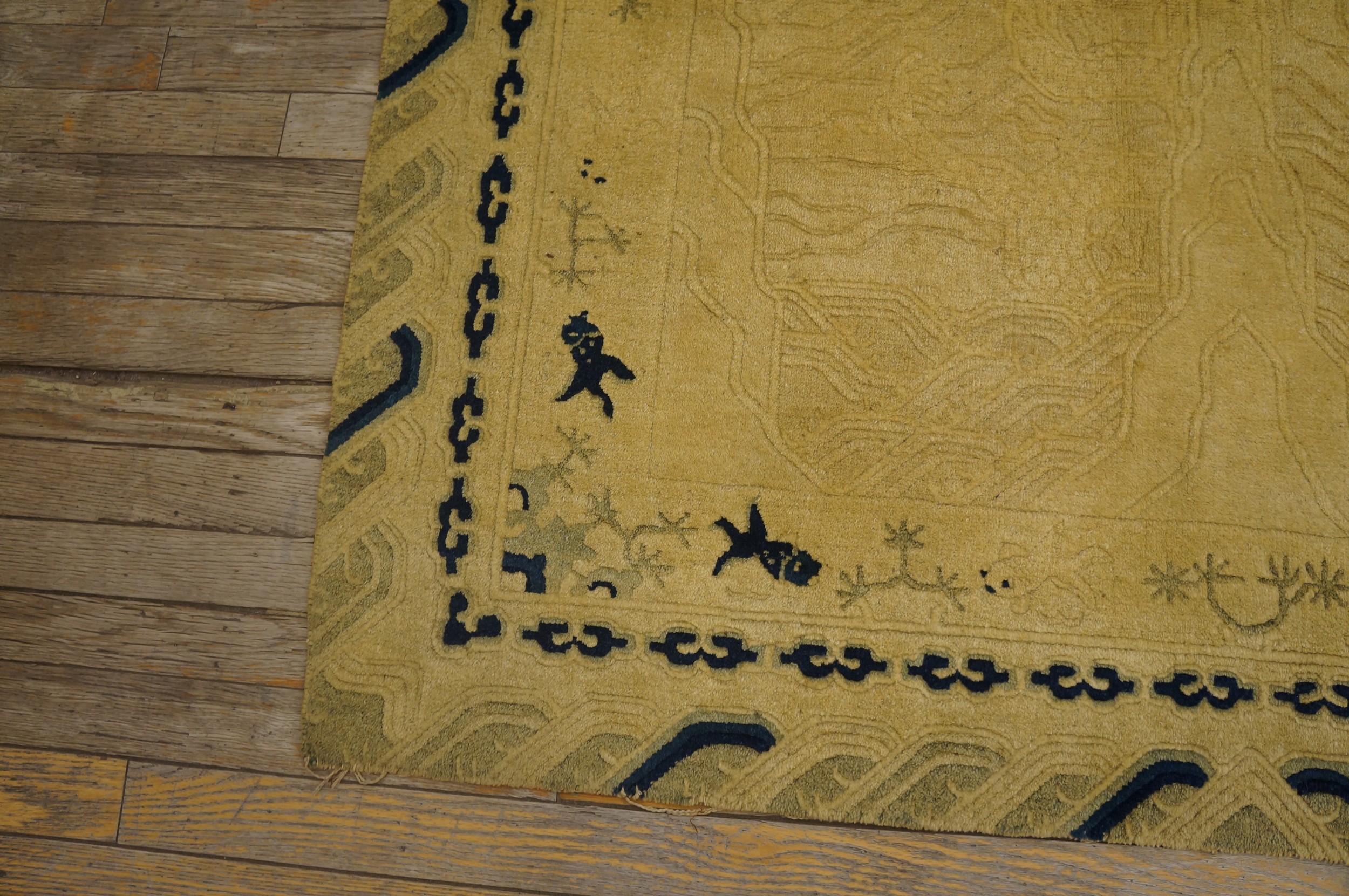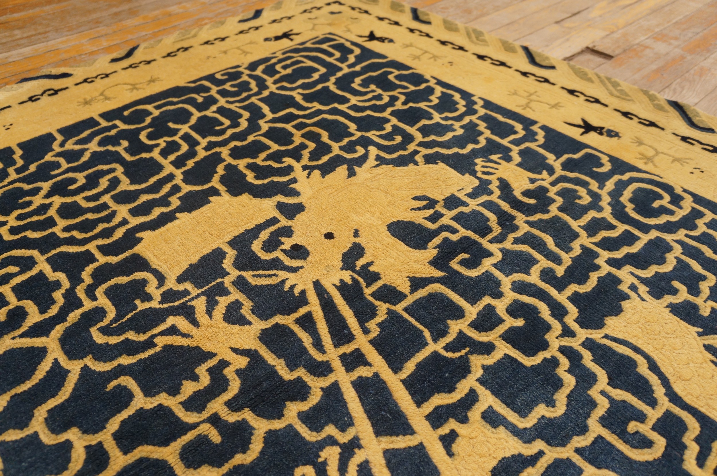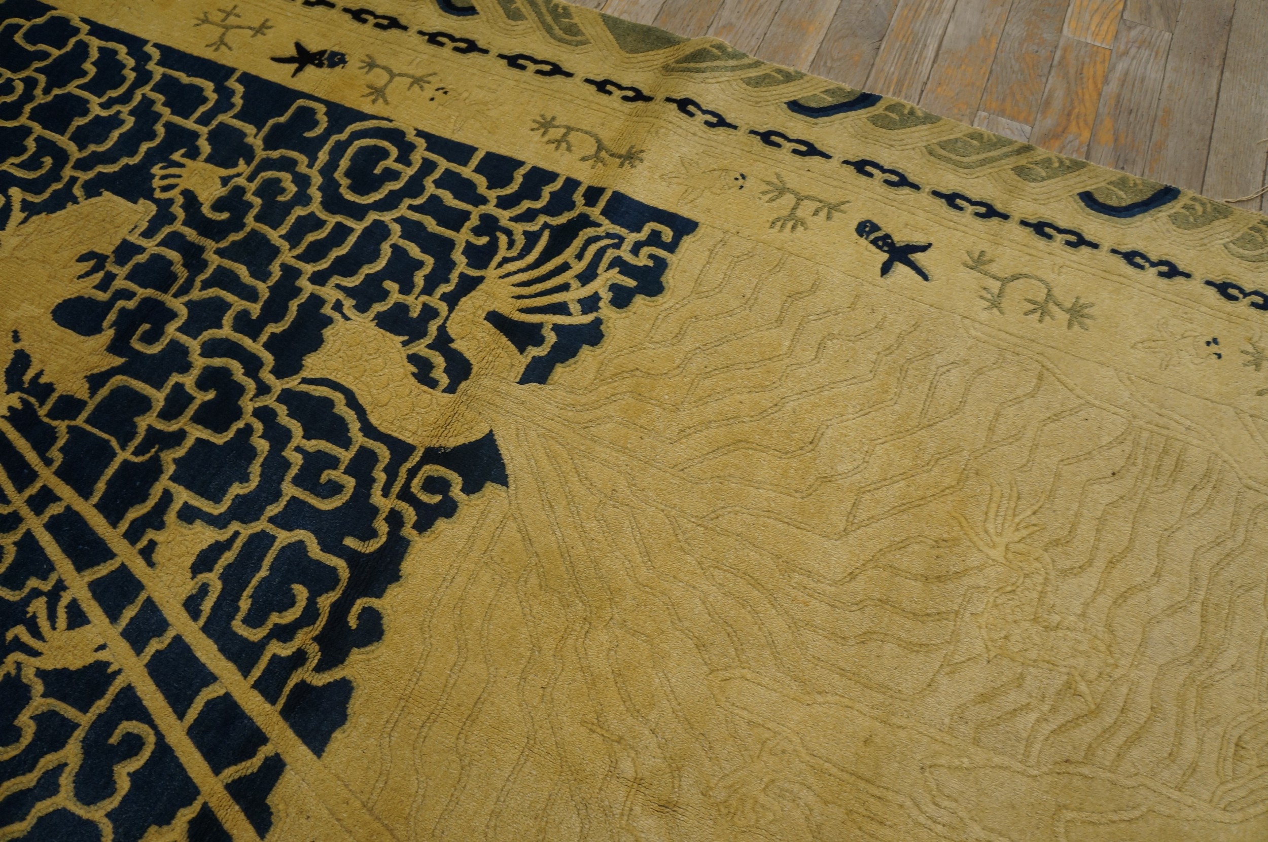 Antique Peking Small Scatter Size Wool Ivory Beige Cream White Rug, Circa Date: 1890s. This exceptional late Qing Dynasty weaving presents a striking narrative composition, utilizing a powerful contrast between the deep indigo field and the luminous golden-beige wool. Its dimensions classify it as one of our highly sought-after small scatter size rugs, ideal for transitional spaces or as a focal point in a compact room.