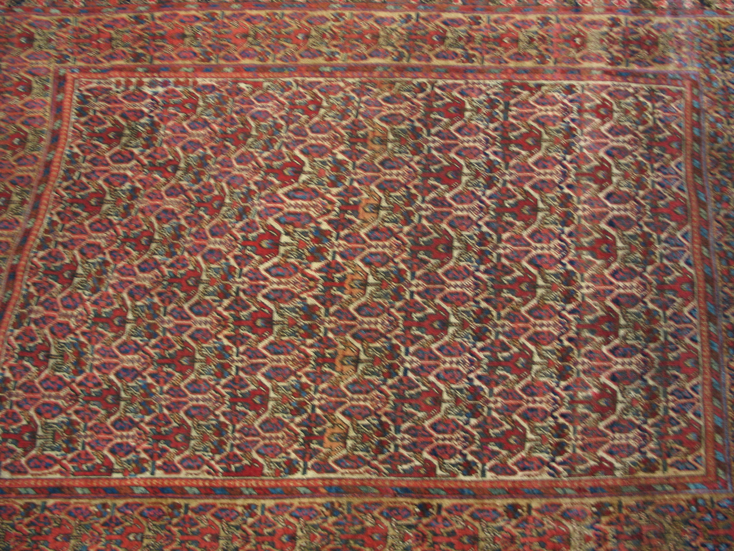 Characteristic of Afshar weaving, the field employs a highly detailed, repeating geometric structure, creating a mesmerizing allover rugs effect. This dense patterning, featuring stylized boteh or animal forms, minimizes negative space and draws the eye across the entire composition, framed by multiple narrow, complementary borders.
