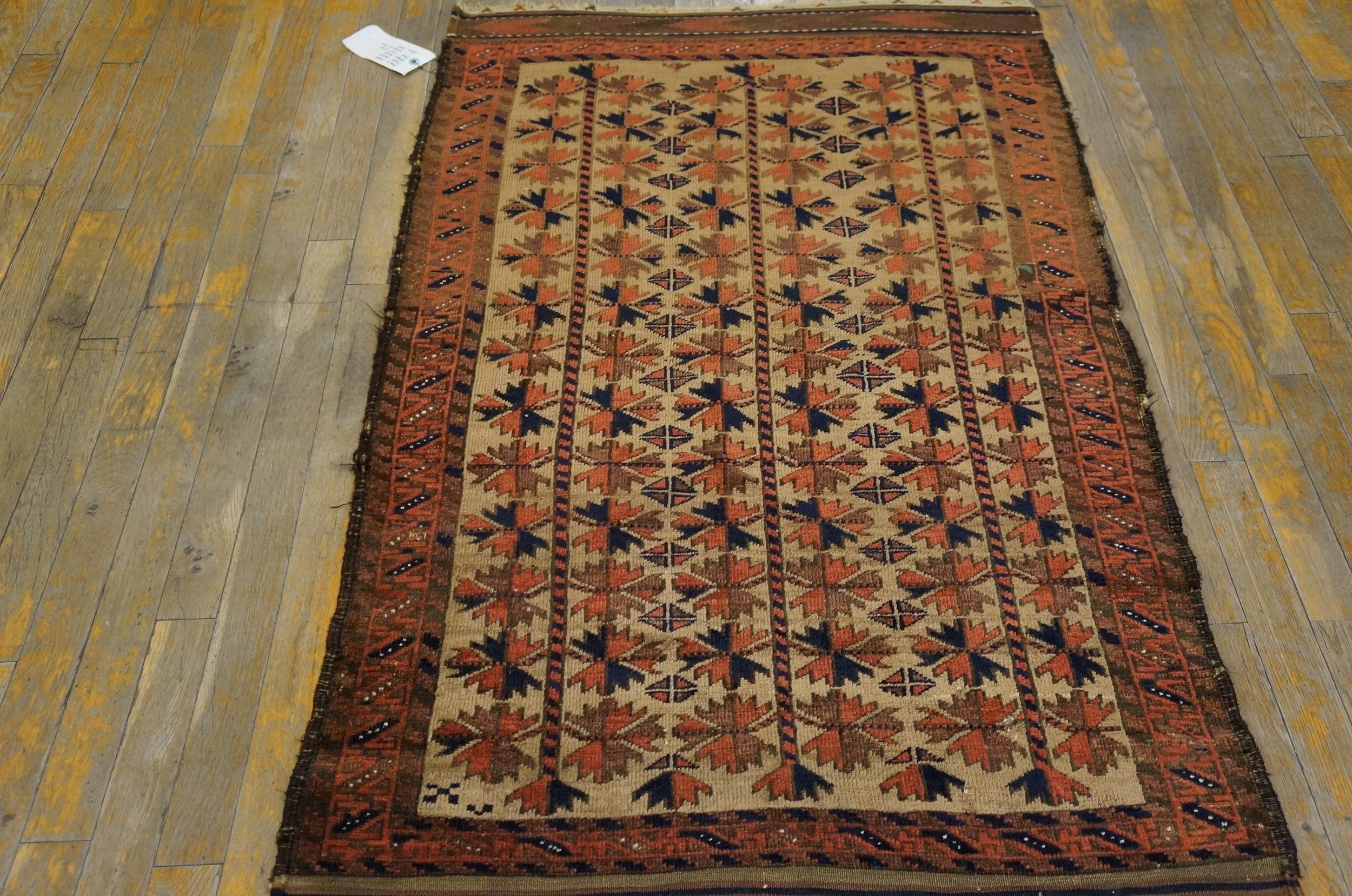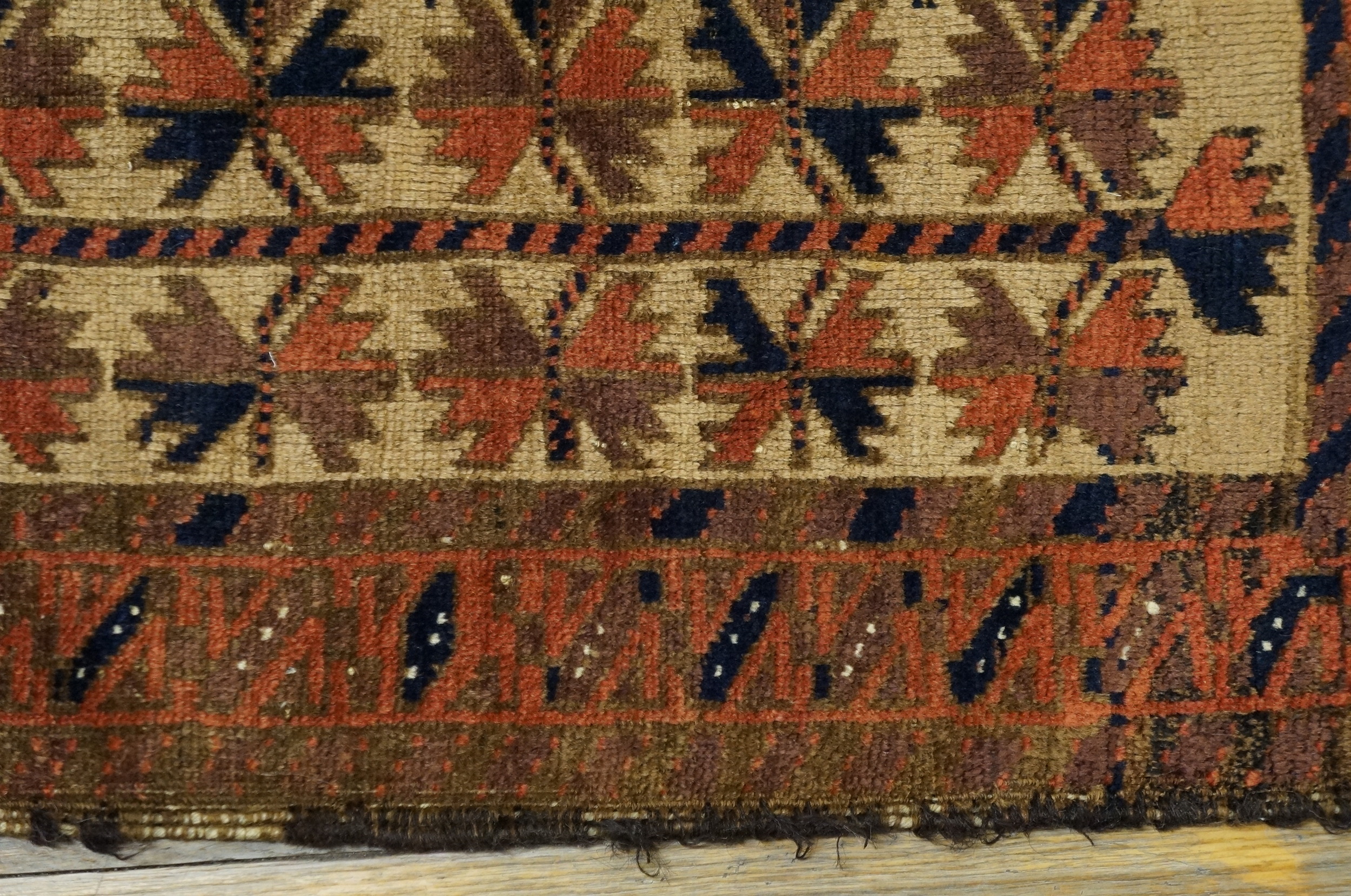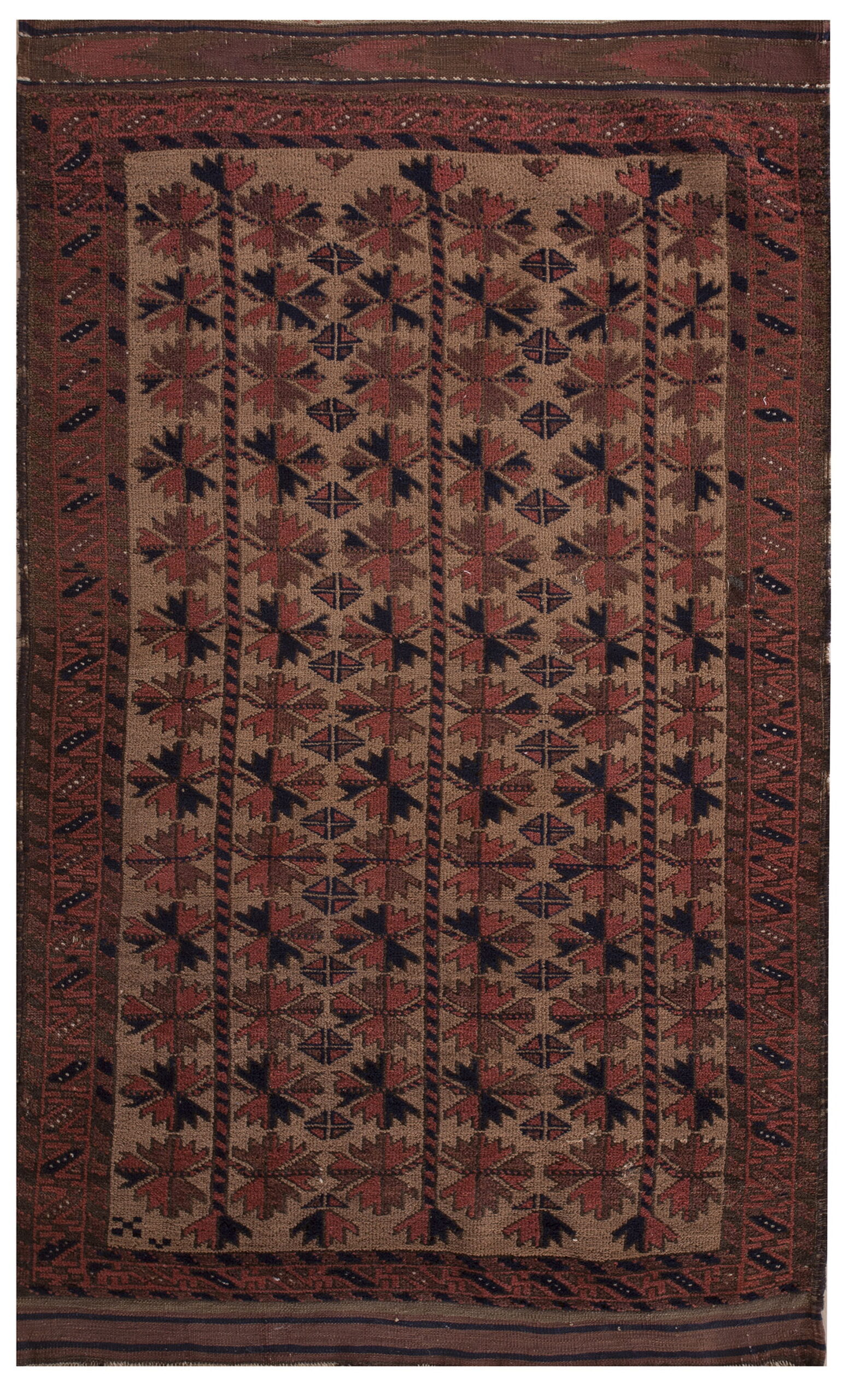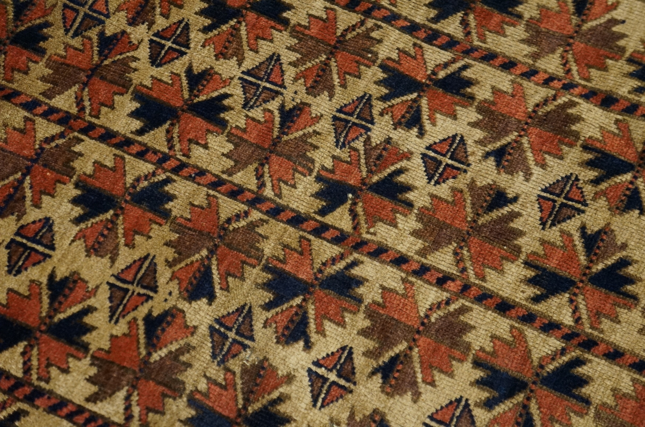 The field presents a highly organized, repeating geometric design, characteristic of an allover pattern favored by tribal weavers. Symmetrical star-like medallions, rendered in deep madder reds, rust, and navy blue, are set against a warm, camel-toned ground, creating a dynamic yet grounded visual rhythm.