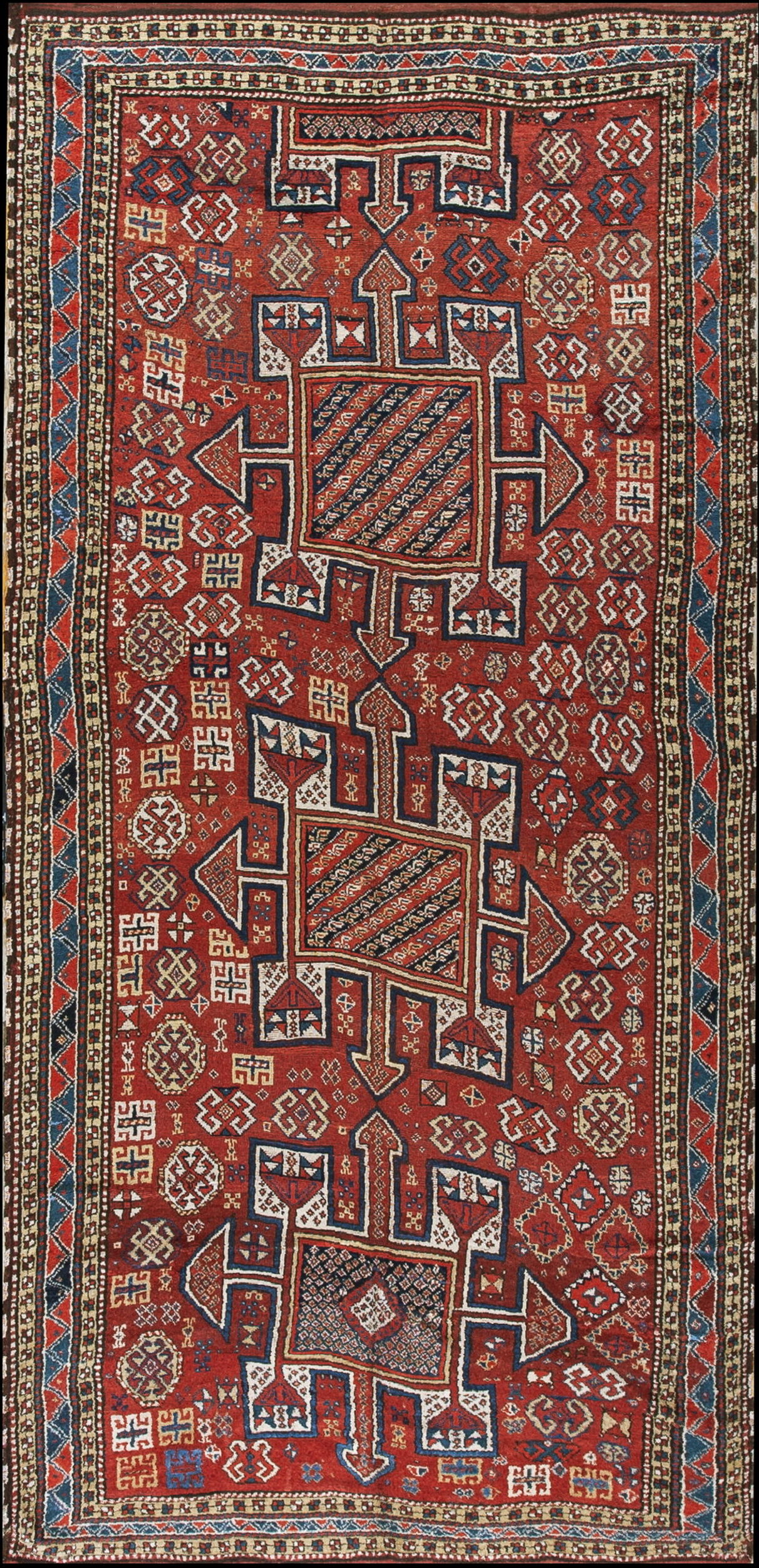 The design structure features two prominent, stepped central cartouches filled with dense, diagonal striping and framed by bold, angular outlines. The surrounding field is populated by a constellation of stylized tribal symbols and repeating motifs, confirming its status as a masterful example of geometric rugs from the Khorasan weaving tradition.