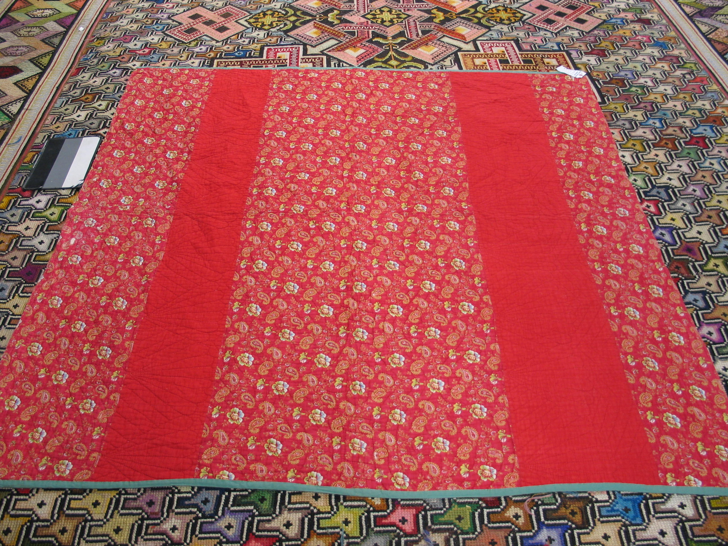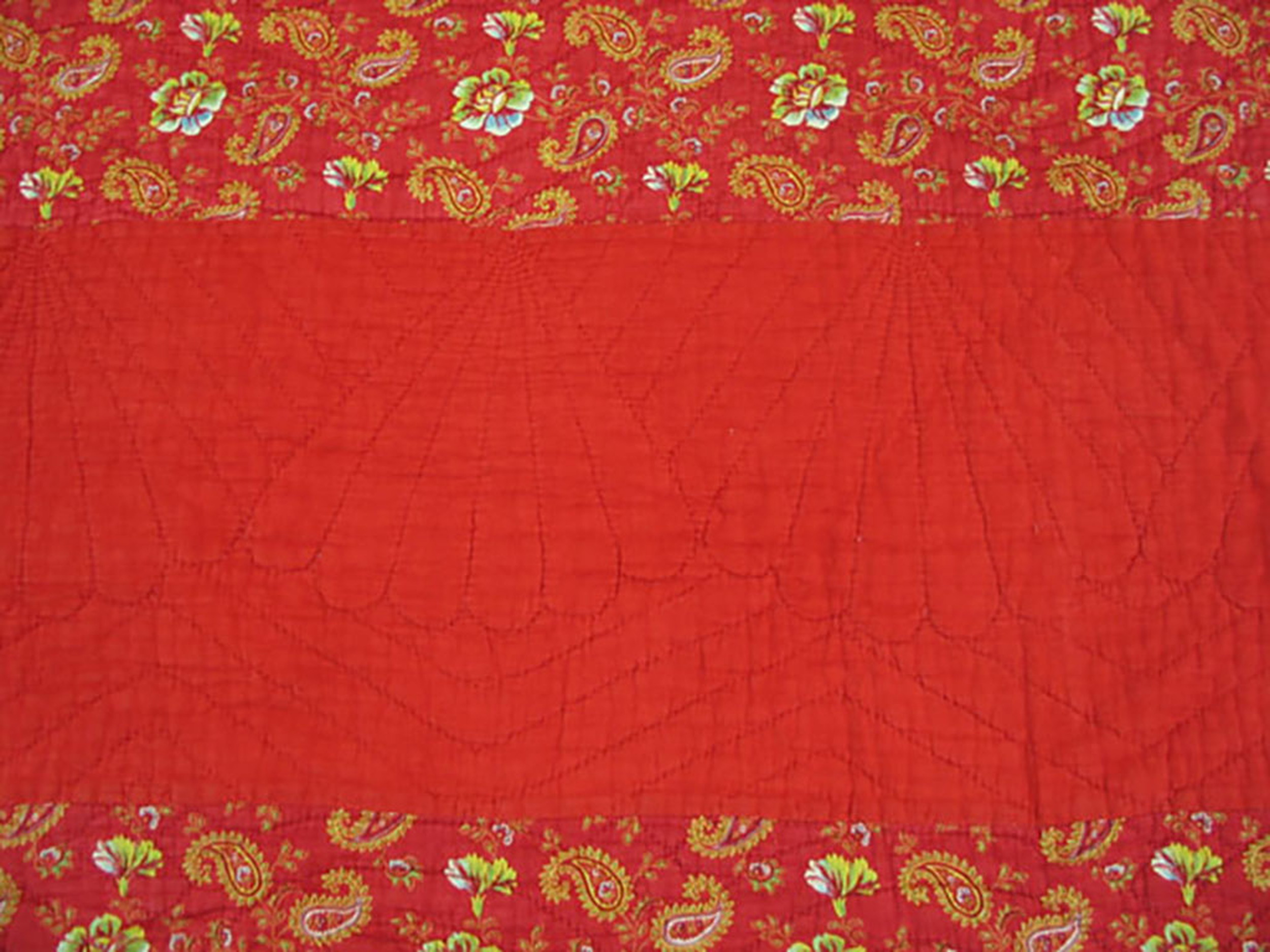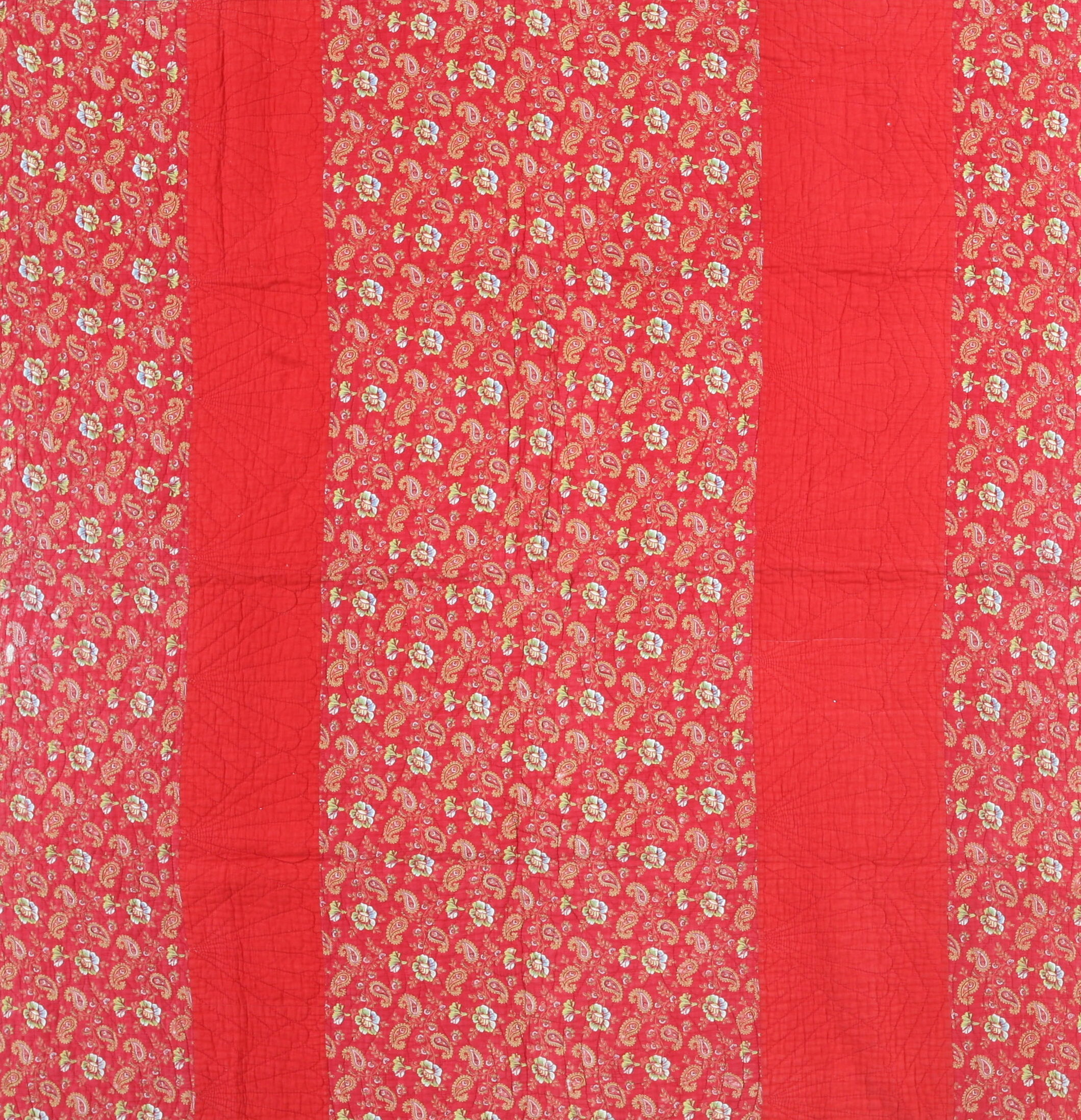 Defined by its saturated red ground, the piece utilizes a rich spectrum of hues in the printed sections, qualifying it as one of the exceptional multicolor jewel tone rugs. The cotton fabric exhibits the soft patina of age, reflecting nearly a century of careful preservation and inherent quality.