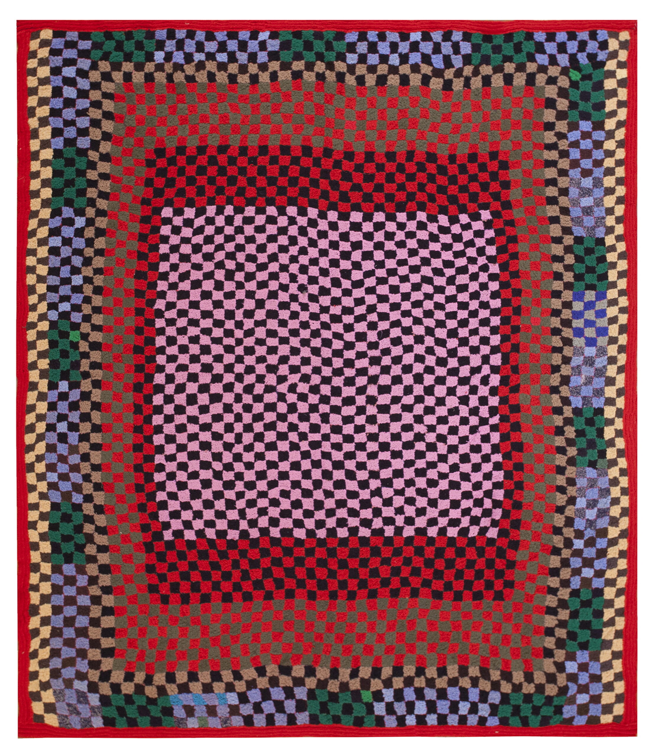 The design employs a striking, concentric square arrangement built from countless small, checkerboard squares. The palette is distinctly robust, featuring deep reds, moss greens, blues, and black, punctuated by a central field of pink and black—a masterful use of multicolor jewel tone hues that define its spirited character.