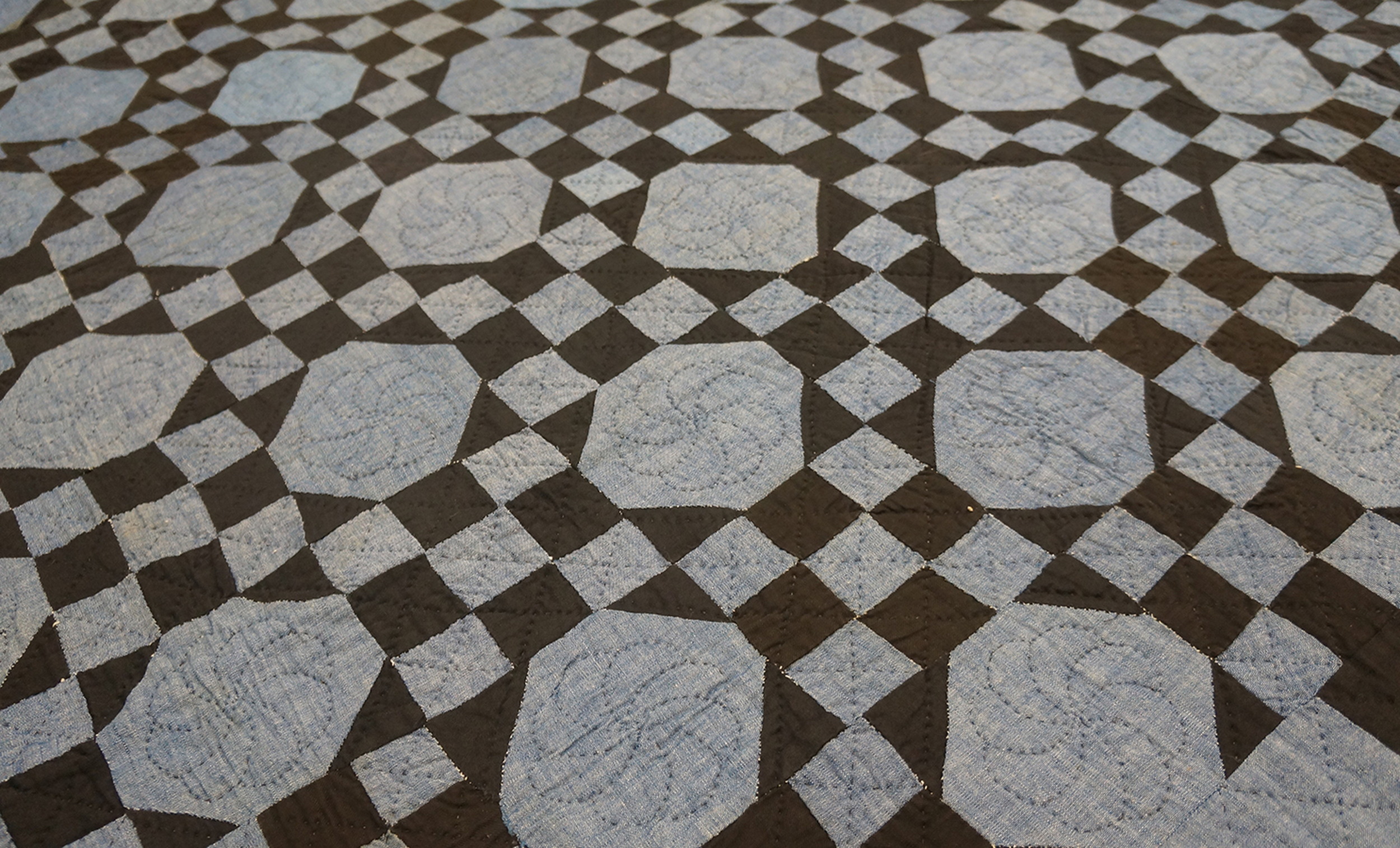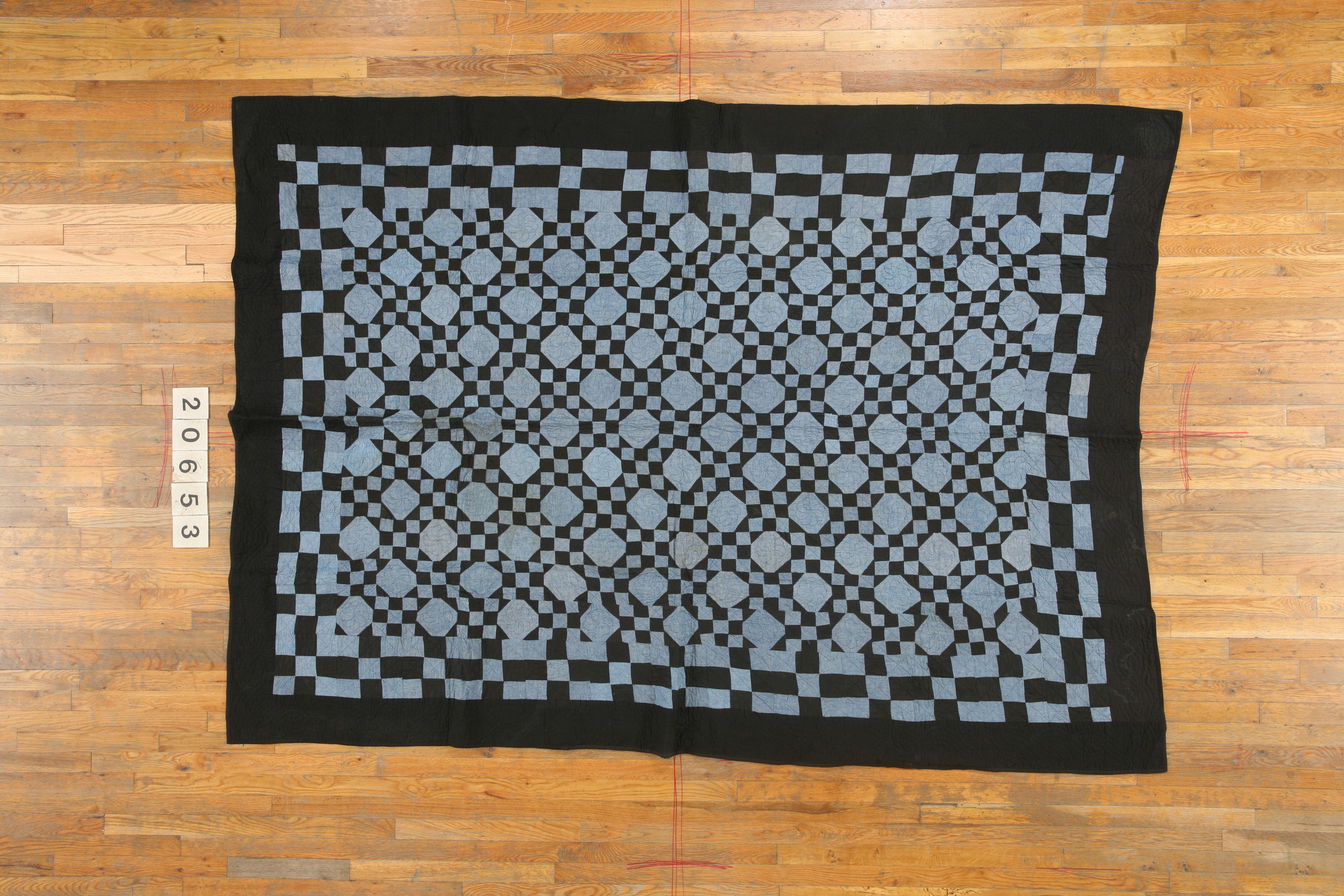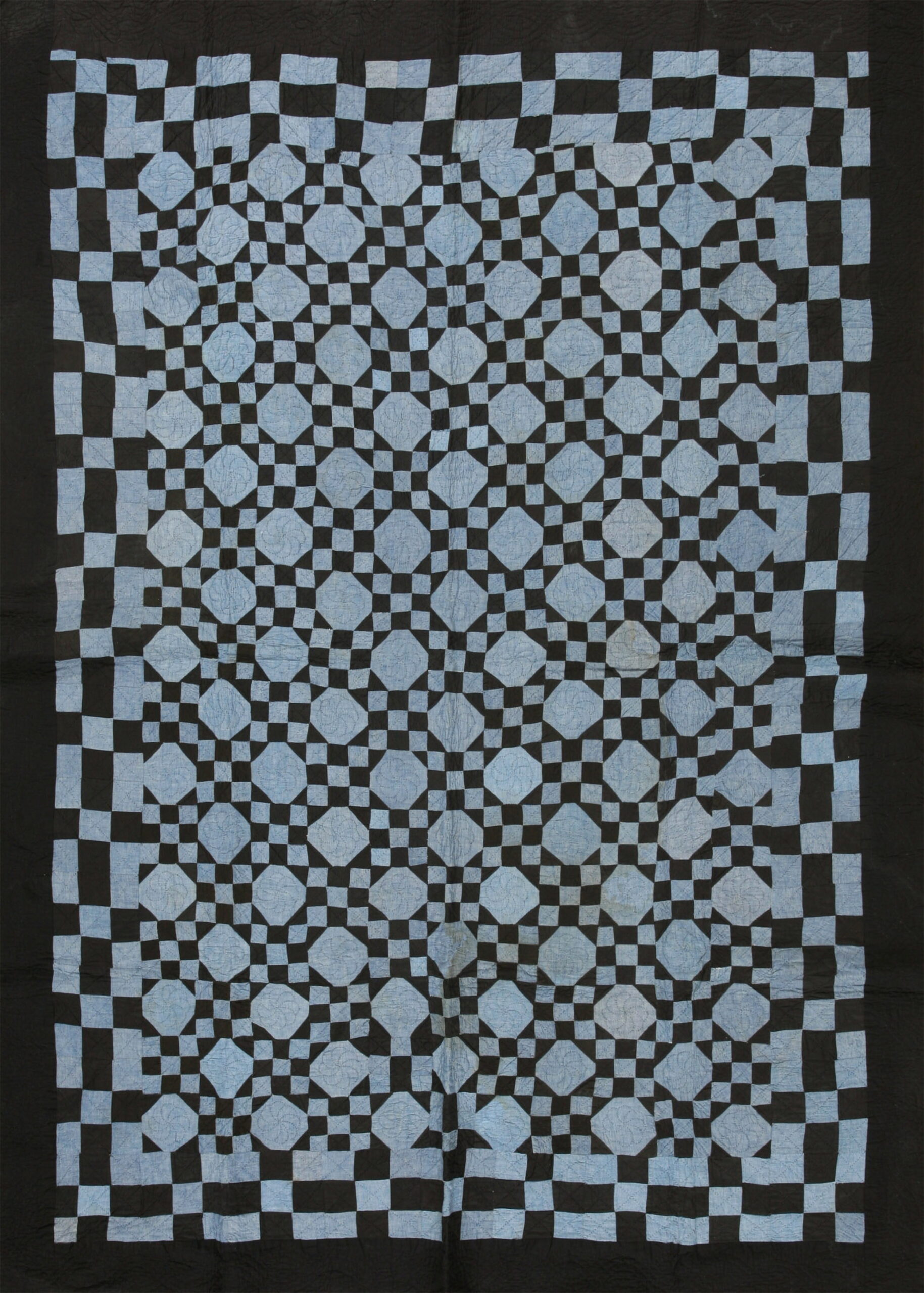 Antique Quilt Hallway Runner Wool Blue Rug, Circa Date: 1920s. This striking textile is a superb example of early 20th-century American folk art translated into the medium of antique rugs. Its distinctive geometric structure, executed in a bold, graphic manner, exemplifies the enduring appeal of the quilt style aesthetic.