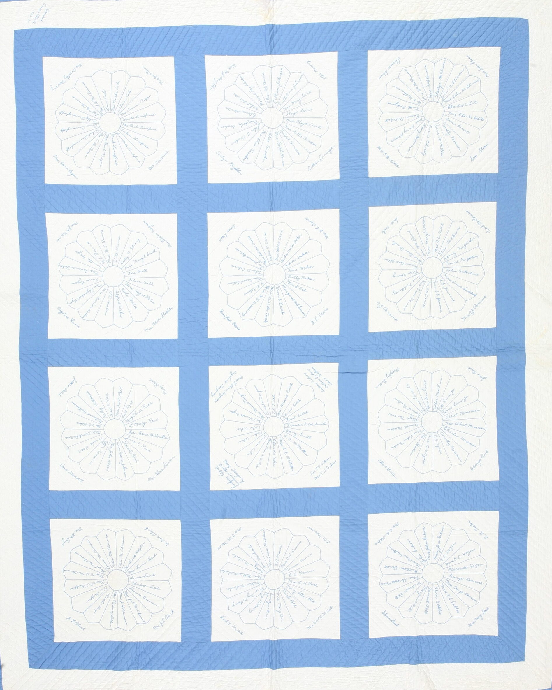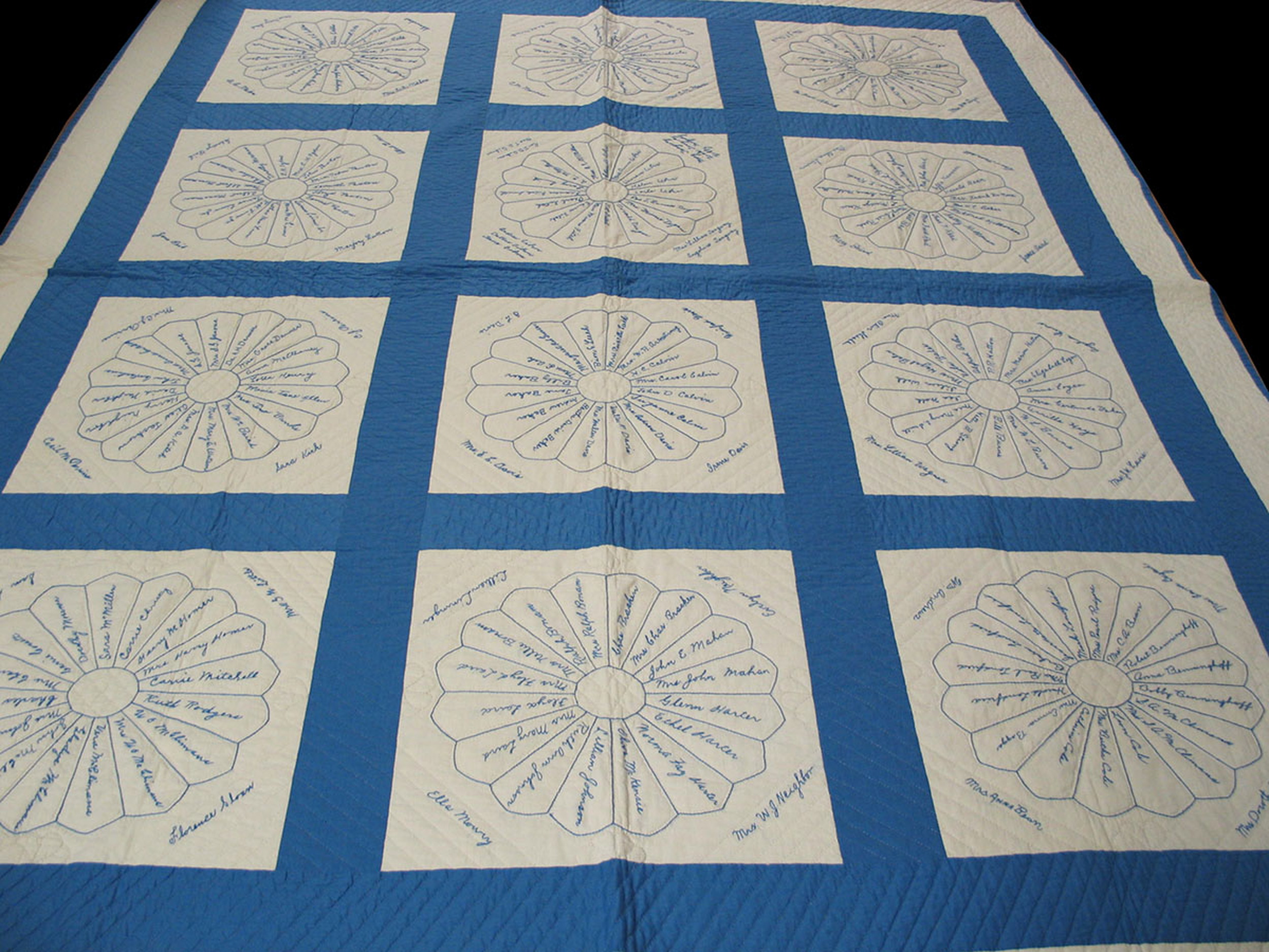 The design features an allover pattern composed of nine distinct, large medallions set within a striking blue frame. Each central ivory square contains delicate, hand-stitched floral outlines, which are then filled with numerous embroidered names, transforming the textile into a historical document of community engagement and shared heritage.