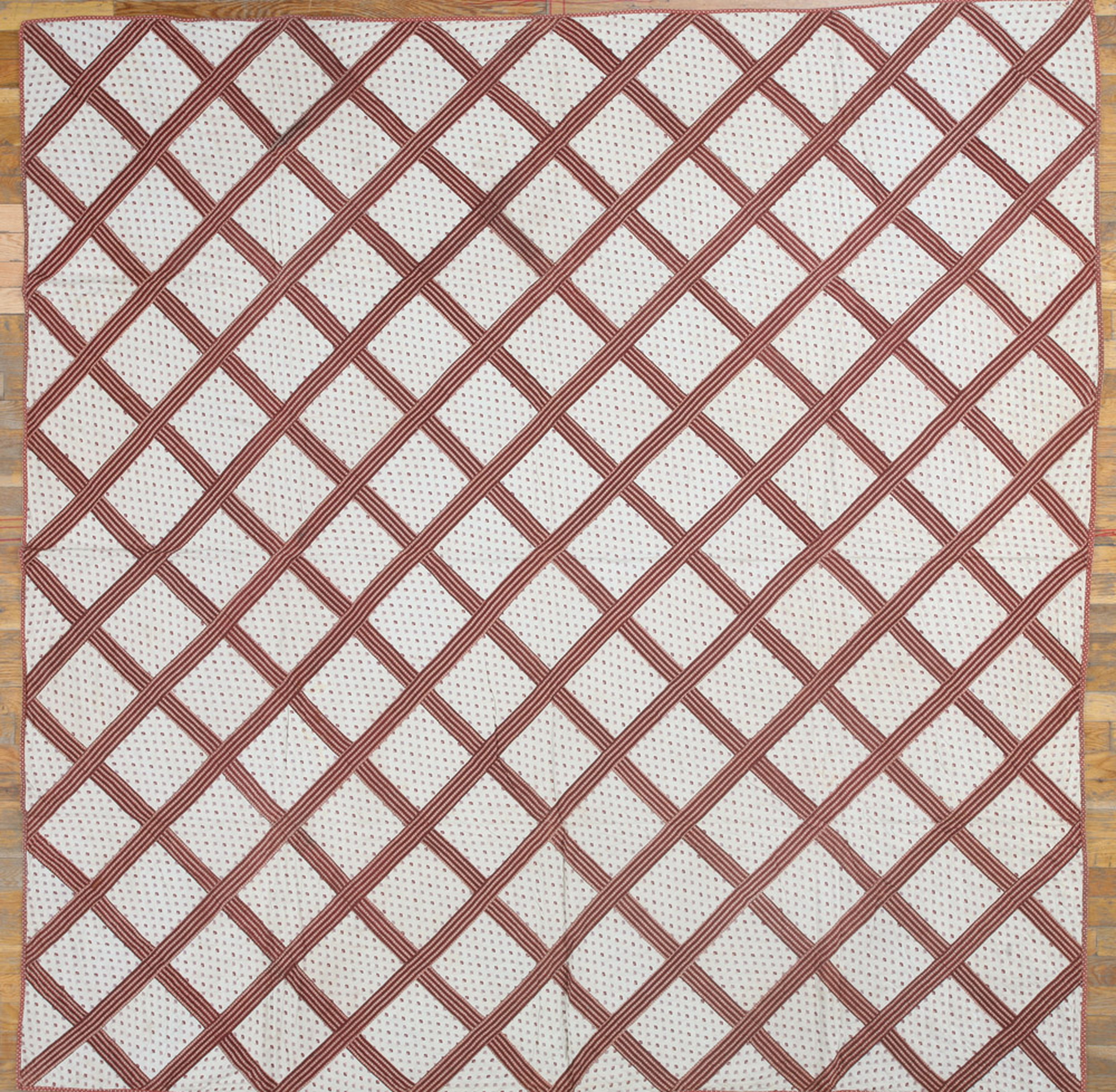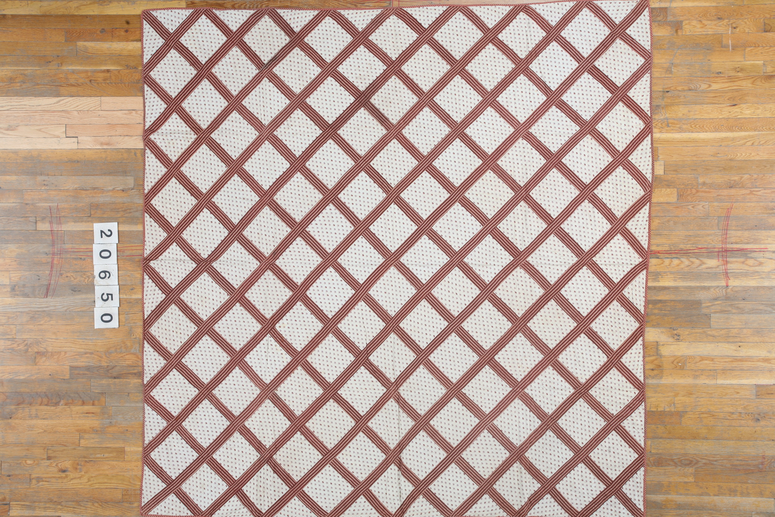 The field is dominated by a striking diagonal trellis, forming large diamond reserves across the entire surface. This highly graphic, allover geometric structure is rendered in rich, striped bands of deep maroon, contrasting sharply against the cream ground. The subtle speckling within the diamonds adds textural depth, reinforcing the overall definition of this multicolor jewel tone palette.
